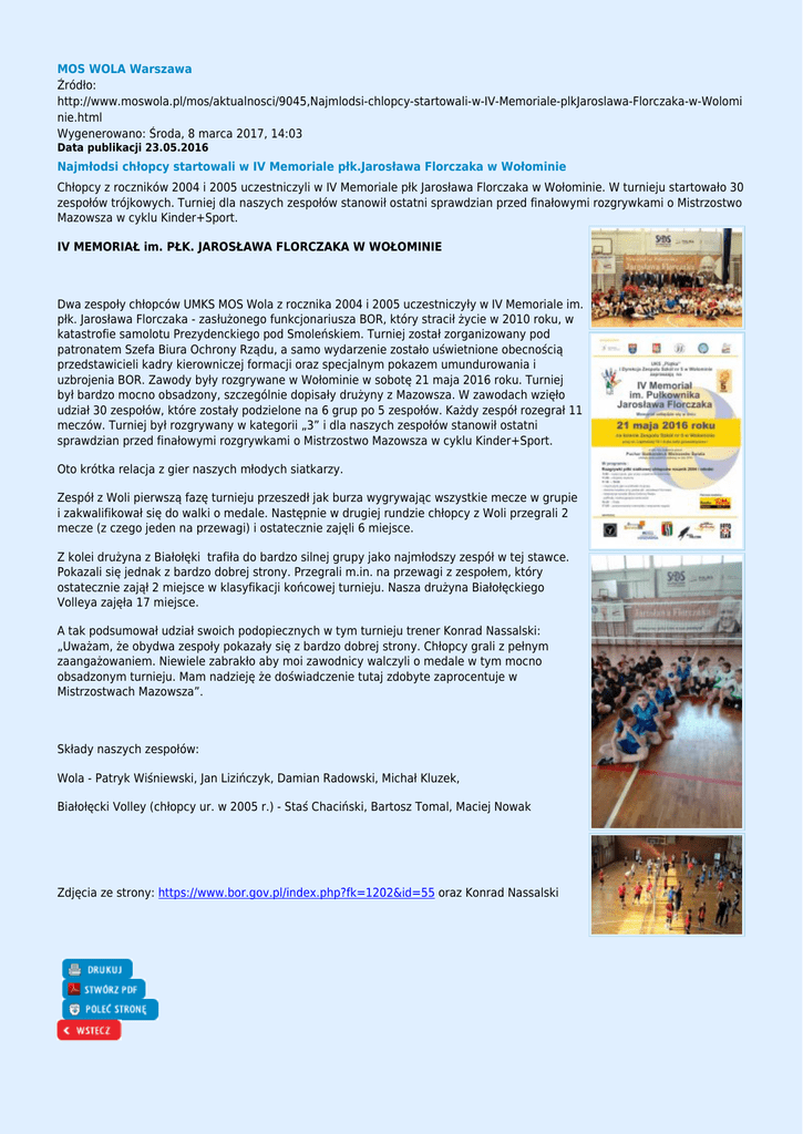 MOS WOLA Warszawa Źródło: http://www.moswola.pl/mos/aktualnosci/9045,Najmlodsi-chlopcy-startowali-w-IV-Memoriale-plkJaroslawa-Florczaka-w-Wolomi nie.html Wygenerowano: Środa, 8 marca 2017, 14:03 Data publikacji 23.05.2016 Najmłodsi chłopcy startowali w IV Memoriale płk.Jarosława Florczaka w Wołominie Chłopcy z roczników 2004 i 2005 uczestniczyli w IV Memoriale płk Jarosława Florczaka w Wołominie. W turnieju startowało 30 zespołów trójkowych. Turniej dla naszych zespołów stanowił ostatni sprawdzian przed finałowymi rozgrywkami o Mistrzostwo Mazowsza w cyklu Kinder+Sport. IV MEMORIAŁ im. PŁK. JAROSŁAWA FLORCZAKA W WOŁOMINIE Dwa zespoły chłopców UMKS MOS Wola z rocznika 2004 i 2005 uczestniczyły w IV Memoriale im. płk. Jarosława Florczaka - zasłużonego funkcjonariusza BOR, który stracił życie w 2010 roku, w katastrofie samolotu Prezydenckiego pod Smoleńskiem. Turniej został zorganizowany pod patronatem Szefa Biura Ochrony Rządu, a samo wydarzenie zostało uświetnione obecnością przedstawicieli kadry kierowniczej formacji oraz specjalnym pokazem umundurowania i uzbrojenia BOR. Zawody były rozgrywane w Wołominie w sobotę 21 maja 2016 roku. Turniej był bardzo mocno obsadzony, szczególnie dopisały drużyny z Mazowsza. W zawodach wzięło udział 30 zespołów, które zostały podzielone na 6 grup po 5 zespołów. Każdy zespół rozegrał 11 meczów. Turniej był rozgrywany w kategorii „3” i dla naszych zespołów stanowił ostatni sprawdzian przed finałowymi rozgrywkami o Mistrzostwo Mazowsza w cyklu Kinder+Sport. Oto krótka relacja z gier naszych młodych siatkarzy. Zespół z Woli pierwszą fazę turnieju przeszedł jak burza wygrywając wszystkie mecze w grupie i zakwalifikował się do walki o medale. Następnie w drugiej rundzie chłopcy z Woli przegrali 2 mecze (z czego jeden na przewagi) i ostatecznie zajęli 6 miejsce. Z kolei drużyna z Białołęki trafiła do bardzo silnej grupy jako najmłodszy zespół w tej stawce. Pokazali się jednak z bardzo dobrej strony. Przegrali m.in. na przewagi z zespołem, który ostatecznie zajął 2 miejsce w klasyfikacji końcowej turnieju. Nasza drużyna Białołęckiego Volleya zajęła 17 miejsce. A tak podsumował udział swoich podopiecznych w tym turnieju trener Konrad Nassalski: „Uważam, że obydwa zespoły pokazały się z bardzo dobrej strony. Chłopcy grali z pełnym zaangażowaniem. Niewiele zabrakło aby moi zawodnicy walczyli o medale w tym mocno obsadzonym turnieju. Mam nadzieję że doświadczenie tutaj zdobyte zaprocentuje w Mistrzostwach Mazowsza”. Składy naszych zespołów: Wola - Patryk Wiśniewski, Jan Lizińczyk, Damian Radowski, Michał Kluzek, Białołęcki Volley (chłopcy ur. w 2005 r.) - Staś Chaciński, Bartosz Tomal, Maciej Nowak Zdjęcia ze strony: https://www.bor.gov.pl/index.php?fk=1202&id=55 oraz Konrad Nassalski Komentarz (0) dodaj komentarz Brak komentarzy dodaj komentarz