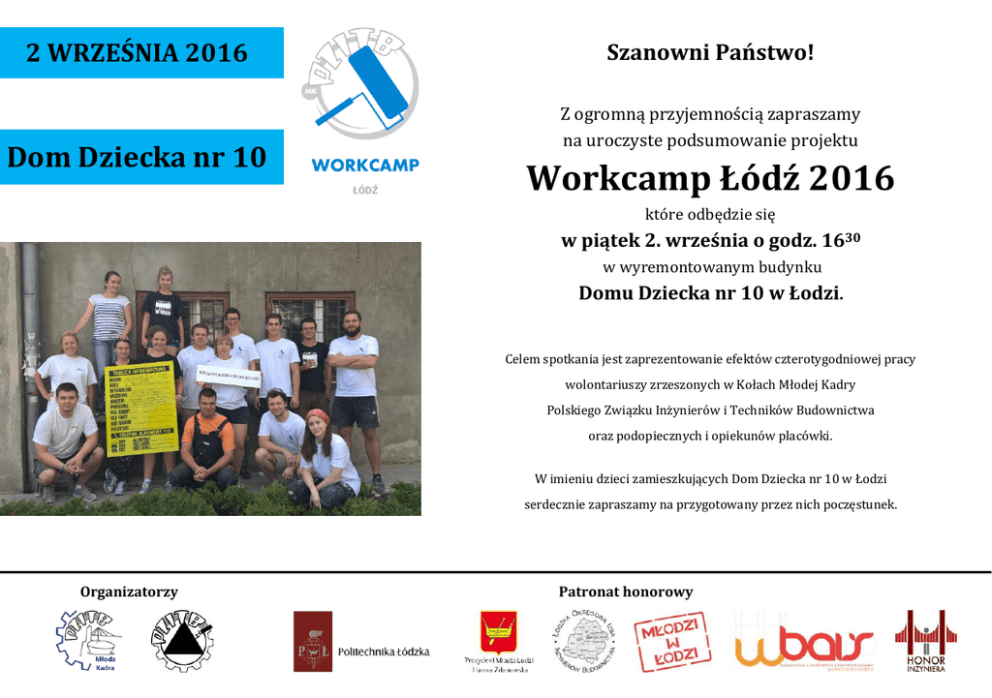 2 WRZEŚNIA 2016 Dom Dziecka nr 10 Szanowni Państwo! Z ogromną przyjemnością zapraszamy na uroczyste podsumowanie projektu Workcamp Łódź 2016 które odbędzie się w piątek 2. września o godz. 1630 w wyremontowanym budynku Domu Dziecka nr 10 w Łodzi. Celem spotkania jest zaprezentowanie efektów czterotygodniowej pracy wolontariuszy zrzeszonych w Kołach Młodej Kadry Polskiego Związku Inżynierów i Techników Budownictwa oraz podopiecznych i opiekunów placówki. W imieniu dzieci zamieszkujących Dom Dziecka nr 10 w Łodzi serdecznie zapraszamy na przygotowany przez nich poczęstunek. Organizatorzy Patronat honorowy