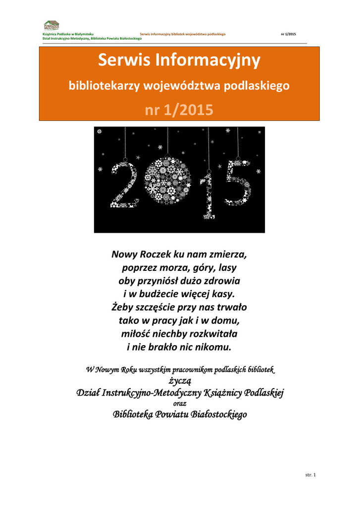 Książnica Podlaska w Białymstoku Serwis Informacyjny bibliotek województwa podlaskiego Dział Instrukcyjno-Metodyczny, Biblioteka Powiatu Białostockiego nr 1/2015 Serwis Informacyjny bibliotekarzy województwa podlaskiego nr 1/2015 Nowy Roczek ku nam zmierza, poprzez morza, góry, lasy oby przyniósł dużo zdrowia i w budżecie więcej kasy. Żeby szczęście przy nas trwało tako w pracy jak i w domu, miłość niechby rozkwitała i nie brakło nic nikomu. W Nowym Roku wszystkim pracownikom podlaskich bibliotek życzą Dział Instrukcyjno-Metodyczny Książnicy Podlaskiej oraz Biblioteka Powiatu Białostockiego str. 1 Książnica Podlaska w Białymstoku Serwis Informacyjny bibliotek województwa podlaskiego Dział Instrukcyjno-Metodyczny, Biblioteka Powiatu Białostockiego nr 1/2015 Wiadomości bieżące Patroni roku 2015 Patronami 2015 roku będą Jan Paweł II i Jan Długosz. Przypada bowiem wówczas dziesiąta rocznica śmierci papieża i 600. rocznica urodzin kronikarza. Rok 2015 będzie też Rokiem Teatru Publicznego z okazji 250. rocznicy powstania najstarszego w Polsce Teatru Narodowego w Warszawie. Taki zestaw patronów ogłosił Sejm. Trwa projekt Chodź człowieku, coś Ci powiem (E. Stachura). Projekt realizowany jest od listopada 2014 do marca 2015 roku. Jego celem jest aktywizacja młodzieży gimnazjalnej z terenu powiatu białostockiego poprzez warsztaty recytatorskie oraz konkursy: literackie i recytatorskie. Wnioskodawcą projektu złożonego do Lokalnej Grupy Działania Puszcza Knyszyńska jest Miejska Biblioteka Publiczna w Wasilkowie, a partnerami w jego realizacji są: Książnica Podlaska im. Łukasza Górnickiego w Białymstoku (Biblioteka Powiatu Białostockiego) przy udziale 12 bibliotek gminnych powiatu białostockiego, Wojewódzki Ośrodek Animacji Kultury w Białymstoku oraz Gimnazjum im. Ks. W. Rabczyńskiego w Wasilkowie. Tablety w Twojej bibliotece Projekt jest częścią Programu Rozwoju Bibliotek. Fundacja Rozwoju Społeczeństwa Informacyjnego wyposaży w tysiąc tabletów biblioteki, które zostaną wyłonione w konkursie. Dodatkowo FRSI udostępni bibliotekom pakiet edukacyjny: aplikacje wraz z instruktażem i scenariuszami zajęć, szkolenia online (webinaria) oraz kurs iTunesU dostępny na tablecie. Do projektu „Tablety w Twojej bibliotece” może zgłosić się każda biblioteka, która brała udział w Programie Rozwoju Bibliotek lub jest częścią sieci LABiB. Zgłoszenia w konkursie dla uczestników projektu przyjmujemy do 23 stycznia 2015 r. Szczegóły na stronie internetowej: http://www.biblioteki.org/pl/wiadomosci/czytaj/3298 str. 2 Książnica Podlaska w Białymstoku Serwis Informacyjny bibliotek województwa podlaskiego Dział Instrukcyjno-Metodyczny, Biblioteka Powiatu Białostockiego nr 1/2015 Deskryptory Biblioteki Narodowej – planowana zmiana w sposobie opracowania rzeczowego W roku 2014 Biblioteka Narodowa rozpoczęła prace nad koncepcją nowego narzędzia opracowania rzeczowego dokumentów (Deskryptory BN), które pozwoli na wygodne dla bibliotekarzy i przyjazne dla użytkowników wyszukiwanie fasetowe w katalogach bibliotecznych. Sukcesem zakończył się pierwszy etap wstępnych prac nad koncepcją deskryptorów BN. W pierwszym kwartale 2015 r. Biblioteka Narodowa planuje zorganizowanie otwartego seminarium, na którym będą przedstawione założenia powyższych zmian, a także koncepcja wdrożenia DBN i narzędzia wsparcia dla bibliotek współpracujących, aby nie musiały one ponosić kosztów zmiany. Przy budowie Kartoteki Deskryptorów BN planowane jest wykorzystanie zasobu leksykalnego JHP BN. Zachęcamy do udziału w tym seminarium, którego znaczną część stanowić będzie dyskusja. Czytaj również: http://fabryka-jezyka.bn.org.pl/?p=2161# Biblioteki przyjazne sztabom WOŚP Fundacja Wielkiej Orkiestry Świątecznej Pomocy i Fundacja Rozwoju Społeczeństwa Informacyjnego już po raz drugi organizują akcję Biblioteki to miejsca przyjazne sztabom WOŚP. Zachęcamy do zgłaszania udziału w akcji - można to zrobić na stronie www.wosp2015.biblioteki.org.pl. Zgłoszone biblioteki zostaną zaznaczone na mapie bibliotek przyjaznych sztabom WOŚP - będzie to sygnał dla lokalnych sztabów, że mogą liczyć na Waszą pomoc! Informacja również: http://www.biblioteki.org/pl/biblioteki_przyjazne_sztabom_wosp/o_akcji Nowoczesność w praktyce – ruszył system ACADEMICA W czwartek, 18 grudnia 2014 r. prof. Małgorzata Omilanowska, Minister Kultury i Dziedzictwa Narodowego wspólnie z dr. Tomaszem Makowskim, dyrektorem Biblioteki Narodowej zainaugurowali projekt ACADEMICA – innowacyjny system elektronicznych wypożyczeń, umożliwiający bezpłatny dostęp do setek tysięcy publikacji naukowych z każdej str. 3 Książnica Podlaska w Białymstoku Serwis Informacyjny bibliotek województwa podlaskiego Dział Instrukcyjno-Metodyczny, Biblioteka Powiatu Białostockiego biblioteki w Polsce. Więcej informacji: nr 1/2015 http://www.bn.org.pl/aktualnosci/822- nowoczesnosc-w-praktyce-%E2%80%93-ruszyl-system-academica.html. Strona Projektu: www.academica.edu.pl Zapowiedź konkursu powiatowego Biblioteka Publiczna Powiatu Białostockiego zaplanowała kolejny konkurs powiatowy Literackie kwiaty powiatu białostockiego. Skierowany jest on do bibliotek publicznych powiatu białostockiego oraz ich partnerów zawodowych. Inspiracje Bibliofilm czyli biblioteka w filmie, film w bibliotece – http://www.sbp.pl/bibliofilm Projekt powstał, aby pomóc bibliotekarzom, nauczycielom i animatorom rozwinąć potencjał drzemiący w wątkach filmowych i przyciągnąć młodych odbiorców do bibliotek. Na stronie projektu znajdziemy m.in. gotowe scenariusze zajęć z edukacji filmowej Wyświetlaj filmy w bibliotece - legalnie! Na stronie znajdziemy informacje o tzw. Parasolu Licencyjnym® MPLC. Dzięki niemu biblioteki mogą za niewielką opłatą rozszerzyć swoją ofertę kulturalną o pokazy filmowe http://www.sbp.pl/dla_biblioteka