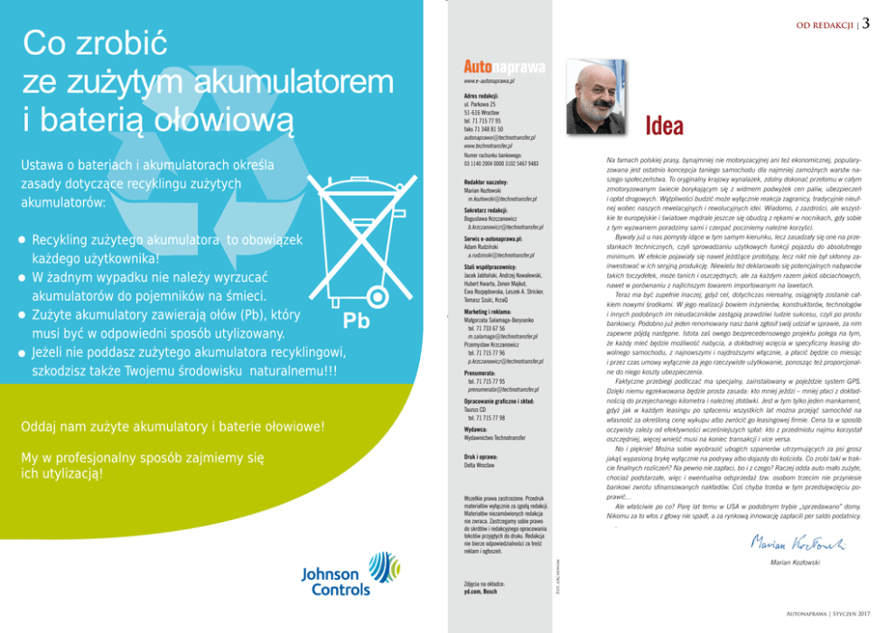 OD REDAKCJI | 3 Autonaprawa www.e-autonaprawa.pl Adres redakcji: ul. Parkowa 25 51-616 Wrocław tel. 71 715 77 95 faks 71 348 81 50 [email protected] www.technotransfer.pl Idea Numer rachunku bankowego: 03 1140 2004 0000 3102 5467 9483 Na łamach polskiej prasy, bynajmniej nie motoryzacyjnej ani też ekonomicznej, populary zowana jest ostatnio koncepcja taniego samochodu dla najmniej zamożnych warstw na szego społeczeństwa. To oryginalny krajowy wynalazek, zdolny dokonać przełomu w całym zmotoryzowanym świecie borykającym się z widmem podwyżek cen paliw, ubezpieczeń i opłat drogowych. Wątpliwości budzić może wyłącznie reakcja zagranicy, tradycyjnie nieuf nej wobec naszych rewelacyjnych i rewolucyjnych idei. Wiadomo, z zazdrości, ale wszyst kie te europejskie i światowe mądrale jeszcze się obudzą z rękami w nocnikach, gdy sobie z tym wyzwaniem poradzimy sami i czerpać poczniemy należne korzyści. Bywały już u nas pomysły idące w tym samym kierunku, lecz zasadzały się one na prze słankach technicznych, czyli sprowadzaniu użytkowych funkcji pojazdu do absolutnego minimum. W efekcie pojawiały się nawet jeżdżące prototypy, lecz nikt nie był skłonny za inwestować w ich seryjną produkcję. Niewielu też deklarowało się potencjalnych nabywców takich toczydełek, może tanich i oszczędnych, ale za każdym razem jakoś obciachowych, nawet w porównaniu z najlichszym towarem importowanym na lawetach. Teraz ma być zupełnie inaczej, gdyż cel, dotychczas nierealny, osiągnięty zostanie cał kiem nowymi środkami. W jego realizacji bowiem inżynierów, konstruktorów, technologów i innych podobnych im nieudaczników zastąpią prawdziwi ludzie sukcesu, czyli po prostu bankowcy. Podobno już jeden renomowany nasz bank zgłosił swój udział w sprawie, za nim zapewne pójdą następne. Istota zaś owego bezprecedensowego projektu polega na tym, że każdy mieć będzie możliwość nabycia, a dokładniej wzięcia w specyficzny leasing do wolnego samochodu, z najnowszymi i najdroższymi włącznie, a płacić będzie co miesiąc i przez czas umowy wyłącznie za jego rzeczywiste użytkowanie, ponosząc też proporcjonal ne do niego koszty ubezpieczenia. Faktyczne przebiegi podliczać ma specjalny, zainstalowany w pojeździe system GPS. Dzięki niemu egzekwowana będzie prosta zasada: kto mniej jeździ – mniej płaci z dokład nością do przejechanego kilometra i należnej złotówki. Jest w tym tylko jeden mankament, gdyż jak w każdym leasingu po spłaceniu wszystkich lat można przejąć samochód na własność za określoną cenę wykupu albo zwrócić go leasingowej firmie. Cena ta w sposób oczywisty zależy od efektywności wcześniejszych spłat: kto z przedmiotu najmu korzystał oszczędniej, więcej wnieść musi na koniec transakcji i vice versa. No i pięknie! Można sobie wyobrazić ubogich szpanerów utrzymujących za psi grosz jakąś wypasioną brykę wyłącznie na podrywy albo dojazdy do kościoła. Co zrobi taki w trak cie finalnych rozliczeń? Na pewno nie zapłaci, bo i z czego? Raczej odda auto mało zużyte, chociaż podstarzałe, więc i ewentualna odsprzedaż tzw. osobom trzecim nie przyniesie bankowi zwrotu sfinansowanych nakładów. Coś chyba trzeba w tym przedsięwzięciu po prawić... Ale właściwie po co? Parę lat temu w USA w podobnym trybie „sprzedawano” domy. Nikomu za to włos z głowy nie spadł, a za rynkową innowację zapłacili per saldo podatnicy. . Redaktor naczelny: Marian Kozłowski [email protected] Sekretarz redakcji: Bogusława Krzczanowicz [email protected] Serwis e-autonaprawa.pl: Adam Rudziński [email protected] Stali współpracownicy: Jacek Jabłoński, Andrzej Kowalewski, Hubert Kwarta, Zenon Majkut, Ewa Rozpędowska, Leszek A. Stricker, Tomasz Szulc, KrzaQ Marketing i reklama: Małgorzata Salamaga-Borysenko tel. 71 733 67 56 [email protected] Przemysław Krzczanowicz tel. 71 715 77 96 [email protected] Prenumerata: tel. 71 715 77 95 [email protected] Opracowanie graficzne i skład: Taurus CD tel. 71 715 77 98 Wydawca: Wydawnictwo Technotransfer Druk i oprawa: Delta Wrocław Zdjęcia na okładce: yd.com, Bosch Fot. archiwum Wszelkie prawa zastrzeżone. Przedruk materiałów wyłącznie za zgodą redakcji. Materiałów niezamówionych redakcja nie zwraca. Zastrzegamy sobie prawo do skrótów i redakcyjnego opracowania tekstów przyjętych do druku. Redakcja nie bierze odpowiedzialności za treść reklam i ogłoszeń. Marian Kozłowski Autonaprawa | Styczeń 2017