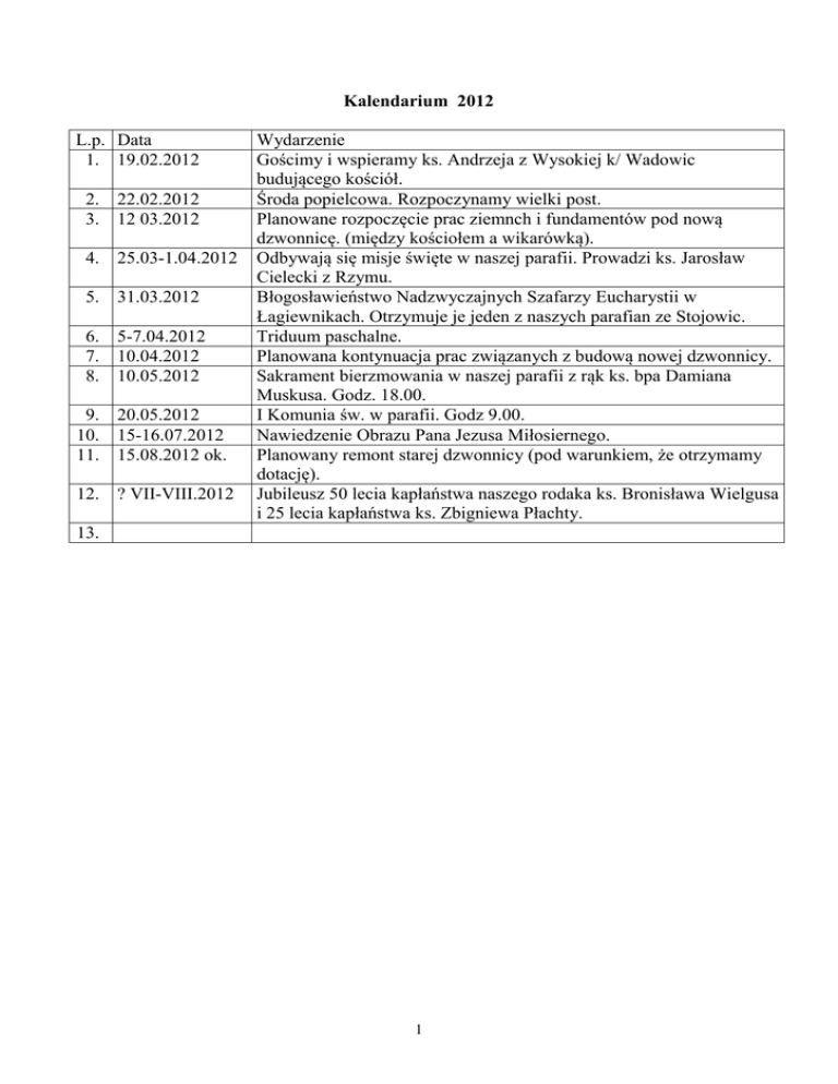 Kalendarium 2012 L.p. Data 1. 19.02.2012 2. 22.02.2012 3. 12 03.2012 4. 25.03-1.04.2012 5. 31.03.2012 6. 5-7.04.2012 7. 10.04.2012 8. 10.05.2012 9. 20.05.2012 10. 15-16.07.2012 11. 15.08.2012 ok. 12. ? VII-VIII.2012 Wydarzenie Gościmy i wspieramy ks. Andrzeja z Wysokiej k/ Wadowic budującego kościół. Środa popielcowa. Rozpoczynamy wielki post. Planowane rozpoczęcie prac ziemnch i fundamentów pod nową dzwonnicę. (między kościołem a wikarówką). Odbywają się misje święte w naszej parafii. Prowadzi ks. Jarosław Cielecki z Rzymu. Błogosławieństwo Nadzwyczajnych Szafarzy Eucharystii w Łagiewnikach. Otrzymuje je jeden z naszych parafian ze Stojowic. Triduum paschalne. Planowana kontynuacja prac związanych z budową nowej dzwonnicy. Sakrament bierzmowania w naszej parafii z rąk ks. bpa Damiana Muskusa. Godz. 18.00. I Komunia św. w parafii. Godz 9.00. Nawiedzenie Obrazu Pana Jezusa Miłosiernego. Planowany remont starej dzwonnicy (pod warunkiem, że otrzymamy dotację). Jubileusz 50 lecia kapłaństwa naszego rodaka ks. Bronisława Wielgusa i 25 lecia kapłaństwa ks. Zbigniewa Płachty. 13. 1