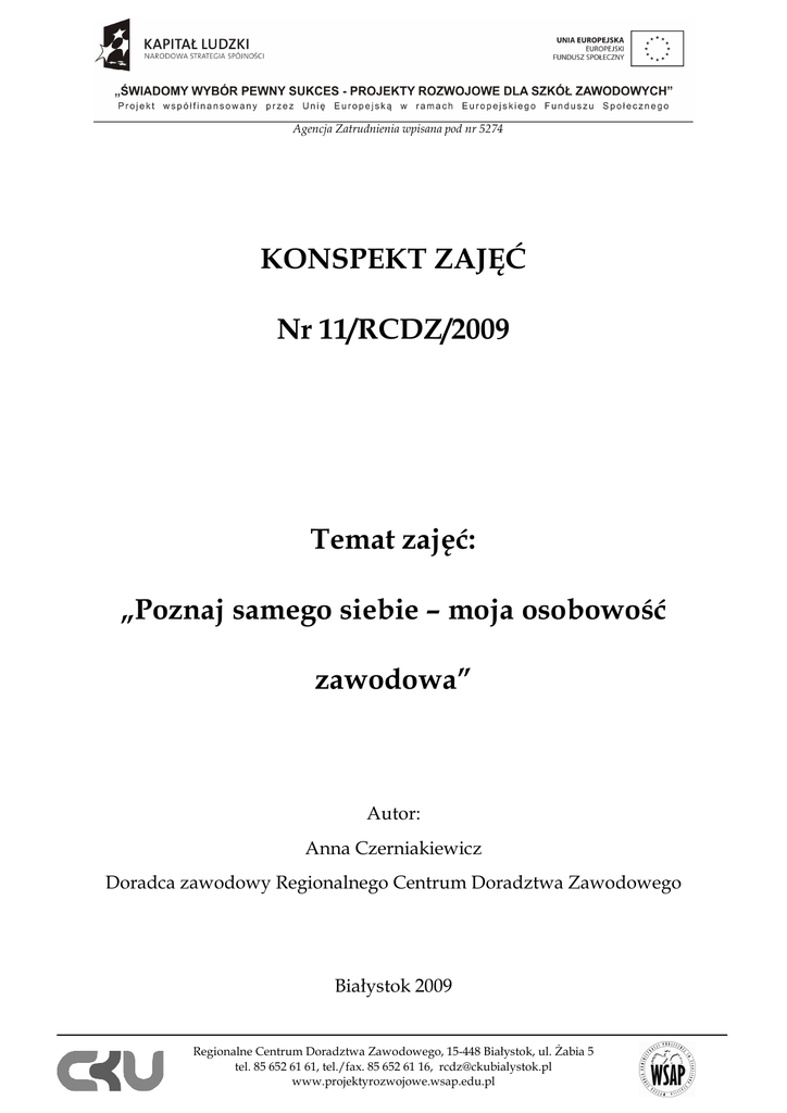 Agencja Zatrudnienia wpisana pod nr 5274 KONSPEKT ZAJĘĆ Nr 11/RCDZ/2009 Temat zajęć: „Poznaj samego siebie – moja osobowość zawodowa” Autor: Anna Czerniakiewicz Doradca zawodowy Regionalnego Centrum Doradztwa Zawodowego Białystok 2009 Regionalne Centrum Doradztwa Zawodowego, 15-448 Białystok, ul. śabia 5 tel. 85 652 61 61, tel./fax. 85 652 61 16, [email protected] www.projektyrozwojowe.wsap.edu.pl Agencja Zatrudnienia wpisana pod nr 5274 Cele zajęć: 1. Poznanie nowego sposobu myślenia o sobie. 2. Lepsze poznanie siebie samego i innych osób. 3. Identyfikacja umiejętności, moŜliwości i predyspozycji zawodowych. 4. Poznanie swych zainteresowań zawodowych. 5. Zwiększenie poczucia pewności siebie wśród uczestników grupy. Korzyści (efekty zajęć): W wyniku zajęć uczestnicy: 1. Poznają pojęcia: umiejętności, kwalifikacje, zainteresowania zawodowe. 2. Rozpoznają rodzaje umiejętności, które człowiek nabywa w ciągu swojego Ŝycia. 3. Określą umiejętności, które juŜ posiadają. 4. Potrafią wskazać na rolę zainteresowań w planowaniu kariery zawodowej. 5. Określą swój obszar zainteresowań zawodowych Metody pracy: Zajęcia prowadzone będą metodami aktywizującymi uczestników, z wykorzystaniem róŜnorodnych form i metod (przede wszystkim z wykorzystaniem laptopa i projektora multimedialnego do wyświetlania prezentacji multimedialnych). W większości zajęcia składać się będą z „burzy mózgów” oraz dyskusji kierowanej, z nastawieniem na aktywność wszystkich uczestników. Ponadto kaŜdy z uczestników będzie miał szansę zaprezentować swoje zdanie na forum grupy, a takŜe wykonać test bądź kwestionariusz określający obszar zainteresowań zawodowych. Sposób prowadzenia zajęć zakłada maksymalny i aktywny udział wszystkich uczestników, przy zminimalizowaniu tradycyjnych sposobów przekazywania wiedzy. Materiały: Do przeprowadzenia zajęć wykorzystuje się laptop, projektor multimedialny, autorskie prezentacje doradców zawodowych, testy bądź kwestionariusze oraz inne materiały sporządzone na podstawie podręczników dla doradców zawodowych. Regionalne Centrum Doradztwa Zawodowego, 15-448 Białystok, ul. śabia 5 tel. 85 652 61 61, tel./fax. 85 652 61 16, [email protected] www.projektyrozwojowe.wsap.edu.pl Agencja Zatrudnienia wpisana pod nr 5274 Czas trwania zajęć: 90 min. Zagadnienia: 1. Wprowadzenie terminów: umiejętności, kwalifikacje, zainteresowania, obszar zainteresowań zawodowych. 2. Określenie umiejętności, które posiadają uczestnicy oraz ich rola w planowaniu kariery zawodowej i edukacyjnej. 3. Określenie obszaru zainteresowań zawodowych oraz ich rola w planowaniu kariery zawodowej i edukacyjnej. 4. Mój obszar zainteresowań zawodowych a zawody, stanowiska i miejsca pracy. Literatura: 1. e-SzOK, Wydawnictwo Progra 2. Liwosz E., Pankiewicz K., Staroń A., Kostecka A., Klub Pracy. Program szkolenia, Wydanie II, Ministerstwo Gospodarki Pracy i Polityki Społecznej, Warszawa 2003 3. Metody grupowego poradnictwa zawodowego. Kurs inspiracji, Zeszyty informacyjno -metodyczne doradcy zawodowego – Zeszyt nr 11, Krajowy Urząd Pracy, Warszawa 1998 4. Paszkowska-Rogacz A., Tarnowska M., Metody pracy z grupą w poradnictwie zawodowym, Krajowy Ośrodek Wspierania Edukacji Zawodowej, Warszawa 2004 5. Piramida Kariery 2, Wydawnictwo Progra 6. Planowanie kariery czyli jaki wybrać zawód, Wydawnictwo Synergia 7. Test preferencji i predyspozycji zawodowych, Wydawnictwo Progra Regionalne Centrum Doradztwa Zawodowego, 15-448 Białystok, ul. śabia 5 tel. 85 652 61 61, tel./fax. 85 652 61 16, [email protected] www.projektyrozwojowe.wsap.edu.pl
