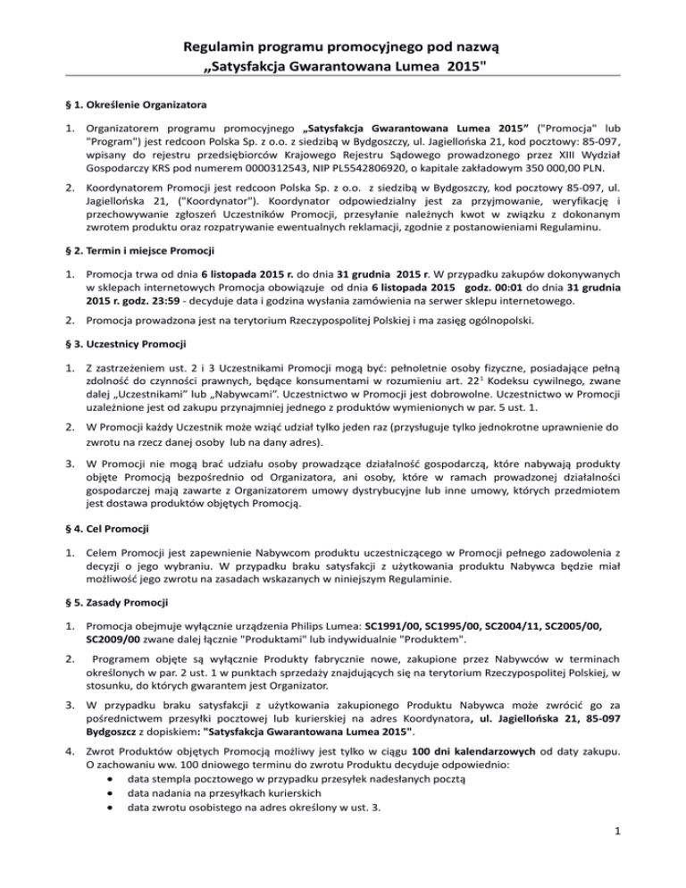 "Program") jest redcoon Polska Sp. z o.o. z siedzibą w Bydgoszczy, ul. Jagiellońska 21, kod pocztowy: 85-097,