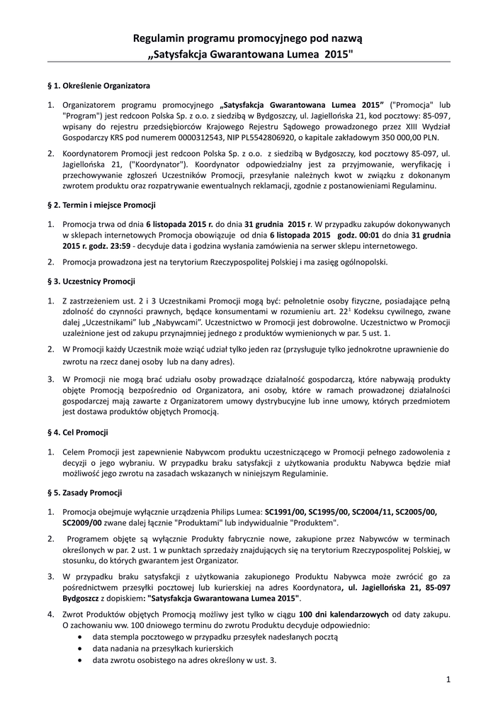 1. Aktualny Regulamin Promocji dostępny będzie na stronie: http://www.redcoon.pl/rc-lumeaphilips
