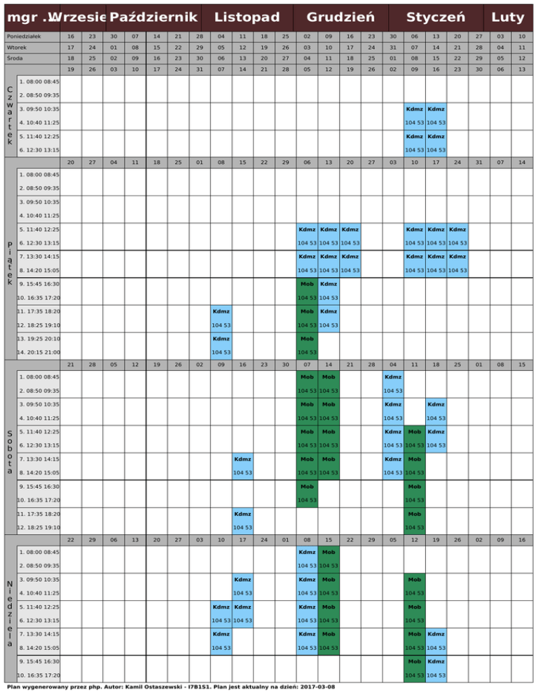mgr ... Wrzesień Październik Listopad Grudzień Styczeń Luty Poniedziałek 16 23 30 07 14 21 28 04 11 18 25 02 09 16 23 30 06 13 20 27 03 10 Wtorek 17 24 01 08 15 22 29 05 12 19 26 03 10 17 24 31 07 14 21 28 04 11 Środa 18 25 02 09 16 23 30 06 13 20 27 04 11 18 25 01 08 15 22 29 05 12 19 26 03 10 17 24 31 07 14 21 28 05 12 19 26 02 09 16 23 30 06 13 24 31 07 14 25 01 08 15 26 02 09 16 1. 08:00 08:45 C z w a r t e k 2. 08:50 09:35 3. 09:50 10:35 Kdmz Kdmz 4. 10:40 11:25 104 53 104 53 5. 11:40 12:25 Kdmz Kdmz 6. 12:30 13:15 104 53 104 53 20 27 04 11 18 25 01 08 15 22 29 06 13 20 27 03 10 17 1. 08:00 08:45 2. 08:50 09:35 3. 09:50 10:35 4. 10:40 11:25 P i ą t e k 5. 11:40 12:25 Kdmz Kdmz Kdmz Kdmz Kdmz Kdmz 6. 12:30 13:15 104 53 104 53 104 53 104 53 104 53 104 53 7. 13:30 14:15 Kdmz Kdmz Kdmz Kdmz Kdmz Kdmz 8. 14:20 15:05 104 53 104 53 104 53 104 53 104 53 104 53 9. 15:45 16:30 Mob 10. 16:35 17:20 104 53 104 53 11. 17:35 18:20 Kdmz 12. 18:25 19:10 104 53 13. 19:25 20:10 Kdmz 14. 20:15 21:00 Mob 28 05 12 19 26 02 09 Mob 104 53 16 23 30 1. 08:00 08:45 2. 08:50 09:35 07 14 Mob Mob 21 28 Mob 4. 10:40 11:25 Mob 6. 12:30 13:15 Mob Mob Kdmz 8. 14:20 15:05 104 53 Mob Kdmz 104 53 104 53 Mob Mob Kdmz 104 53 104 53 Mob 104 53 104 53 Mob Mob 10. 16:35 17:20 104 53 104 53 11. 17:35 18:20 Kdmz Mob 12. 18:25 19:10 104 53 104 53 29 06 13 20 27 03 10 17 24 01 08 15 1. 08:00 08:45 Kdmz Mob 2. 08:50 09:35 104 53 104 53 3. 09:50 10:35 Kdmz Kdmz Mob 4. 10:40 11:25 104 53 104 53 104 53 5. 11:40 12:25 Kdmz Kdmz Kdmz 6. 12:30 13:15 104 53 104 53 104 53 104 53 7. 13:30 14:15 Kdmz Kdmz 8. 14:20 15:05 104 53 104 53 104 53 Mob Mob 9. 15:45 16:30 10. 16:35 17:20 Plan wygenerowany przez php. Autor: Kamil Ostaszewski - I7B1S1. Plan jest aktualny na dzień: 2017-03-08 Kdmz 104 53 104 53 104 53 9. 15:45 16:30 22 18 Kdmz Kdmz 104 53 104 53 7. 13:30 14:15 11 104 53 104 53 104 53 5. 11:40 12:25 04 Kdmz 104 53 104 53 3. 09:50 10:35 N i e d z i e l a Kdmz 104 53 104 53 104 53 21 S o b o t a Kdmz 22 29 05 12 19 Mob 104 53 Mob 104 53 Mob Kdmz 104 53 104 53 Mob Kdmz 104 53 104 53