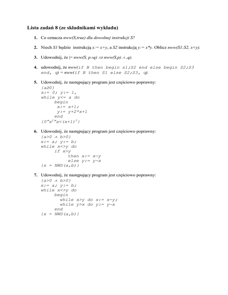 2. Niech S1 będzie instrukcją x:= x+y, a S2 instrukcją y:= x*y. Oblicz nww(S1;S2, x<y).