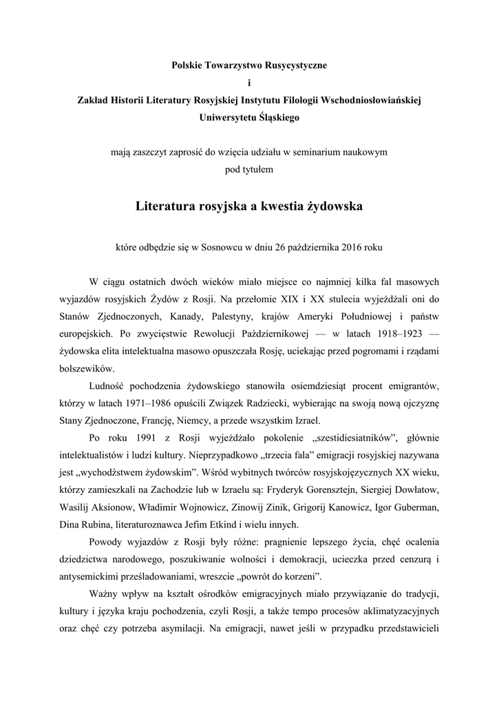 Polskie Towarzystwo Rusycystyczne i Zakład Historii Literatury Rosyjskiej Instytutu Filologii Wschodniosłowiańskiej Uniwersytetu Śląskiego mają zaszczyt zaprosić do wzięcia udziału w seminarium naukowym pod tytułem Literatura rosyjska a kwestia żydowska które odbędzie się w Sosnowcu w dniu 26 października 2016 roku W ciągu ostatnich dwóch wieków miało miejsce co najmniej kilka fal masowych wyjazdów rosyjskich Żydów z Rosji. Na przełomie XIX i XX stulecia wyjeżdżali oni do Stanów Zjednoczonych, Kanady, Palestyny, krajów Ameryki Południowej i państw europejskich. Po zwycięstwie Rewolucji Październikowej — w latach 1918–1923 — żydowska elita intelektualna masowo opuszczała Rosję, uciekając przed pogromami i rządami bolszewików. Ludność pochodzenia żydowskiego stanowiła osiemdziesiąt procent emigrantów, którzy w latach 1971–1986 opuścili Związek Radziecki, wybierając na swoją nową ojczyznę Stany Zjednoczone, Francję, Niemcy, a przede wszystkim Izrael. Po roku 1991 z Rosji wyjeżdżało pokolenie „szestidiesiatników”, głównie intelektualistów i ludzi kultury. Nieprzypadkowo „trzecia fala” emigracji rosyjskiej nazywana jest „wychodźstwem żydowskim”. Wśród wybitnych twórców rosyjskojęzycznych XX wieku, którzy zamieszkali na Zachodzie lub w Izraelu są: Fryderyk Gorensztejn, Siergiej Dowłatow, Wasilij Aksionow, Władimir Wojnowicz, Zinowij Zinik, Grigorij Kanowicz, Igor Guberman, Dina Rubina, literaturoznawca Jefim Etkind i wielu innych. Powody wyjazdów z Rosji były różne: pragnienie lepszego życia, chęć ocalenia dziedzictwa narodowego, poszukiwanie wolności i demokracji, ucieczka przed cenzurą i antysemickimi prześladowaniami, wreszcie „powrót do korzeni”. Ważny wpływ na kształt ośrodków emigracyjnych miało przywiązanie do tradycji, kultury i języka kraju pochodzenia, czyli Rosji, a także tempo procesów aklimatyzacyjnych oraz chęć czy potrzeba asymilacji. Na emigracji, nawet jeśli w przypadku przedstawicieli rosyjskiej alii w Izraelu jest to powrót do domu, zawsze zachodzi proces (re)konstruowania własnej tożsamości. Los człowieka-obywatela, mającego dwie ojczyzny, to nieustające rozterki, poczucie istnienia na rozdrożu, typowa dla losu każdego emigranta bifurkacja. Twórczość dla wielu literatów stała się formą terapii chroniącej przed utratą tożsamości. Rosyjskojęzyczne życie literackie w Izraelu i w innych ośrodkach na świecie, którego twórcami są literaci żydowskiego pochodzenia, biorąc pod uwagę zarówno liczebność jego przedstawicieli, jak i wartość interpretacyjną pisanych przez nich tekstów, stanowi istotną część kultury rosyjskiej. Wiedza naukowa w tym zakresie jest niestety niepełna i nieusystematyzowana, brakuje zwartych opracowań, opisujących rozmiary i złożoność zjawiska. Mamy nadzieję, że nasze seminarium da początek szczegółowym badaniom. Proponowana tematyka: 1. Pisarze rosyjsko-żydowscy — biografie, twórczość. 2. Rosyjsko-żydowski dialog kultur i tradycji literackich. 3. Tożsamość na pograniczu kultur — problemy identyfikacyjne twórców i ich literackie kreacje. 4. Życie literackie i kulturalne w Izraelu i w ośrodkach rosyjskiej diaspory — ośrodki, organizacje, wydarzenia, wydawnictwa, czasopiśmiennictwo. 5. Krytyka literacka w Izraelu i w diasporze. Zgłoszenia uczestnictwa w seminarium wraz z tematem wystąpienia i krótkim streszczeniem prosimy nadsyłać do 15 maja 2016 roku na adres e-mail: [email protected] Opłata wynosi 250 złotych i obejmuje wydatki związane z publikacją tomu poseminaryjnego. Koszty związane z uczestnictwem w seminarium (przejazd, nocleg) ponoszą uczestnicy. Szczegółowe informacje organizacyjne będą przesłane na adres Państwa poczty elektronicznej po otrzymaniu zgłoszenia uczestnictwa w seminarium. W imieniu organizatorów dr hab. Mirosława Michalska-Suchanek — Uniwersytet Śląski dr Agnieszka Lenart — Katolicki Uniwersytet Lubelski Jana Pawła II FORMULARZ ZGŁOSZENIA UDZIAŁU w seminarium naukowym „Literatura rosyjska a kwestia żydowska” Sosnowiec, 26 października 2016 r. Imię i nazwisko: .......................................................................................................................... Tytuł/stopień naukowy: ............................................................................................................... Uczelnia/Instytucja: ..................................................................................................................... Temat wystąpienia: ...................................................................................................................... ....................................................................................................................................................... Abstrakt (ok. 1500 znaków) ....................................................................................................................................................... ....................................................................................................................................................... ....................................................................................................................................................... ....................................................................................................................................................... ....................................................................................................................................................... ....................................................................................................................................................... Adres do korespondencji: ..........................................................................................................................................