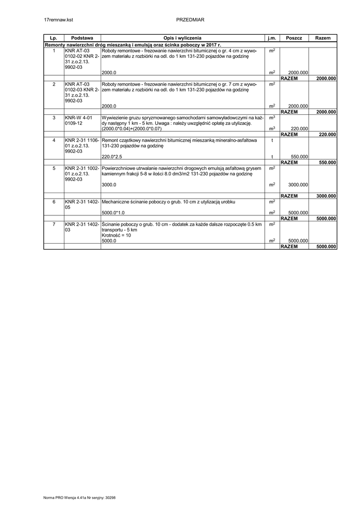 17remnaw.kst PRZEDMIAR Lp. Podstawa Opis i wyliczenia Remonty nawierzchni dróg mieszanką i emulsją oraz ścinka poboczy w 2017 r. 1 KNR AT-03 Roboty remontowe - frezowanie nawierzchni bitumicznej o gr. 4 cm z wywo0102-02 KNR 2- zem materiału z rozbiórki na odl. do 1 km 131-230 pojazdów na godzinę 31 z.o.2.13. 9902-03 2000.0 2 3 4 5 6 7 j.m. m2 m2 KNR-W 4-01 0109-12 m3 KNR 2-31 1106- Remont cząstkowy nawierzchni bitumicznej mieszanką mineralno-asfaltowa 01 z.o.2.13. 131-230 pojazdów na godzinę 9902-03 220.0*2.5 m2 m3 2000.000 RAZEM 2000.000 2000.000 RAZEM 2000.000 220.000 RAZEM 220.000 550.000 RAZEM 550.000 t t KNR 2-31 1002- Powierzchniowe utrwalanie nawierzchni drogowych emulsją asfaltową grysem 01 z.o.2.13. kamiennym frakcji 5-8 w ilości 8.0 dm3/m2 131-230 pojazdów na godzinę 9902-03 3000.0 m2 KNR 2-31 1402- Mechaniczne ścinanie poboczy o grub. 10 cm z utylizacją urobku 05 5000.0*1.0 m2 KNR 2-31 1402- Ścinanie poboczy o grub. 10 cm - dodatek za każde dalsze rozpoczęte 0.5 km 03 transportu - 5 km Krotność = 10 5000.0 m2 Norma PRO Wersja 4.41a Nr seryjny: 30298 Razem m2 KNR AT-03 Roboty remontowe - frezowanie nawierzchni bitumicznej o gr. 7 cm z wywo0102-03 KNR 2- zem materiału z rozbiórki na odl. do 1 km 131-230 pojazdów na godzinę 31 z.o.2.13. 9902-03 2000.0 Wywiezienie gruzu spryzmowanego samochodami samowyładowczymi na każdy następny 1 km - 5 km. Uwaga : należy uwzględnić opłatę za utylizację. (2000.0*0.04)+(2000.0*0.07) Poszcz m2 m2 m2 3000.000 RAZEM 3000.000 5000.000 RAZEM 5000.000 5000.000 RAZEM 5000.000