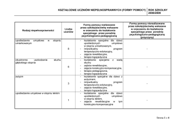 KSZTAŁCENIE UCZNIÓW NIEPEŁNOSPRAWNYCH (FORMY POMOCY) ROK SZKOLNY 2008/2009 Rodzaj niepełnosprawności upośledzenie umysłowe umiarkowanym w Liczba uczniów stopniu - 8 obustronne uszkodzenie głębokiego stopnia Formy pomocy realizowane przez szkołę/placówkę wskazane w orzeczeniu do kształcenia specjalnego przez poradnię psychologiczno-pedagogiczną - słuchu 6 autyzm 3 - upośledzenie umysłowe w stopniu lekkim 1 - kształcenie specjalne dla dzieci upośledzonych umysłowo w stopniu umiarkowanym, indywidualny program terapeutyczno-edukacyjny, zajęcia rewalidacyjne, terapia logopedyczna kształcenie specjalne z wadą słuchu zajścia rewalidacyjne, zajęcia korekcyjno-kompensacyjne, terapia pedagogiczna, terapia logopedyczna kształcenie specjalne dla dzieci z autyzmem; indywidualny program terapeutyczno-edukacyjny, zajęcia rewalidacyjne, terapia logopedyczna kształcenie specjalne dla dzieci upośledzonych umysłowo w stopniu lekkim, zajęcia rewalidacyjne w tym korekcyjno-kompensacyjne Formy pomocy nierealizowane przez szkołę/placówkę wskazane w orzeczeniu do kształcenia specjalnego przez poradnię psychologiczno-pedagogiczną (przyczyny) - - - - Strona 1 z 4 KSZTAŁCENIE UCZNIÓW NIEPEŁNOSPRAWNYCH (FORMY POMOCY) ROK SZKOLNY 2008/2009 Rodzaj niepełnosprawności Liczba uczniów choroba przewlekła epilepsja 2 - głębokie uszkodzenie wzroku - niewidomy 2 - uszkodzenie wzroku 4 niepełnosprawność uwarunkowana MPD Formy pomocy realizowane przez szkołę/placówkę wskazane w orzeczeniu do kształcenia specjalnego przez poradnię psychologiczno-pedagogiczną ruchowa - 1 - kształcenie specjalne dla dzieci chorych przewlekle, zajęcia korekcyjno-kompensacyjne, indywidualny program terapeutyczno-rozwojowy, terapia logopedyczna, kształcenie specjalne dla dzieci niewidomych; zajęcia rewalidacyjne z tyflopedagogiem indywidualny program edukacyjny kształcenie specjalne dla dzieci z uszkodzonym wzrokiem w klasie masowej zajęcia korekcyjno-kompensacyjne, dostosowanie wymagań edukacyjnych kształcenie specjalne dla dzieci z niepełnosprawnością ruchową w szkole ogólnodostępnej; zajęcia korekcyjnokompensacyjne, dostosowanie wymagań edukacyjnych oraz warunków i form sprawdzianu Formy pomocy nierealizowane przez szkołę/placówkę wskazane w orzeczeniu do kształcenia specjalnego przez poradnię psychologiczno-pedagogiczną (przyczyny) - - - - - Strona 2 z 4 KSZTAŁCENIE UCZNIÓW NIEPEŁNOSPRAWNYCH (FORMY POMOCY) ROK SZKOLNY 2008/2009 Rodzaj niepełnosprawności Liczba uczniów niepełnosprawność ruchowa 1 zaburzenia zachowania 3 Formy pomocy realizowane przez szkołę/placówkę wskazane w orzeczeniu do kształcenia specjalnego przez poradnię psychologiczno-pedagogiczną - zajęcia korekcyjno-kompensacyjne, dostosowanie wymagań programowych do możliwości dziecka, - zajęcia korekcyjno-kompensacyjne, zajęcia socjoterapeutyczne, opieka pedagoga szkolnego, terapia logopedyczna, zajęcia korekcyjno-kompensacyjne dostosowanie wymagań edukacyjnych kształcenie specjalne dla dzieci słabo słyszących w klasie ogólnodostępnej, dostosowanie wymagań edukacyjnych, terapia surdologopedyczna, zajęcia korekcyjno-kompensacyjne zajęcia dydaktyczno-wyrównawcze uszkodzenie słuchu w stopniu lekkim - 1 - Formy pomocy nierealizowane przez szkołę/placówkę wskazane w orzeczeniu do kształcenia specjalnego przez poradnię psychologiczno-pedagogiczną (przyczyny) - - - Strona 3 z 4 KSZTAŁCENIE UCZNIÓW NIEPEŁNOSPRAWNYCH (FORMY POMOCY) ROK SZKOLNY 2008/2009 Rodzaj niepełnosprawności Liczba uczniów lewostronne uszkodzenie słuch w stopniu głębokim Formy pomocy realizowane przez szkołę/placówkę wskazane w orzeczeniu do kształcenia specjalnego przez poradnię psychologiczno-pedagogiczną - 1 - kształcenie specjalne dla dzieci słabo słyszących w klasie ogólnodostępnej, dostosowanie wymagań edukacyjnych do potrzeb i specyfiki rozwoju dziecka terapia surdologopedyczna, zajęcia korekcyjno-kompensacyjne Formy pomocy nierealizowane przez szkołę/placówkę wskazane w orzeczeniu do kształcenia specjalnego przez poradnię psychologiczno-pedagogiczną (przyczyny) - Strona 4 z 4