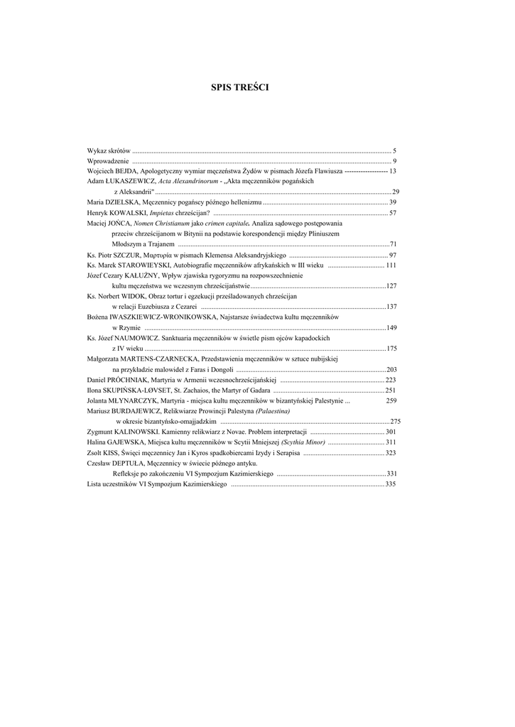 SPIS TREŚCI Wykaz skrótów ................................................................................................................................................... 5 Wprowadzenie ................................................................................................................................................... 9 Wojciech BEJDA, Apologetyczny wymiar męczeństwa Żydów w pismach Józefa Flawiusza ------------------- 13 Adam ŁUKASZEWICZ, Acta Alexandrinorum - „Akta męczenników pogańskich z Aleksandrii" ...................................................................................................................................... 29 Maria DZIELSKA, Męczennicy pogańscy późnego hellenizmu ....................................................................... 39 Henryk KOWALSKI, Impietas chrześcijan? ................................................................................................... 57 Maciej JOŃCA, Nomen Christianum jako crimen capitale. Analiza sądowego postępowania przeciw chrześcijanom w Bitynii na podstawie korespondencji między Pliniuszem Młodszym a Trajanem ........................................................................................................................ 71 Ks. Piotr SZCZUR, Mαρτυρία w pismach Klemensa Aleksandryjskiego ........................................................ 97 Ks. Marek STAROWIEYSKI, Autobiografie męczenników afrykańskich w III wieku ................................ 111 Józef Cezary KAŁUŻNY, Wpływ zjawiska rygoryzmu na rozpowszechnienie kultu męczeństwa we wczesnym chrześcijaństwie .............................................................................127 Ks. Norbert WIDOK, Obraz tortur i egzekucji prześladowanych chrześcijan w relacji Euzebiusza z Cezarei ......................................................................................................... 137 Bożena IWASZKIEWICZ-WRONIKOWSKA, Najstarsze świadectwa kultu męczenników w Rzymie ......................................................................................................................................... 149 Ks. Józef NAUMOWICZ. Sanktuaria męczenników w świetle pism ojców kapadockich z IV wieku ......................................................................................................................................... 175 Małgorzata MARTENS-CZARNECKA, Przedstawienia męczenników w sztuce nubijskiej na przykładzie malowideł z Faras i Dongoli ..................................................................................... 203 Daniel PRÓCHNIAK, Martyria w Armenii wczesnochrześcijańskiej ........................................................... 223 Ilona SKUPIŃSKA-LØVSET, St. Zachaios, the Martyr of Gadara ............................................................... 251 Jolanta MŁYNARCZYK, Martyria - miejsca kultu męczenników w bizantyńskiej Palestynie ... 259 Mariusz BURDAJEWICZ, Relikwiarze Prowincji Palestyna (Palaestina) w okresie bizantyńsko-omajjadzkim ................................................................................................ 275 Zygmunt KALINOWSKI. Kamienny relikwiarz z Novae. Problem interpretacji .......................................... 301 Halina GAJEWSKA, Miejsca kultu męczenników w Scytii Mniejszej (Scythia Minor) ................................ 311 Zsolt KISS, Święci męczennicy Jan i Kyros spadkobiercami Izydy i Serapisa .............................................. 323 Czesław DEPTUŁA, Męczennicy w świecie późnego antyku. Refleksje po zakończeniu VI Sympozjum Kazimierskiego .............................................................. 331 Lista uczestników VI Sympozjum Kazimierskiego ....................................................................................... 335