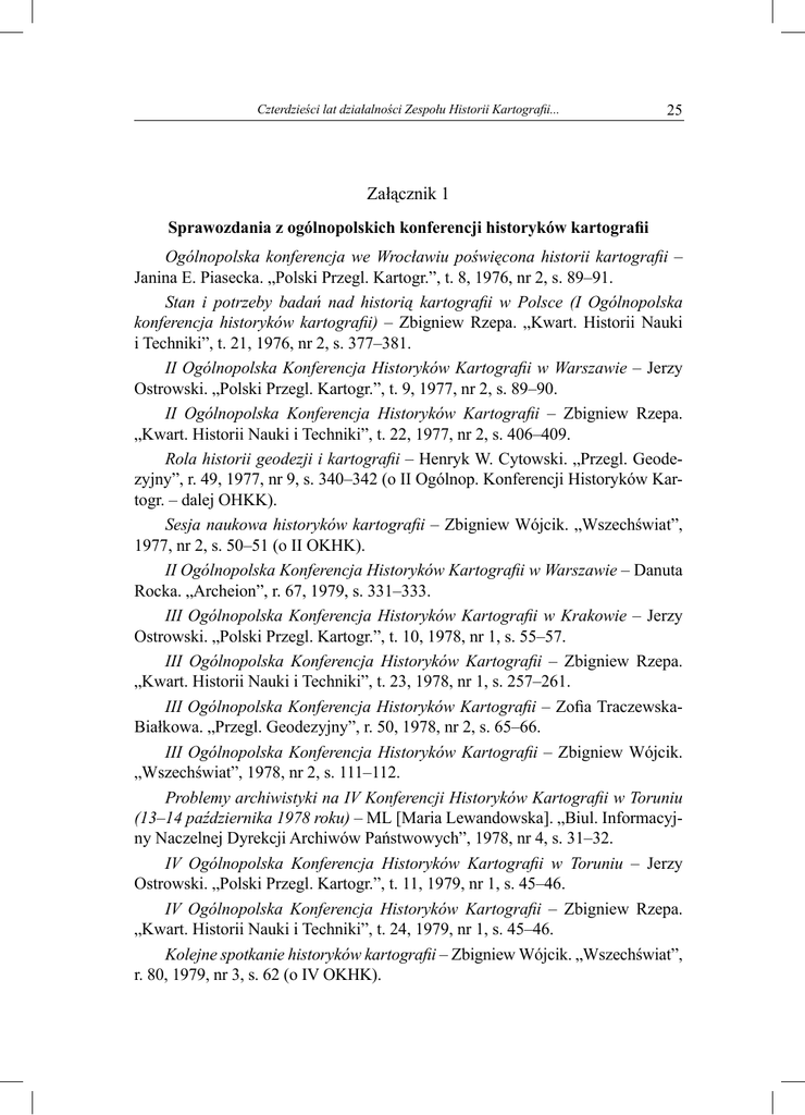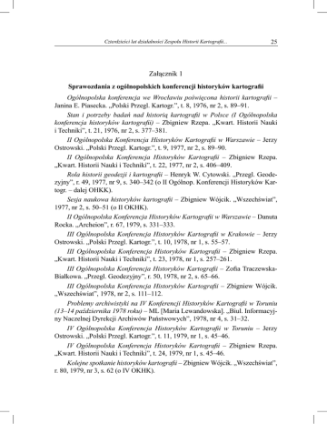 Czterdzieści lat działalności Zespołu Historii Kartografii... 25 Załącznik 1 Sprawozdania z ogólnopolskich konferencji historyków kartografii Ogólnopolska konferencja we Wrocławiu poświęcona historii kartografii – Janina E. Piasecka. „Polski Przegl. Kartogr.”, t. 8, 1976, nr 2, s. 89–91. Stan i potrzeby badań nad historią kartografii w Polsce (I Ogólnopolska konferencja historyków kartografii) – Zbigniew Rzepa. „Kwart. Historii Nauki i Techniki”, t. 21, 1976, nr 2, s. 377–381. II Ogólnopolska Konferencja Historyków Kartografii w Warszawie – Jerzy Ostrowski. „Polski Przegl. Kartogr.”, t. 9, 1977, nr 2, s. 89–90. II Ogólnopolska Konferencja Historyków Kartografii – Zbigniew Rzepa. „Kwart. Historii Nauki i Techniki”, t. 22, 1977, nr 2, s. 406–409. Rola historii geodezji i kartografii – Henryk W. Cytowski. „Przegl. Geodezyjny”, r. 49, 1977, nr 9, s. 340–342 (o II Ogólnop. Konferencji Historyków Kartogr. – dalej OHKK). Sesja naukowa historyków kartografii – Zbigniew Wójcik. „Wszechświat”, 1977, nr 2, s. 50–51 (o II OKHK). II Ogólnopolska Konferencja Historyków Kartografii w Warszawie – Danuta Rocka. „Archeion”, r. 67, 1979, s. 331–333. III Ogólnopolska Konferencja Historyków Kartografii w Krakowie – Jerzy Ostrowski. „Polski Przegl. Kartogr.”, t. 10, 1978, nr 1, s. 55–57. III Ogólnopolska Konferencja Historyków Kartografii – Zbigniew Rzepa. „Kwart. Historii Nauki i Techniki”, t. 23, 1978, nr 1, s. 257–261. III Ogólnopolska Konferencja Historyków Kartografii – Zofia TraczewskaBiałkowa. „Przegl. Geodezyjny”, r. 50, 1978, nr 2, s. 65–66. III Ogólnopolska Konferencja Historyków Kartografii – Zbigniew Wójcik. „Wszechświat”, 1978, nr 2, s. 111–112. Problemy archiwistyki na IV Konferencji Historyków Kartografii w Toruniu (13–14 października 1978 roku) – ML [Maria Lewandowska]. „Biul. Informacyjny Naczelnej Dyrekcji Archiwów Państwowych”, 1978, nr 4, s. 31–32. IV Ogólnopolska Konferencja Historyków Kartografii w Toruniu – Jerzy Ostrowski. „Polski Przegl. Kartogr.”, t. 11, 1979, nr 1, s. 45–46. IV Ogólnopolska Konferencja Historyków Kartografii – Zbigniew Rzepa. „Kwart. Historii Nauki i Techniki”, t. 24, 1979, nr 1, s. 45–46. Kolejne spotkanie historyków kartografii – Zbigniew Wójcik. „Wszechświat”, r. 80, 1979, nr 3, s. 62 (o IV OKHK). 26 Jerzy Ostrowski Konferencja Historyków Kartografii – Zbigniew Wójcik. „Przegl. Geologiczny”, t. 17, 1979, nr 2, s. 132 (o IV OKHK). V Ogólnopolska Konferencja Historyków Kartografii w Wieliczce – Jerzy Ostrowski. „Polski Przegl. Kartogr.”, t. 12, 1980, nr 2, s. 88–89. V Ogólnopolska Konferencja Historyków Kartografii – Zbigniew Rzepa. „Kwart. Historii Nauki i Techniki”, t. 25, 1980, nr 2, s. 437–440. V Ogólnopolska Konferencja Historyków Kartografii – Zbigniew Wójcik. „Wszechświat”, r. 81, 1980, z. 6, s. 159. V Ogólnopolska Konferencja Historyków Kartografii – Julian Janczaak. „Archeion”, t. 73, 1982, s. 332–333. VI Ogólnopolska Konferencja Historyków Kartografii – Ewa Lewandowska, Zbigniew Wójcik. „Wszechświat”, r. 81, 1980, z. 6, s. 102. VI Ogólnopolska Konferencja Historyków Kartografii w Poznaniu – Jerzy Ostrowski. „Polski Przegl. Kartogr.”, t. 13, 1981, nr 1, s. 40–41. VI Ogólnopolska Konferencja Historyków Kartografii – Maria Lewandowska. „Archeion”, t. 74, 1982, s. 201–203. VII Ogólnopolska Konferencja Historyków Kartografii w Krakowie – Jerzy Ostrowski. „Polski Przegl. Kartogr.”, t. 14, 1982, nr 1, s. 45–47. VII Ogólnopolska Konferencja Historyków Kartografii (Kraków 15–16 IX 1981) – Maria Lewandowska. „Archeion”, t. 75, 1983, s. 342–343. VIII Ogólnopolska Konferencja Historyków Kartografii w Warszawie – Janina E. Piasecka. „Polski Przegl. Kartogr.”, t. 14, 1982, nr 4, s. 200–202. VIII Ogólnopolska Konferencja Historyków Kartografii – Maria Lewandowska. „Archeion”, t. 74, 1984, s. 269–271. IX Ogólnopolska Konferencja Historyków Kartografii w Warszawie – Jerzy Ostrowski. „Polski Przegl. Kartogr.”, t. 17, 1985, nr 3, s. 157–159. Historia kartografii leśnej – problematyka IX Ogólnopolskiej Konferencji Historyków Kartografii – Wojciech Wilkowski. „Przegl. Geodezyjny”, r. 57, 1985, nr 1, s. 16–17. IX Ogólnopolska Konferencja Historyków Kartografii – Zbigniew Wójcik. „Wszechświat”, r. 86, 1985, nr 7–8, s. 182. IX Ogólnopolska Konferencja Historyków Kartografii – Maria Lewandowska. „Archeion”, t. 81, 1986, s. 226–228. X Ogólnopolska Konferencja Historyków Kartografii w Lublinie – Ewa Gołąb. „Polski Przegl. Kartogr.”, t. 18, 1986, nr 2, s. 97–98. X Ogólnopolska Konferencja Historyków Kartografii – Maria Lewandowska. „Archeion”, t. 83, 1987, s. 312–316. Czterdzieści lat działalności Zespołu Historii Kartografii... 27 XI Ogólnopolska Konferencja Historyków Kartografii we Wrocławiu – Cezary Jędrzejczak. „Polski Przegl. Kartogr.”, t. 19, 1987, nr 3, s. 134–136. XI Ogólnopolska Konferencja Historyków Kartografii we Wrocławiu – Zbigniew Wójcik. „Przegl. Geologiczny”, r. 35, 1987, nr 2, s. 3 okł. XII Ogólnopolska Konferencja Historyków Kartografii w Toruniu – Zenon Kozieł. „Polski Przegl. Kartogr.”, t. 20, 1988, nr 2, s. 95–96. XII Ogólnopolska Konferencja Historyków Kartografii w Toruniu – Halina Robótka. „Zapiski Historyczne”, t. 53, 1988, z. 3/4, s. 146–147. XII Ogólnopolska Konferencja Historyków Kartografii – Maria Lewandowska. „Archeion”, t. 87, 1990, s. 300–302. Twierdza Toruń w kartografii – Halina Robótka. „Archeion”, t. 87, 1990, s. 305–306 (o wystawie z okazji XII OKHK). XIII Ogólnopolska Konferencja Historyków Kartografii w Jeleniej Górze – Beata Konopska. „Polski Przegl. Kartogr.”, t. 22, 1990, nr 3, s. 105–108. XIII spotkanie his