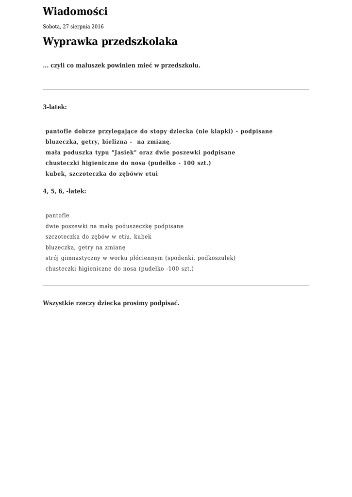 Wiadomości Sobota, 27 sierpnia 2016 Wyprawka przedszkolaka ... czyli co maluszek powinien mieć w przedszkolu. 3-latek: pantofle dobrze przylegające do stopy dziecka (nie klapki) - podpisane bluzeczka, getry, bielizna - na zmianę, mała poduszka typu "Jasiek" oraz dwie poszewki podpisane chusteczki higieniczne do nosa (pudełko - 100 szt.) kubek, szczoteczka do zębóww etui 4, 5, 6, -latek: pantofle dwie poszewki na małą poduszeczkę podpisane szczoteczka do zębów w etiu, kubek bluzeczka, getry na zmianę strój gimnastyczny w worku płóciennym (spodenki, podkoszulek) chusteczki higieniczne do nosa (pudełko -100 szt.) Wszystkie rzeczy dziecka prosimy podpisać.