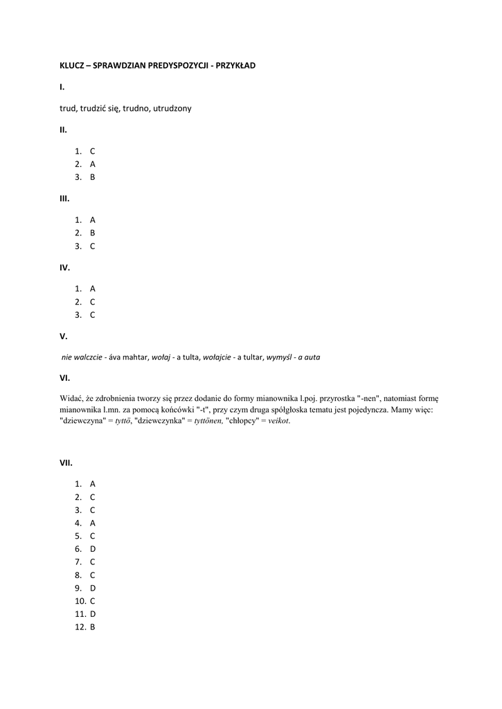 KLUCZ – SPRAWDZIAN PREDYSPOZYCJI - PRZYKŁAD I. trud, trudzić się, trudno, utrudzony II. 1. C 2. A 3. B III. 1. A 2. B 3. C IV. 1. A 2. C 3. C V. nie walczcie - áva mahtar, wołaj - a tulta, wołajcie - a tultar, wymyśl - a auta VI. Widać, że zdrobnienia tworzy się przez dodanie do formy mianownika l.poj. przyrostka "-nen", natomiast formę mianownika l.mn. za pomocą końcówki "-t", przy czym druga spółgłoska tematu jest pojedyncza. Mamy więc: "dziewczyna" = tyttö, "dziewczynka" = tyttönen, "chłopcy" = veikot. VII. 1. 2. 3. 4. 5. 6. 7. 8. 9. 10. 11. 12. A C C A C D C C D C D B VIII. 1. 2. 3. 4. 5. 6. 7. 8. 9. 10. 11. 12. 13. 14. 15. am trying met Do you go quickly feet will win / win us quietly could watches were you to study are playing be didn’t you bring 1. 2. 3. 4. 5. 6. C C B A C C IX. X. 1. C 2. A 3. B XI. 1. 2. 3. 4. F T T F