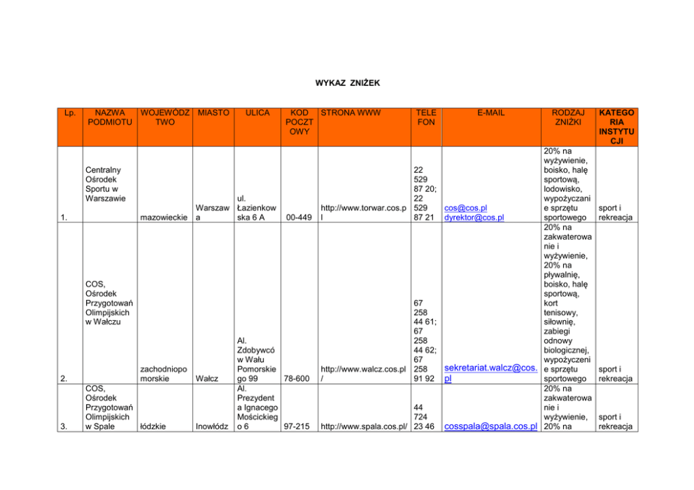 WYKAZ ZNIŻEK Lp. NAZWA PODMIOTU Centralny Ośrodek Sportu w Warszawie 1. WOJEWÓDZ MIASTO TWO ULICA ul. Warszaw Łazienkow mazowieckie a ska 6 A KOD STRONA WWW POCZT OWY 00-449 COS, Ośrodek Przygotowań Olimpijskich w Wałczu 2. 3. zachodniopo morskie COS, Ośrodek Przygotowań Olimpijskich w Spale łódzkie Wałcz Inowłódz Al. Zdobywcó w Wału Pomorskie go 99 78-600 Al. Prezydent a Ignacego Mościckieg o6 97-215 TELE FON E-MAIL RODZAJ ZNIŻKI 20% na wyżywienie, 22 boisko, halę 529 sportową, 87 20; lodowisko, 22 wypożyczani http://www.torwar.cos.p 529 [email protected] e sprzętu l 87 21 [email protected] sportowego 20% na zakwaterowa nie i wyżywienie, 20% na pływalnię, boisko, halę sportową, 67 kort 258 tenisowy, 44 61; siłownię, 67 zabiegi 258 odnowy 44 62; biologicznej, 67 wypożyczeni sekretariat.walcz@cos. e sprzętu http://www.walcz.cos.pl 258 / 91 92 pl sportowego 20% na zakwaterowa 44 nie i 724 wyżywienie, http://www.spala.cos.pl/ 23 46 [email protected] 20% na KATEGO RIA INSTYTU CJI sport i rekreacja sport i rekreacja sport i rekreacja 4. COS, Ośrodek Przygotowań Olimpijskich w Szczyrku śląskie 5. COS, Ośrodek Przygotowań Olimpijskich w Zakopanem małopolskie Szczyrk ul. Plażowa 8 43-370 www.szczyrk.cos.pl 33 81 78 441; 33 81 78 44; 33 81 sekretariat.szczyrk@c 78 os.pl 462 http://www.zakopane.c os.pl/ Zakopan e ul. Bronisława Czecha 1 34-500 18 263 26 60 [email protected] pływalnię, boisko, halę sportową, kort tenisowy, siłownię, wypożyczeni e roweru, zabiegi odnowy biologicznej 20% na zakwaterowa nie i wyżywienie, 20% na pływalnię, boisko, halę sportową, kort tenisowy, siłownię, zabiegi odnowy biologicznej, skocznię narciarską, trasy narciarskie 20% na zakwaterowa nie i wyżywienie, 20% na pływalnię, boisko, halę sportową, kort tenisowy, sport i rekreacja sport i rekreacja http://gizycko.cos.pl/ 6. COS, Ośrodek Przygotowań Olimpijskich warmińskow Giżycku mazurskie 7. COS, Ośrodek Przygotowań Olimpijskich we Władysławo wie pomorskie Giżycko ul. Moniuszki 22 87 428 23 35 11-500 http://cetniewo.cos.pl/ ul. Władysła Żeromskie wowo go 52 84-120 58 674 63 00 siłownię, zabiegi odnowy biologicznej, skocznię narciarską, trasy narciarskie, lodowisko 20% na zakwaterowa nie i wyżywienie, 20% na boisko, halę sportową, kort tenisowy, siłownię, zabiegi odnowy biologicznej, wypożyczeni dyrekcja.gizycko@cos. e sprzętu pl sportowego 20% na zakwaterowa nie i wyżywienie, 20% na pływalnię, boisko, halę sportową, kort tenisowy, siłownię, zabiegi [email protected]. odnowy pl biologicznej, sport i rekreacja sport i rekreacja wypożyczeni e sprzętu sportowego 8. Centrum Kształcenia i Wychowania w Gołdapi 9. Centrum Kształcenia i Wychowania w Szczawnicy Jabłonce małopolskie ul. Szczawni Szlachtow ca ska 75 10. Ośrodek Szkolenia i Wychowania w Człuchowie ul. Kusociński Człuchów ego 4 77-300 11. 12. Ośrodek Szkolenia i Wychowania w Wiśle Ośrodek Szkolenia i Wychowania w Lanckoronie warmińskomazurskie pomorskie Gołdap ul. Boczna 1 ul. 11Listopada 35 19-500 www.ckiwgoldap.ohp.pl/ 34-460 www.ckiwszczawnica.ohp.pl/ śląskie Wisła małopolskie ul. Lanckoro Krakowska na 513 34-143 87 615 03 53 [email protected] 18 ckiwszczawnica@ohp. 262 27 80 pl 59 834 55 83; 502 857 628 33 855 50 72 43-460 http://www.osrodekkorona.pl/ 33 876 64 01 [email protected] 10% na zakwaterowa nie i wyżywienie, halę sportową, siłownię 10% na zakwaterowa nie i wyżywienie, boisko, kort tenisowy, siłownię, zabiegi odnowy biologicznej 10% na zakwaterowa nie i wyżywienie, boisko, siłownię 10% na zakwaterowa nie i wyżywienie, kort tenisowy, siłownię 10% na zakwaterowa nie i wyżywienie, boisko sport i rekreacja sport i rekreacja sport i rekreacja sport i rekreacja sport i rekreacja k. Krakowa 13. 14. 15. 16. 17. 18. 19. 20. Europejskie centrum Kształcenia i Wychowania w Roskoszy Ośrodek Wypoczynko wy "Ewunia" Centrum Kształcenia i Wychowania Dobieszków k. Łodzi Ośrodek Szkolenia i Wychowania Iwonicz Centrum Kształcenia i Wychowania Oleśnica k.Wrocławia Centrum Kształcenia i Wychowania Pleszew Centrum Kształcenia i Wychowania Nosowo k.Koszalina Centrum Kształcenia i Wychowania Tarnów 10% na zakwaterowa nie i wyżywienie, [email protected] boisko 10% na zakwaterowa nie i [email protected] wyżywienie lubelskie Biała Podlaska Roskosz 2 21-500 zachodniopo morskie Świnoujś cie ul. Kasprowic za 11 72-600 83 344 41 17 91 321 http://www.ewunia.swin 22 oujscie.pl/ 49 Dobieszkó w 70 95-010 42 710 92 00 [email protected] 38-440 13 42 50 2 60, [email protected] 10% na zakwaterowa nie i wyżywienie 10% na zakwaterowa nie i wyżywienie ul.Zamkow a4 56-400 71 314 20 12 [email protected] 10% na zakwaterowa nie i wyżywienie 10% na zakwaterowa nie i wyżywienie [email protected] 10% na zakwaterowa nie i wyżywienie 10% na zakwaterowa nie i wyżywienie łódzkie Stryków podkarpackie Iwonicz dolnośląskie Oleśnica wielkopolskie Pleszew zachodniopo morskie małopolskie ul.Zadwór 5 Al.Wojska Polskiego 21 Bieskierz Nosowo 1 Tarnów 63-300 http://eckiwroskosz.ohp.pl/ www.ckiwdobieszkow.ohp.pl http://www.ckiwpleszew.ohp.pl/ 94 318 03 80 76-039 ul. I.Mościckie go 33-100 62 742 06 02 www.ckiwtarnow.ohp.pl 14 621 72 35 sport i rekreacja sport i rekreacja sport i rekreacja sport i rekreacja sport i rekreacja sport i rekreacja sport i rekreacja sport i rekreacja 22. Centrum Kształcenia i Wychowania Wiechlice k.Nowej Soli lubuskie Rezydencja Prezydenta RP Zamek w Wiśle śląskie 23. Zespół Rezydencji BelwederKlonowa w Warszawie 21. 24. WYK AZ ZNIŻ EK ul. Szprotaw Jesionowa a 3 67-300 Wisła ul. Zameczek 1 Warszaw mazowieckie a ul. Flory 2 Kopalnia Soli Bochnia sp. z o.o. małopolskie Bochnia ul. Campi 15 43-460 00-586 32-700 http://www.ckiwwiechlice.ohp.pl/ 68 376 22 55 10% na zakwaterowa sekretariat@ckiwnie i wiechlice.ohp.pl wyżywienie 20% na zakwaterowa zamekwisla@zamekwisla nie i .pl wyżywienie www.belwederklonowa.kprp.pl 33 854 65 0