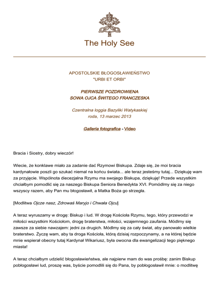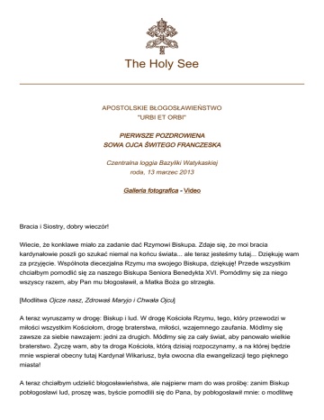 The Holy See APOSTOLSKIE BŁOGOSŁAWIEŃSTWO "URBI ET ORBI" PIERWSZE POZDROWIENA SOWA OJCA ŚWITEGO FRANCZESKA Czentralna loggia Bazyliki Watykaskiej roda, 13 marzec 2013 Galleria fotografica - Video Bracia i Siostry, dobry wieczór! Wiecie, że konklawe miało za zadanie dać Rzymowi Biskupa. Zdaje się, że moi bracia kardynałowie poszli go szukać niemal na końcu świata... ale teraz jesteśmy tutaj... Dziękuję wam za przyjęcie. Wspólnota diecezjalna Rzymu ma swojego Biskupa, dziękuję! Przede wszystkim chciałbym pomodlić się za naszego Biskupa Seniora Benedykta XVI. Pomódlmy się za niego wszyscy razem, aby Pan mu błogosławił, a Matka Boża go strzegła. [Modlitwa Ojcze nasz, Zdrowaś Maryjo i Chwała Ojcu] A teraz wyruszamy w drogę: Biskup i lud. W drogę Kościoła Rzymu, tego, który przewodzi w miłości wszystkim Kościołom, drogę braterstwa, miłości, wzajemnego zaufania. Módlmy się zawsze za siebie nawzajem: jedni za drugich. Módlmy się za cały świat, aby panowało wielkie braterstwo. Życzę wam, aby ta droga Kościoła, którą dzisiaj rozpoczynamy, a na której będzie mnie wspierał obecny tutaj Kardynał Wikariusz, była owocna dla ewangelizacji tego pięknego miasta! A teraz chciałbym udzielić błogosławieństwa, ale najpierw mam do was prośbę: zanim Biskup pobłogosławi lud, proszę was, byście pomodlili się do Pana, by pobłogosławił mnie: o modlitwę 2 ludu proszącego o błogosławieństwo dla swojego biskupa. Niech ta wasza modlitwa za mnie będzie w milczeniu. [...] Teraz udzielę błogosławieństwa wam i całemu światu, wszystkim ludziom dobrej woli. [Błogosławieństwo] Bracia i siostry, żegnam was. Bardzo dziękuję za przyjęcie. Módlcie się za mnie i do zobaczenia! Spotkamy się wkrótce: jutro chcę udać się na modlitwę do Matki Bożej, aby strzegła całego Rzymu. Dobranoc i dobrego odpoczynku! © Copyright - Libreria Editrice Vaticana