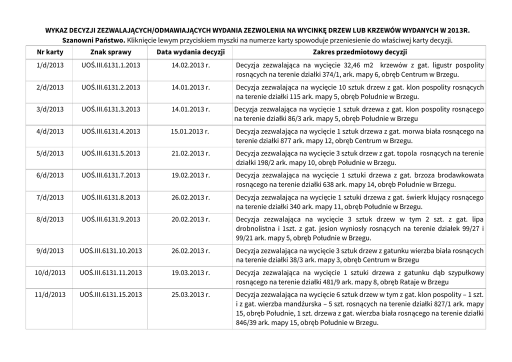 WYKAZ DECYZJI ZEZWALAJĄCYCH/ODMAWIAJĄCYCH WYDANIA ZEZWOLENIA NA WYCINKĘ DRZEW LUB KRZEWÓW WYDANYCH W 2013R. Szanowni Państwo. Kliknięcie lewym przyciskiem myszki na numerze karty spowoduje przeniesienie do właściwej karty decyzji. Nr karty Znak sprawy Data wydania decyzji Zakres przedmiotowy decyzji 1/d/2013 UOŚ.III.6131.1.2013 14.02.2013 r. Decyzja zezwalająca na wycięcie 32,46 m2 krzewów z gat. ligustr pospolity rosnących na terenie działki 374/1, ark. mapy 6, obręb Centrum w Brzegu. 2/d/2013 UOŚ.III.6131.2.2013 14.01.2013 r. Decyzja zezwalająca na wycięcie 10 sztuk drzew z gat. klon pospolity rosnących na terenie działki 115 ark. mapy 5, obręb Południe w Brzegu. 3/d/2013 UOŚ.III.6131.3.2013 14.01.2013 r. Decyzja zezwalająca na wycięcie 1 sztuk drzewa z gat. klon pospolity rosnącego na terenie działki 86/3 ark. mapy 5, obręb Południe w Brzegu 4/d/2013 UOŚ.III.6131.4.2013 15.01.2013 r. Decyzja zezwalająca na wycięcie 1 sztuk drzewa z gat. morwa biała rosnącego na terenie działki 877 ark. mapy 12, obręb Centrum w Brzegu. 5/d/2013 UOŚ.III.6131.5.2013 21.02.2013 r. Decyzja zezwalająca na wycięcie 3 sztuk drzew z gat. topola rosnących na terenie działki 198/2 ark. mapy 10, obręb Południe w Brzegu. 6/d/2013 UOŚ.III.6131.7.2013 19.02.2013 r. Decyzja zezwalająca na wycięcie 1 sztuki drzewa z gat. brzoza brodawkowata rosnącego na terenie działki 638 ark. mapy 14, obręb Południe w Brzegu. 7/d/2013 UOŚ.III.6131.8.2013 26.02.2013 r. Decyzja zezwalająca na wycięcie 1 sztuki drzewa z gat. świerk kłujący rosnącego na terenie działki 340 ark. mapy 11, obręb Południe w Brzegu. 8/d/2013 UOŚ.III.6131.9.2013 20.02.2013 r. Decyzja zezwalająca na wycięcie 3 sztuk drzew w tym 2 szt. z gat. lipa drobnolistna i 1szt. z gat. jesion wyniosły rosnących na terenie działek 99/27 i 99/21 ark. mapy 5, obręb Południe w Brzegu. 9/d/2013 UOŚ.III.6131.10.2013 26.02.2013 r. Decyzja zezwalająca na wycięcie 3 sztuk drzew z gatunku wierzba biała rosnących na terenie działki 38/3 ark. mapy 3, obręb Centrum w Brzegu 10/d/2013 UOŚ.III.6131.11.2013 19.03.2013 r. Decyzja zezwalająca na wycięcie 1 sztuki drzewa z gatunku dąb szypułkowy rosnącego na terenie działki 481/9 ark. mapy 8, obręb Rataje w Brzegu 11/d/2013 UOŚ.III.6131.15.2013 25.03.2013 r. Decyzja zezwalająca na wycięcie 6 sztuk drzew w tym z gat. klon pospolity – 1 szt. i z gat. wierzba mandżurska – 5 szt. rosnących na terenie działki 827/1 ark. mapy 15, obręb Południe, 1 szt. drzewa z gat. wierzba biała rosnącego na terenie działki 846/39 ark. mapy 15, obręb Południe w Brzegu. 12/d/2013 UOŚ.III.6131.16.2013 27.03.2013 r. Decyzja zezwalająca na wycięcie 4 sztuk drzew w tym z gat. sosna pospolita – 2 szt i z gat. daglezja zielona rosnących na terenie działki 826 ark. mapy 15, obręb Południe w Brzegu. 13/d/2013 UOŚ.III.6131.17.2013 02.04.2013 r. Decyzja zezwalająca na wycięcie 1 sztuki drzewa z gat. żywotnika zachodni rosnącego na terenie działki 759/2 ark. mapy 15, obręb Południe w Brzegu. 14/d/2013 UOŚ.III.6131.20.2013 08.04.2013 r. Decyzja odmowna na wycięcie 1 sztuki drzewa z gat. jesion wyniosły rosnącego na terenie działki 388 ark. mapy 6, obręb Centrum w Brzegu. 15/d/2013 UOŚ.III.6131.21.2013 15.04.2013 r. Decyzja zezwalająca na wycięcie 1 sztuki drzewa z gat. robinia biała rosnącego na terenie działki 942/10 ark. mapy 10, obręb Centrum w Brzegu. 16/d/2013 UOŚ.III.6131.22.2013 16.04.2013 r. Decyzja zezwalająca na wycięcie 1 sztuki drzewa z gat. świerk kłujący rosnącego na terenie działki 1016 ark. mapy 13, obręb Południe w Brzegu. 17/d/2013 UOŚ.III.6131.23.2013 17.04.2013 r. Decyzja zezwalająca na wycięcie 1 sztuki drzewa z gat. jesion wyniosły rosnącego na terenie działki 388 ark. mapy 6, obręb Centrum w Brzegu. 18/d/2013 UOŚ.III.6131.24.2013 22.04.2013 r. Decyzja zezwalająca na wycięcie 2 sztuk drzew z gat. klon jesionolistny rosnących na terenie działki 520/5 ark. mapy 8, obręb Centrum i 3 sztuk drzew z gat. klon jesionolistny rosnących na terenie działki 520/3 ark. mapy 8, obręb Centrum w Brzegu 19/d/2013 UOŚ.III.6131.25.2013 24.04.2013 r. Decyzja zezwalająca na wycięcie 26 sztuk drzew oraz 1850 m 2 krzewów rosnących na terenie działki 69/18 ark. mapy 3, obręb Południe w Brzegu. 20/d/2013 UOŚ.III.6131.26.2013 29.04.2013 r. Decyzja zezwalająca na wycięcie 3 sztuk drzew z gat. świerk kłujący rosnących na terenie działki 479/32 ark. mapy 12, obręb Południe w Brzegu. 21/d/2013 UOŚ.III.6131.27.2013 29.04.2013 r. Decyzja zezwalająca na wycięcie 3 sztuk drzew z gat. topola czarna rosnących na terenie działki 388/2 ark. mapy 8, obręb Rataje w Brzegu. 22/d/2013 UOŚ.III.6131.29.2013 21.05.2013 r. Decyzja zezwalająca na wycięcie 1 sztuki drzewa z gat. modrzew rosnącego na terenie działki 536 ark. mapy 8, obręb Rataje w Brzegu. 23/d/2013 UOŚ.III.6131.30.2013 22.04.2013 r. Decyzja zezwalająca na wycięcie 2 sztuk drzew z gat. modrzew europejski rosnących na terenie działki 846/40 ark. mapy 15, obręb Południe w Brzegu. 24/d/2013 UOŚ.III.6131.31.2013 24.01.2013 r. Decyzja o umorzeniu naliczonej opłaty za usunięcie 1 sztuki drzewa z gat. lipa drobnolistna oraz 28,98 m2 rosnących na terenie działki 609/22 ark. mapy 8, obręb Centrum w Brzegu. 25/d/2013 UOŚ.III.6131.36.2013 20.05.2013 r. Decyzja zezwalająca na wycięcie 1 sztuki drzewa z gat. kasztanowiec biały rosnącsgo na terenie działki 588/7 ark. mapy 8, obręb Centrum w Brzegu. 26/d/2013 UOŚ.III.6131.37.2013 27.05.2013 r. Decyzja zezwalająca na wycięcie 1 sztuk drzew z gat. brzoza brodawkowata rosnącego na terenie działki 986 ark. mapy 5, obręb Centrum, 1 sztuka drzewa z gat. oliwnik wąskolistny rosnącego na terenie działki 1230/1 ark. mapy 3, obręb Południe, 2 sztuk drzew w tym z gat. Oliwnik wąskolistny – 1 szt. i z gat. klon jesionolistny – 1 szt. rosnących na terenie działki 1230/4 ark. mapy 3, obręb Po
