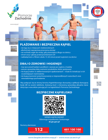 PLAŻOWANIE I BEZPIECZNA KĄPIEL - nie kąp się w miejscach niedozwolonych - alkohol jest najczęstszą przyczyną utonięć - nie wchodź nagle do wody, gdy pozostajesz długo na słońcu - chroń oczy i głowę przed promieniami UV - nakładaj krem z filtrem około 15-20 minut przed wyjściem na słońce DBAJ O ZDROWIE I HIGIENĘ!!! - myj ręce przed każdym posiłkiem i zawsze po wyjściu z toalety - zawsze sprawdzaj datę ważności produktów, które spożywasz - nie kupuj lodów w zdeformowanych opakowaniach – może to świadczyć o ich wcześniejszym rozmrożeniu - nie kupuj żywności przechowywanej w nieprawidłowych warunkach oraz niewiadomego pochodzenia Aby połączyć się ze stroną Serwisu Kąpieliskowego skorzystaj z aplikacji skanującej kody QR na swoim telefonie. Zeskanuj kod i z łatwością sprawdzaj aktualne dane dotyczące warunków panujących na kąpieliskach Pomorza Zachodniego SERWIS KĄPIELISKOWY Głównego Inspektoratu Sanitarnego sk.gis.gov.pl Numery alarmowe: www.bezpieczenstwo.wzp.pl • www.wsse.szczecin.pl Sfinansowano ze środków Samorządu Województwa Zachodniopomorskiego BEZPIECZNE KĄPIELISKO