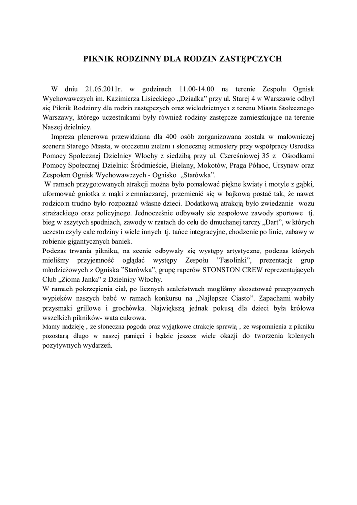 PIKNIK RODZINNY DLA RODZIN ZASTĘPCZYCH W dniu 21.05.2011r. w godzinach 11.00-14.00 na terenie Zespołu Ognisk Wychowawczych im. Kazimierza Lisieckiego „Dziadka” przy ul. Starej 4 w Warszawie odbył się Piknik Rodzinny dla rodzin zastępczych oraz wielodzietnych z terenu Miasta Stołecznego Warszawy, którego uczestnikami były również rodziny zastępcze zamieszkujące na terenie Naszej dzielnicy. Impreza plenerowa przewidziana dla 400 osób zorganizowana została w malowniczej scenerii Starego Miasta, w otoczeniu zieleni i słonecznej atmosfery przy współpracy Ośrodka Pomocy Społecznej Dzielnicy Włochy z siedzibą przy ul. Czereśniowej 35 z Ośrodkami Pomocy Społecznej Dzielnic: Śródmieście, Bielany, Mokotów, Praga Północ, Ursynów oraz Zespołem Ognisk Wychowawczych - Ognisko „Starówka”. W ramach przygotowanych atrakcji można było pomalować piękne kwiaty i motyle z gąbki, uformować gniotka z mąki ziemniaczanej, przemienić się w bajkową postać tak, że nawet rodzicom trudno było rozpoznać własne dzieci. Dodatkową atrakcją było zwiedzanie wozu strażackiego oraz policyjnego. Jednocześnie odbywały się zespołowe zawody sportowe tj. bieg w zszytych spodniach, zawody w rzutach do celu do dmuchanej tarczy „Dart”, w których uczestniczyły całe rodziny i wiele innych tj. tańce integracyjne, chodzenie po linie, zabawy w robienie gigantycznych baniek. Podczas trwania pikniku, na scenie odbywały się występy artystyczne, podczas których mieliśmy przyjemność oglądać występy Zespołu ”Fasolinki”, prezentacje grup młodzieżowych z Ogniska ”Starówka”, grupę raperów STONSTON CREW reprezentujących Club „Zioma Janka” z Dzielnicy Włochy. W ramach pokrzepienia ciał, po licznych szaleństwach mogliśmy skosztować przepysznych wypieków naszych babć w ramach konkursu na „Najlepsze Ciasto”. Zapachami wabiły przysmaki grillowe i grochówka. Największą jednak pokusą dla dzieci była królowa wszelkich pikników- wata cukrowa. Mamy nadzieję , że słoneczna pogoda oraz wyjątkowe atrakcje sprawią , że wspomnienia z pikniku pozostaną długo w naszej pamięci i będzie jeszcze wiele okazji do tworzenia kolenych pozytywnych wydarzeń.