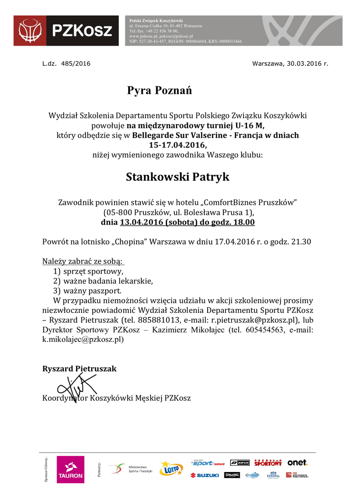 Polski Związek Koszykówki ul. Erazma Ciołka 10, 01-402 Warszawa Tel./fax. +48 22 836 38 00, www.pzkosz.pl, [email protected] NIP: 527-20-43-457, REGON: 000866604, KRS: 0000033466 L.dz. 485/2016 Warszawa, 30.03.2016 r. Pyra Poznań Wydział Szkolenia Departamentu Sportu Polskiego Związku Koszykówki powołuje na międzynarodowy turniej U-16 M, który odbędzie się w Bellegarde Sur Valserine - Francja w dniach 15-17.04.2016, niżej wymienionego zawodnika Waszego klubu: Stankowski Patryk Zawodnik powinien stawić się w hotelu „ComfortBiznes Pruszków” (05-800 Pruszków, ul. Bolesława Prusa 1), dnia 13.04.2016 (sobota) do godz. 18.00 Powrót na lotnisko „Chopina” Warszawa w dniu 17.04.2016 r. o godz. 21.30 Należy zabrać ze sobą: 1) sprzęt sportowy, 2) ważne badania lekarskie, 3) ważny paszport. W przypadku niemożności wzięcia udziału w akcji szkoleniowej prosimy niezwłocznie powiadomić Wydział Szkolenia Departamentu Sportu PZKosz – Ryszard Pietruszak (tel. 885881013, e-mail: [email protected]), lub Dyrektor Sportowy PZKosz – Kazimierz Mikołajec (tel. 605454563, e-mail: [email protected]) Ryszard Pietruszak Partnerzy: Sponsor Główny: Koordynator Koszykówki Męskiej PZKosz