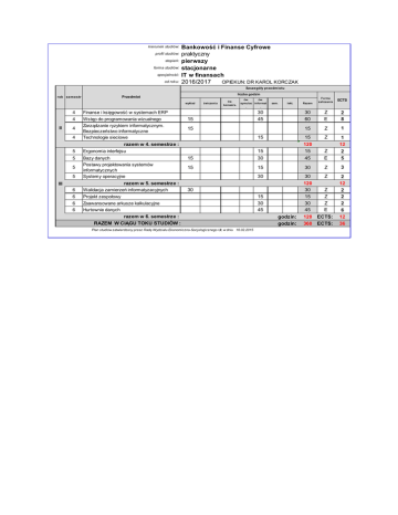 kierunek studiów: profil studiów: stopień: forma studiów: specjalność: od roku: Bankowość i Finanse Cyfrowe praktyczny pierwszy stacjonarne IT w finansach OPIEKUN: DR KAROL KORCZAK 2016/2017 Szczegóły przedm iotu liczba godzin Przedmiot rok semestr wykład II 4 Finanse i księgowość w systemach ERP 4 4 Wstęp do programowania wizualnego Zarządzanie ryzykiem informatycznym. Bezpieczeństwo informatyczne Technologie sieciowe 5 Ergonomia interfejsu 5 5 Bazy danych Postawy projektowania systemów informatycznych Systemy operacyjne 6 Walidacja zamierzeń informatyzacyjnych 6 Projekt zespołowy 6 Zaawansowane arkusze kalkulacyjne 6 Hurtownie danych 4 ćwiczenia ćw. konwers. ćw. ćw. symulac informat . . 15 sem. lekt. ECTS Z E 2 8 30 60 15 Z 1 15 Z 1 12 Z E 2 5 Z 15 15 15 30 15 120 15 45 15 15 30 30 30 Z 120 30 Z 15 Z 30 Z 45 E 120p. ECTS: 360p. ECTS: razem w 5. semestrze : III Forma zaliczenia 30 45 razem w 4. semestrze : 5 Razem 30 razem w 6. semestrze : RAZEM W CIĄGU TOKU STUDIÓW : Plan studiów zatwierdzony przez Radę Wydziału Ekonomiczno-Socjologicznego UŁ w dniu 16.02.2015 15 30 45 godzin: godzin: 3 2 12 2 2 2 6 12 36