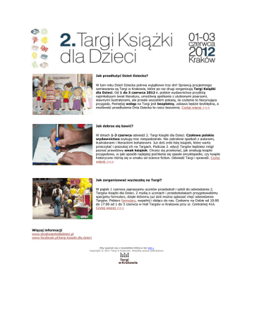 Jak przedłużyć Dzień Dziecka? W tym roku Dzień Dziecka potrwa wyjątkowo trzy dni! Sprawcą przyjemnego zamieszania są Targi w Krakowie, które po raz drugi zorganizują Targi Książki dla Dzieci. Od 1 do 3 czerwca 2012 r. polskie wydawnictwa przybliżą najmłodszym świat literatury, umożliwią spotkanie z ulubionymi pisarzami, sławnymi ilustratorami, ale przede wszystkim pokażą, że czytanie to fascynująca przygoda. Pamiętaj wstęp na Targi jest bezpłatny, zabawa będzie bezbłędna, a możliwość przedłużenia Dnia Dziecka to rzecz bezcenna. Czytaj więcej >>> Jak dobrze się bawić? W dniach 1-3 czerwca odwiedź 2. Targi Książki dla Dzieci. Czołowe polskie wydawnictwa szykują moc niespodzianek. Nie zabraknie spotkań z autorami, ilustratorami i literackimi bohaterami. Już dziś zrób listę książek, które warto przeczytać i poszukaj ich na Targach. Podczas 2. edycji Targów będziesz mógł poznać prawdziwy smak książek. Chcesz się przekonać, jak smakują książki przygodowe, w jaki sposób najlepiej pochłania się opasłe encyklopedie, czy książki historyczne różnią się w smaku od science fiction. Odwiedź Targi i sprawdź. Czytaj więcej >>> Jak zorganizować wycieczkę na Targi? W piątek 1 czerwca zapraszamy uczniów przedszkoli i szkół do odwiedzenia 2. Targów Książki dla Dzieci. Z myślą o uczniach i przedszkolakach przygotowaliśmy specjalny formularz, dzięki któremu już dziś można zgłaszać chęć odwiedzenia Targów. Pobierz formularz, wypełnij i dołącz do nas. Czekamy na Ciebie od 10:00 do 17:00 od 1 do 3 czerwca w Hali Targów w Krakowie przy ul. Centralnej 41A. Czytaj więcej >>> Więcej informacji www.targiksiazkidladzieci.pl www.facebook.pl/targi.ksiazki.dla.dzieci Aby wypisać się z newslettera kliknij w ten link » Copyright © 2011 Targi w Krakowie. Wszelkie prawa zastrzeżone.