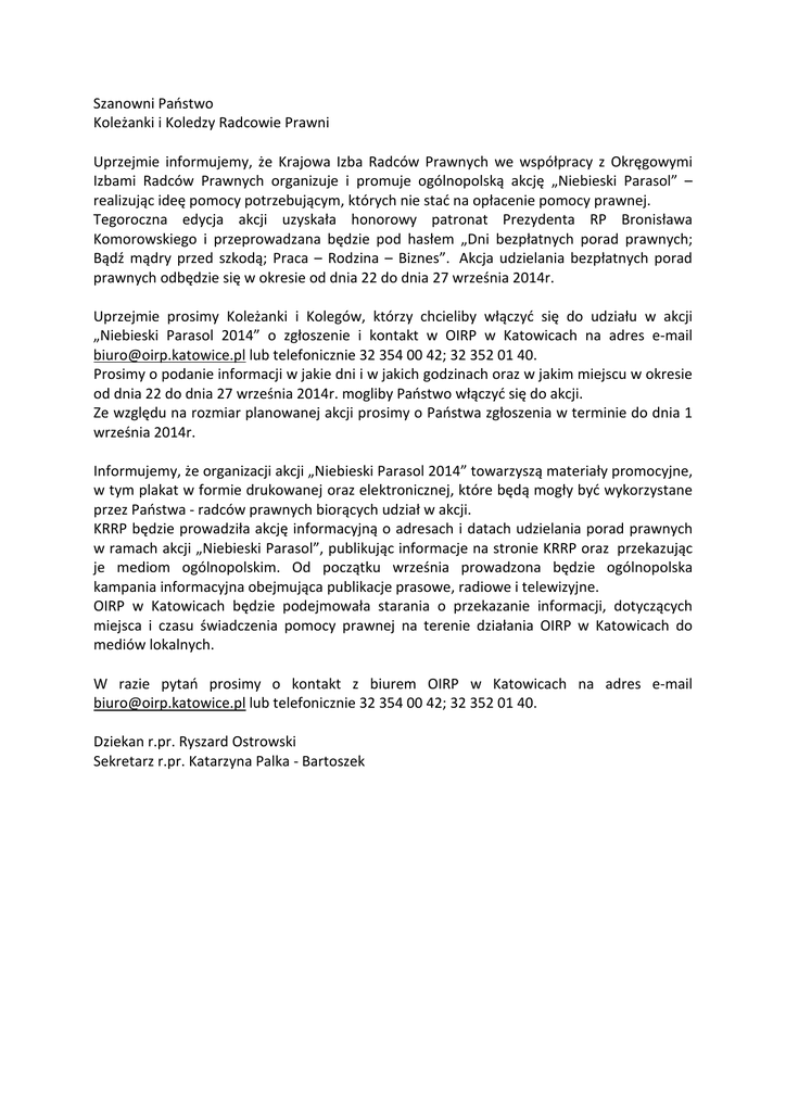 Szanowni Państwo Koleżanki i Koledzy Radcowie Prawni Uprzejmie informujemy, że Krajowa Izba Radców Prawnych we współpracy z Okręgowymi Izbami Radców Prawnych organizuje i promuje ogólnopolską akcję „Niebieski Parasol” – realizując ideę pomocy potrzebującym, których nie stać na opłacenie pomocy prawnej. Tegoroczna edycja akcji uzyskała honorowy patronat Prezydenta RP Bronisława Komorowskiego i przeprowadzana będzie pod hasłem „Dni bezpłatnych porad prawnych; Bądź mądry przed szkodą; Praca – Rodzina – Biznes”. Akcja udzielania bezpłatnych porad prawnych odbędzie się w okresie od dnia 22 do dnia 27 września 2014r. Uprzejmie prosimy Koleżanki i Kolegów, którzy chcieliby włączyć się do udziału w akcji „Niebieski Parasol 2014” o zgłoszenie i kontakt w OIRP w Katowicach na adres e-mail [email protected] lub telefonicznie 32 354 00 42; 32 352 01 40. Prosimy o podanie informacji w jakie dni i w jakich godzinach oraz w jakim miejscu w okresie od dnia 22 do dnia 27 września 2014r. mogliby Państwo włączyć się do akcji. Ze względu na rozmiar planowanej akcji prosimy o Państwa zgłoszenia w terminie do dnia 1 września 2014r. Informujemy, że organizacji akcji „Niebieski Parasol 2014” towarzyszą materiały promocyjne, w tym plakat w formie drukowanej oraz elektronicznej, które będą mogły być wykorzystane przez Państwa - radców prawnych biorących udział w akcji. KRRP będzie prowadziła akcję informacyjną o adresach i datach udzielania porad prawnych w ramach akcji „Niebieski Parasol”, publikując informacje na stronie KRRP oraz przekazując je mediom ogólnopolskim. Od początku września prowadzona będzie ogólnopolska kampania informacyjna obejmująca publikacje prasowe, radiowe i telewizyjne. OIRP w Katowicach będzie podejmowała starania o przekazanie informacji, dotyczących miejsca i czasu świadczenia pomocy prawnej na terenie działania OIRP w Katowicach do mediów lokalnych. W razie pytań prosimy o kontakt z biurem OIRP w Katowicach na adres e-mail [email protected] lub telefonicznie 32 354 00 42; 32 352 01 40. Dziekan r.pr. Ryszard Ostrowski Sekretarz r.pr. Katarzyna Palka - Bartoszek