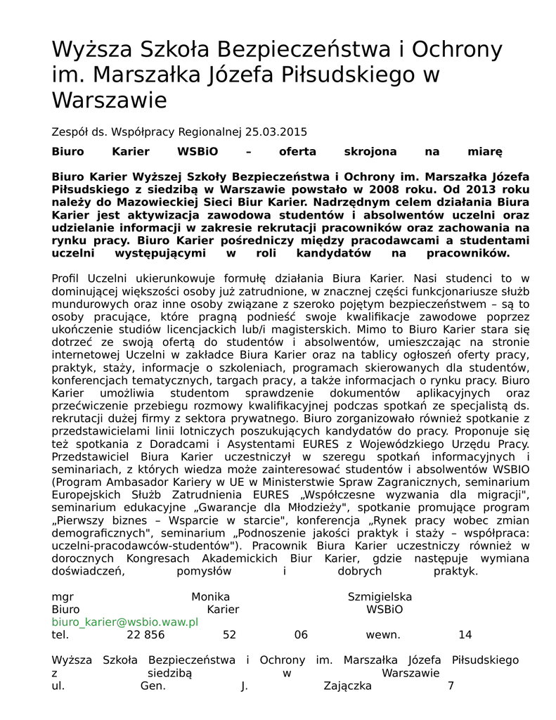 Wyższa Szkoła Bezpieczeństwa i Ochrony im. Marszałka Józefa Piłsudskiego w Warszawie Zespół ds. Współpracy Regionalnej 25.03.2015 Biuro Karier WSBiO – oferta skrojona na miarę Biuro Karier Wyższej Szkoły Bezpieczeństwa i Ochrony im. Marszałka Józefa Piłsudskiego z siedzibą w Warszawie powstało w 2008 roku. Od 2013 roku należy do Mazowieckiej Sieci Biur Karier. Nadrzędnym celem działania Biura Karier jest aktywizacja zawodowa studentów i absolwentów uczelni oraz udzielanie informacji w zakresie rekrutacji pracowników oraz zachowania na rynku pracy. Biuro Karier pośredniczy między pracodawcami a studentami uczelni występującymi w roli kandydatów na pracowników. Profil Uczelni ukierunkowuje formułę działania Biura Karier. Nasi studenci to w dominującej większości osoby już zatrudnione, w znacznej części funkcjonariusze służb mundurowych oraz inne osoby związane z szeroko pojętym bezpieczeństwem – są to osoby pracujące, które pragną podnieść swoje kwalifikacje zawodowe poprzez ukończenie studiów licencjackich lub/i magisterskich. Mimo to Biuro Karier stara się dotrzeć ze swoją ofertą do studentów i absolwentów, umieszczając na stronie internetowej Uczelni w zakładce Biura Karier oraz na tablicy ogłoszeń oferty pracy, praktyk, staży, informacje o szkoleniach, programach skierowanych dla studentów, konferencjach tematycznych, targach pracy, a także informacjach o rynku pracy. Biuro Karier umożliwia studentom sprawdzenie dokumentów aplikacyjnych oraz przećwiczenie przebiegu rozmowy kwalifikacyjnej podczas spotkań ze specjalistą ds. rekrutacji dużej firmy z sektora prywatnego. Biuro zorganizowało również spotkanie z przedstawicielami linii lotniczych poszukujących kandydatów do pracy. Proponuje się też spotkania z Doradcami i Asystentami EURES z Wojewódzkiego Urzędu Pracy. Przedstawiciel Biura Karier uczestniczył w szeregu spotkań informacyjnych i seminariach, z których wiedza może zainteresować studentów i absolwentów WSBIO (Program Ambasador Kariery w UE w Ministerstwie Spraw Zagranicznych, seminarium Europejskich Służb Zatrudnienia EURES „Współczesne wyzwania dla migracji", seminarium edukacyjne „Gwarancje dla Młodzieży", spotkanie promujące program „Pierwszy biznes – Wsparcie w starcie", konferencja „Rynek pracy wobec zmian demograficznych", seminarium „Podnoszenie jakości praktyk i staży – współpraca: uczelni-pracodawców-studentów"). Pracownik Biura Karier uczestniczy również w dorocznych Kongresach Akademickich Biur Karier, gdzie następuje wymiana doświadczeń, pomysłów i dobrych praktyk. mgr Monika Biuro Karier [email protected] tel. 22 856 52 Szmigielska WSBiO 06 wewn. 14 Wyższa Szkoła Bezpieczeństwa i Ochrony im. Marszałka Józefa Piłsudskiego z siedzibą w Warszawie ul. Gen. J. Zajączka 7 01-518 www.wsbio.waw.pl Warszawa