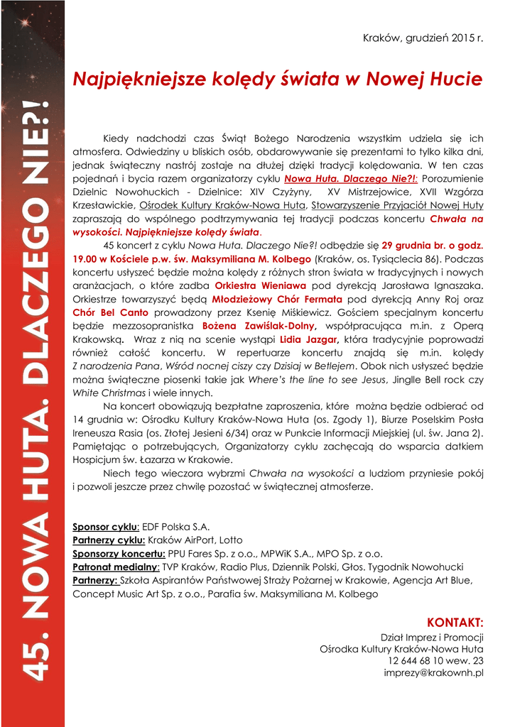 Kraków, grudzień 2015 r. Najpiękniejsze kolędy świata w Nowej Hucie Kiedy nadchodzi czas Świąt Bożego Narodzenia wszystkim udziela się ich atmosfera. Odwiedziny u bliskich osób, obdarowywanie się prezentami to tylko kilka dni, jednak świąteczny nastrój zostaje na dłużej dzięki tradycji kolędowania. W ten czas pojednań i bycia razem organizatorzy cyklu Nowa Huta. Dlaczego Nie?!: Porozumienie Dzielnic Nowohuckich - Dzielnice: XIV Czyżyny, XV Mistrzejowice, XVII Wzgórza Krzesławickie, Ośrodek Kultury Kraków-Nowa Huta, Stowarzyszenie Przyjaciół Nowej Huty zapraszają do wspólnego podtrzymywania tej tradycji podczas koncertu Chwała na wysokości. Najpiękniejsze kolędy świata. 45 koncert z cyklu Nowa Huta. Dlaczego Nie?! odbędzie się 29 grudnia br. o godz. 19.00 w Kościele p.w. św. Maksymiliana M. Kolbego (Kraków, os. Tysiąclecia 86). Podczas koncertu usłyszeć będzie można kolędy z różnych stron świata w tradycyjnych i nowych aranżacjach, o które zadba Orkiestra Wieniawa pod dyrekcją Jarosława Ignaszaka. Orkiestrze towarzyszyć będą Młodzieżowy Chór Fermata pod dyrekcją Anny Roj oraz Chór Bel Canto prowadzony przez Ksenię Miśkiewicz. Gościem specjalnym koncertu będzie mezzosopranistka Bożena Zawiślak-Dolny, współpracująca m.in. z Operą Krakowską. Wraz z nią na scenie wystąpi Lidia Jazgar, która tradycyjnie poprowadzi również całość koncertu. W repertuarze koncertu znajdą się m.in. kolędy Z narodzenia Pana, Wśród nocnej ciszy czy Dzisiaj w Betlejem. Obok nich usłyszeć będzie można świąteczne piosenki takie jak Where’s the line to see Jesus, Jinglle Bell rock czy White Christmas i wiele innych. Na koncert obowiązują bezpłatne zaproszenia, które można będzie odbierać od 14 grudnia w: Ośrodku Kultury Kraków-Nowa Huta (os. Zgody 1), Biurze Poselskim Posła Ireneusza Rasia (os. Złotej Jesieni 6/34) oraz w Punkcie Informacji Miejskiej (ul. św. Jana 2). Pamiętając o potrzebujących, Organizatorzy cyklu zachęcają do wsparcia datkiem Hospicjum św. Łazarza w Krakowie. Niech tego wieczora wybrzmi Chwała na wysokości a ludziom przyniesie pokój i pozwoli jeszcze przez chwilę pozostać w świątecznej atmosferze. Sponsor cyklu: EDF Polska S.A. Partnerzy cyklu: Kraków AirPort, Lotto Sponsorzy koncertu: PPU Fares Sp. z o.o., MPWiK S.A., MPO Sp. z o.o. Patronat medialny: TVP Kraków, Radio Plus, Dziennik Polski, Głos. Tygodnik Nowohucki Partnerzy: Szkoła Aspirantów Państwowej Straży Pożarnej w Krakowie, Agencja Art Blue, Concept Music Art Sp. z o.o., Parafia św. Maksymiliana M. Kolbego KONTAKT: Dział Imprez i Promocji Ośrodka Kultury Kraków-Nowa Huta 12 644 68 10 wew. 23 [email protected]