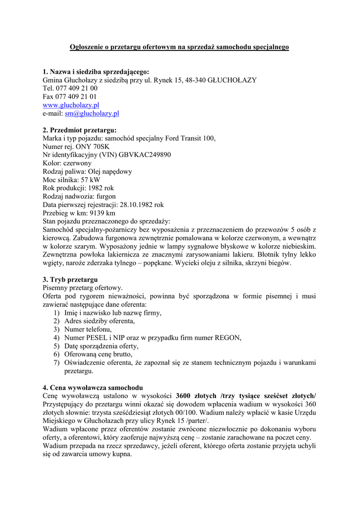 Ogłoszenie o przetargu ofertowym na sprzedaż samochodu specjalnego 1. Nazwa i siedziba sprzedającego: Gmina Głuchołazy z siedzibą przy ul. Rynek 15, 48-340 GŁUCHOŁAZY Tel. 077 409 21 00 Fax 077 409 21 01 www.glucholazy.pl e-mail: [email protected] 2. Przedmiot przetargu: Marka i typ pojazdu: samochód specjalny Ford Transit 100, Numer rej. ONY 70SK Nr identyfikacyjny (VIN) GBVKAC249890 Kolor: czerwony Rodzaj paliwa: Olej napędowy Moc silnika: 57 kW Rok produkcji: 1982 rok Rodzaj nadwozia: furgon Data pierwszej rejestracji: 28.10.1982 rok Przebieg w km: 9139 km Stan pojazdu przeznaczonego do sprzedaży: Samochód specjalny-pożarniczy bez wyposażenia z przeznaczeniem do przewozów 5 osób z kierowcą. Zabudowa furgonowa zewnętrznie pomalowana w kolorze czerwonym, a wewnątrz w kolorze szarym. Wyposażony jednie w lampy sygnałowe błyskowe w kolorze niebieskim. Zewnętrzna powłoka lakiernicza ze znacznymi zarysowaniami lakieru. Błotnik tylny lekko wgięty, naroże zderzaka tylnego – popękane. Wycieki oleju z silnika, skrzyni biegów. 3. Tryb przetargu Pisemny przetarg ofertowy. Oferta pod rygorem nieważności, powinna być sporządzona w formie pisemnej i musi zawierać następujące dane oferenta: 1) Imię i nazwisko lub nazwę firmy, 2) Adres siedziby oferenta, 3) Numer telefonu, 4) Numer PESEL i NIP oraz w przypadku firm numer REGON, 5) Datę sporządzenia oferty, 6) Oferowaną cenę brutto, 7) Oświadczenie oferenta, że zapoznał się ze stanem technicznym pojazdu i warunkami przetargu. 4. Cena wywoławcza samochodu Cenę wywoławczą ustalono w wysokości 3600 złotych /trzy tysiące sześćset złotych/ Przystępujący do przetargu winni okazać się dowodem wpłacenia wadium w wysokości 360 złotych słownie: trzysta sześćdziesiąt złotych 00/100. Wadium należy wpłacić w kasie Urzędu Miejskiego w Głuchołazach przy ulicy Rynek 15 /parter/. Wadium wpłacone przez oferentów zostanie zwrócone niezwłocznie po dokonaniu wyboru oferty, a oferentowi, który zaoferuje najwyższą cenę – zostanie zarachowane na poczet ceny. Wadium przepada na rzecz sprzedawcy, jeżeli oferent, którego oferta zostanie przyjęta uchyli się od zawarcia umowy kupna. 5. Termin, miejsce i tryb złożenia oferty: Ofertę należy złożyć w zamkniętej kopercie, adresowanej według wzoru: Gmina Głuchołazy ul. Rynek 15 48 – 340 GŁUCHOŁAZY „Oferta na zakup samochodu Ford Transit” – nie otwierać przed dniem 15.03.2016 roku do godz. 12.15 Ofertę należy przesłać listownie pod wskazany adres lub złożyć w Urzędzie Miejskim w Głuchołazach, ulica Rynek 15, 48 – 340 Głuchołazy /sekretariat/. Ostateczny termin składania ofert ustala się na 15.03.2016 roku do godziny 12.00 Oferty złożone po wyznaczonej dacie nie będą rozpatrywane. W przypadku złożenia równorzędnych ofert o najwyższej wartości, komisja przetargowa zorganizuje dodatkowy przetarg ustny ograniczony dla oferentów, którzy złożyli te oferty, z kwotą postąpienia nie niższą niż 50 zł. Komisja zawiadomi oferentów, o których mowa o terminie dodatkowego przetargu. 6. Miejsce i termin przeprowadzenia przetargu: Otwarcie ofert nastąpi przez komisję przetargową w dniu 15.03.2016 roku o godz. 12.15 /piątek/ w pokoju nr 31, w Urzędzie Miejskim w Głuchołazach, ulica Rynek 15, 48 – 340 Głuchołazy. 7. Miejsce i termin, w którym można obejrzeć przedmiot przetargu: OSP Markowice Gm. Głuchołazy. Pojazd będzie udostępniony zainteresowanym w dniach 01.03.2016 – 15.03.2016, w godzinach od 09.00-14.00. Osoba do kontaktu: Piotr Pawlikowski tel. kontaktowy 66567309777 8. Organizatorowi przetargu przysługuje prawo zamknięcia przetargu bez wybrania którejkolwiek z ofert. 9. Inne informacje: 1) Komisja przetargowa wybierze oferenta, który zaoferuje najwyższa cenę na pojazd będący przedmiotem przetargu. 2) Data podpisania umowy kupna – sprzedaży zostanie wyznaczona niezwłocznie po pozytywnym zakończeniu przetargu. 3) Nabywca jest zobowiązany zapłacić cenę nabycia pojazdu przed podpisaniem umowy kupna – sprzedaży pod rygorem utraty wadium. 4) Wydanie przedmiotu sprzedaży nabywcy nastąpi niezwłocznie po podpisaniu umowy kupna – sprzedaży. Załączone dokumenty – pliki do pobrania: Treść ogłoszenia na sprzedaż – Ford Transit Załącznik nr 1 – Oświadczenie – oferta Załącznik nr 2 – umowa kupna-sprzedaży samochodu