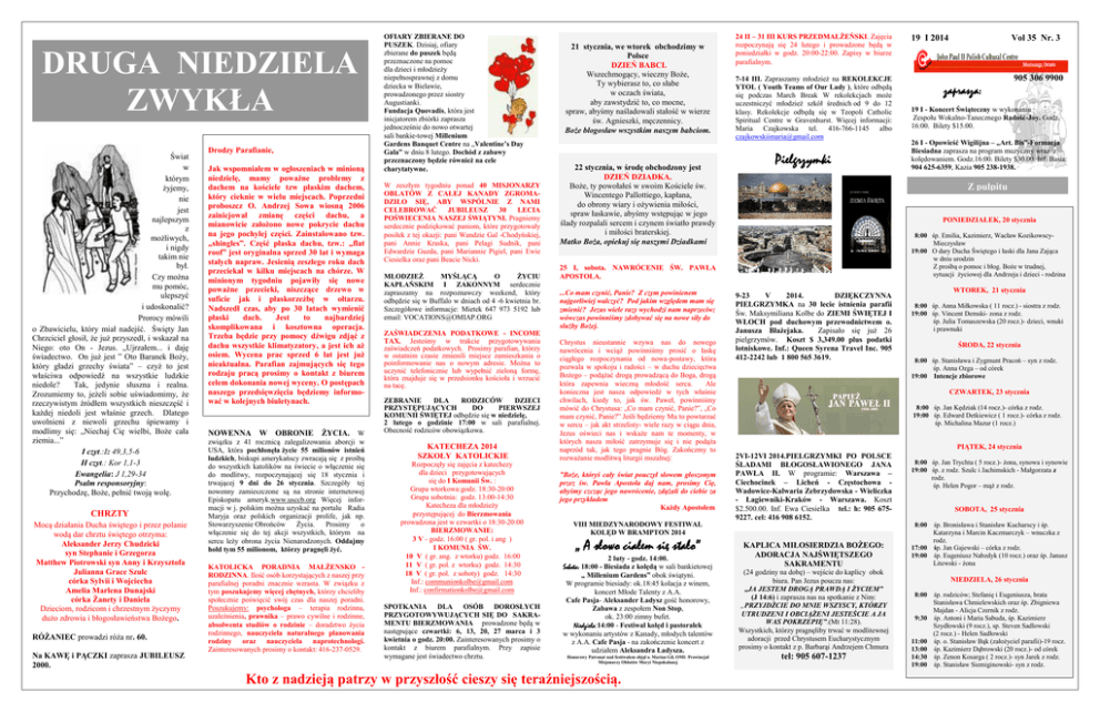 DRUGA NIEDZIELA ZWYKŁA Świat w którym żyjemy, nie jest najlepszym z możliwych, i nigdy takim nie był. Czy można mu pomóc, ulepszyć i udoskonalić? Prorocy mówili o Zbawicielu, który miał nadejść. Święty Jan Chrzciciel głosił, że już przyszedł, i wskazał na Niego: oto On - Jezus. „Ujrzałem... i daję świadectwo. On już jest ” Oto Baranek Boży, który gładzi grzechy świata” – czyż to jest właściwa odpowiedź na wszystkie ludzkie niedole? Tak, jedynie słuszna i realna. Zrozumiemy to, jeżeli sobie uświadomimy, że rzeczywistym źródłem wszystkich nieszczęść i każdej niedoli jest właśnie grzech. Dlatego uwolnieni z niewoli grzechu śpiewamy i modlimy się: „Niechaj Cię wielbi, Boże cała ziemia...” I czyt.:Iz 49,3,5-6 II czyt.: Kor 1,1-3 Ewangelia: J 1,29-34 Psalm responsoryjny: Przychodzę, Boże, pełnić twoją wolę. CHRZTY Mocą działania Ducha świętego i przez polanie wodą dar chrztu świętego otrzyma: Aleksander Jerzy Chudzicki syn Stephanie i Grzegorza Matthew Piotrowski syn Anny i Krzysztofa Julianna Grace Szulc córka Sylvii i Wojciecha Amelia Marlena Dunajski córka Żanety i Daniela Dzieciom, rodzicom i chrzestnym życzymy dużo zdrowia i błogosławieństwa Bożego. RÓŻANIEC prowadzi róża nr. 60. Na KAWĘ i PĄCZKI zaprasza JUBILEUSZ 2000. Drodzy Parafianie, Jak wspomniałem w ogłoszeniach w minioną niedzielę, mamy poważne problemy z dachem na kościele tzw płaskim dachem, który cieknie w wielu miejscach. Poprzedni proboszcz O. Andrzej Sowa wiosną 2006 zainicjował zmianę części dachu, a mianowicie założono nowe pokrycie dachu na jego pochyłej części. Zainstalowano tzw. „shingles”. Część płaska dachu, tzw.: „flat roof” jest oryginalna sprzed 30 lat i wymaga stałych napraw. Jesienią zeszłego roku dach przeciekał w kilku miejscach na chórze. W minionym tygodniu pojawiły się nowe poważne przecieki, niszczące drzewo w suficie jak i płaskorzeźbę w ołtarzu. Nadszedł czas, aby po 30 latach wymienić płaski dach. Jest to najbardziej skomplikowana i kosztowna operacja. Trzeba będzie przy pomocy dźwigu zdjąć z dachu wszystkie klimatyzatory, a jest ich aż osiem. Wycena prac sprzed 6 lat jest już nieaktualna. Parafian zajmujących się tego rodzaju pracą prosimy o kontakt z biurem celem dokonania nowej wyceny. O postępach naszego przedsięwzięcia będziemy informować w kolejnych biuletynach. ŻYCIA. W związku z 41 rocznicą zalegalizowania aborcji w USA, która pochłonęła życie 55 milionów istnień ludzkich, biskupi amerykańscy zwracają się z prośbą do wszystkich katolików na świecie o włączenie się do modlitwy, rozpoczynającej się 18 stycznia i trwającej 9 dni do 26 stycznia. Szczegóły tej nowenny zamieszczone są na stronie internetowej Episkopatu ameryk.www.usccb.org Więcej informacji w j. polskim można uzyskać na portalu Radia Maryja oraz polskich organizacji prolife, jak np. Stowarzyszenie Obrońców Życia. Prosimy o włączenie się do tej akcji wszystkich, którym na sercu leży obrona życia Nienarodzonych. Oddajmy hołd tym 55 milionom, którzy pragnęli żyć. NOWENNA W OBRONIE KATOLICKA PORADNIA MAŁŻENSKO RODZINNA. Ilość osób korzystających z naszej przy parafialnej poradni znacznie wzrasta. W związku z tym poszukujemy więcej chętnych, którzy chcieliby społecznie poświęcić swój czas dla naszej poradni. Poszukujemy: psychologa – terapia rodzinna, uzależnienia, prawnika – prawo cywilne i rodzinne, absolwenta studiów o rodzinie – doradztwo życia rodzinnego, nauczyciela naturalnego planowania rodziny oraz nauczyciela naprotechnologi. Zainteresowanych prosimy o kontakt: 416-237-0529. OFIARY ZBIERANE DO PUSZEK. Dzisiaj, ofiary zbierane do puszek będą przeznaczone na pomoc dla dzieci i młodzieży niepełnosprawnej z domu dziecka w Bielawie, prowadzonego przez siostry Augustianki. Fundacja Quovadis, która jest inicjatorem zbiórki zaprasza jednocześnie do nowo otwartej sali bankie-towej Millenium Gardens Banquet Centre na „Valentine’s Day Gala” w dniu 8 lutego. Dochód z zabawy przeznaczony będzie również na cele charytatywne. W zeszłym tygodniu ponad 40 MISJONARZY OBLATÓW Z CAŁEJ KANADY ZGROMADZIŁO SIĘ, ABY WSPÓLNIE Z NAMI CELEBROWAĆ JUBILEUSZ 30 LECIA POŚWIECENIA NASZEJ ŚWIĄTYNI. Pragniemy serdecznie podziękować paniom, które przygotowały posiłek z tej okazji: pani Wandzie Gal -Chodyńskiej, pani Annie Kraska, pani Pelagi Sudnik, pani Edwardzie Guzda, pani Mariannie Pigiel, pani Ewie Ciesielka oraz pani Beacie Nicki. MŁODZIEŻ MYŚLĄCĄ O ŻYCIU KAPŁAŃSKIM I ZAKONNYM serdecznie zapraszamy na rozpoznawczy weekend, który odbędzie się w Buffalo w dniach od 4 -6 kwietnia br. Szczegółowe informacje: Mietek 647 973 5192 lub email: [email protected] ZAŚWIADCZENIA PODATKOWE - INCOME TAX. Jesteśmy w trakcie przygotowywania zaświadczeń podatkowych. Prosimy parafian, którzy w ostatnim czasie zmienili miejsce zamieszkania o poinformowanie nas o nowym adresie. Można to uczynić telefonicznie lub wypełnić zieloną formę, która znajduje się w przedsionku kościoła i wrzucić na tacę. ZEBRANIE DLA RODZICÓW DZIECI PRZYSTĘPUJĄCYCH DO PIERWSZEJ KOMUNII ŚWIĘTEJ odbędzie się w niedzielę, 2 lutego o godzinie 17:00 w sali parafialnej. Obecność rodziców obowiązkowa. KATECHEZA 2014 SZKOŁY KATOLICKIE Rozpoczęły się zajęcia z katechezy dla dzieci przygotowujących się do I Komunii Św. : Grupa wtorkowa:godz. 18:30-20:00 Grupa sobotnia: godz. 13:00-14:30 Katecheza dla młodzieży przystępującej do Bierzmowania prowadzona jest w czwartki o 18:30-20:00 BIERZMOWANIE: 3 V - godz. 16:00 ( gr. pol. i ang ) I KOMUNIA ŚW. 10 V ( gr. ang. z wtorku) godz. 16:00 11 V ( gr. pol. z wtorku) godz. 14:30 18 V ( gr. pol. z soboty) godz. 14:30 Inf.: [email protected] Inf.: [email protected] SPOTKANIA DLA OSÓB DOROSŁYCH PRZYGOTOWYWUJĄCYCH SIĘ DO SAKRAMENTU BIERZMOWANIA prowadzone będą w nastę
