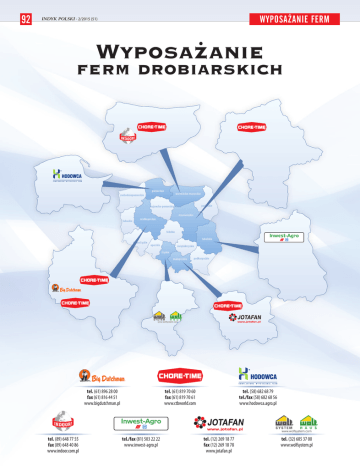 92 WYPOSA˚ANIE FERM INDYK POLSKI - 2/2015 (51) Wyposa˝anie ferm drobiarskich www.wolfsystem.com tel. (61) 896 28 00 fax (61) 816 44 51 www.bigdutchman.pl tel. (61) 819 70 60 fax (61) 819 70 61 www.ctbworld.com tel. (58) 682 68 79 tel./fax (58) 682 68 56 www.hodowca.agro.pl www.wolfsystem.com tel. (89) 648 77 55 fax (89) 648 40 86 www.indoor.com.pl tel./fax (81) 503 22 22 www.inwest-agro.pl tel. (12) 269 18 77 fax (12) 269 18 78 www.jotafan.pl tel. (32) 605 37 00 www.wolfsystem.pl WYPOSA˚ANIE FERM e JOTAFAN Andrzej Zagórski ul. Zakopiańska 9, 30-418 Kraków tel. (12) 269 18 77 fax (12) 269 18 78 e-mail: [email protected] www.jotafan.pl 93 INDYK POLSKI - 2/2015 (51) e wagi dla drobiu: automatyczne i ręczne, oprogramowanie komputerowe dla wag, połączenie komputera z systemami ważenia przez Internet, montaż, uruchomienie, szkolenia sterownik„Pasza-Woda-Światło”dla procesu kontrolowanego żywienia brojlera e centrala alarmowa GSM, termometry i sygnalizatory alarmowe, zasilacze e sterowniki mikroklimatu e liczniki i sterowniki do wody i paszy e czujniki temperatury, wilgotności, dwutlenku węgla Kraków e oprawy świetlówkowe z regulacją natężenia światła, sterowniki oświetlenia e moduły rozszerzeń do sterowników (rozszerzenie sekcji płynnej, wlotów, itd.) Straszyn e e e Hodowca Sp. z o.o. ul. Starogardzka 70 83-010 Straszyn tel. (58) 682 68 79 tel./fax (58) 682 68 56 e e e karmidła dla indyków systemy wentylacji silosy paszowe paszociągi systemy pojenia automatyczne gniazda dla indyków firmy Vencomatic Kamień Duży k/Iławy e INDOOR Group Ltd Kamień Duży 4E, 14-200 Iława tel. (89) 648 77 55, 609 510 185 fax (89) 648 40 86 e-mail: [email protected] www.indoor.com.pl e e e e montaż i serwis urządzeń oraz systemów kompletne systemy: pojenia, zadawania paszy, ogrzewania, wentylacji, schładzania, ważenia, oświetlenia części i akcesoria sprzedaż wysyłkowa systemy karmienia e Inwest-Agro Tereszyn 25 koło Lublina 21-030 Motycz tel. / fax +48 81 503 22 22 [email protected] www.inwest-agro.pl www.wolfsystem.com Wolf System Sp. z o.o. ul. Budowlana 17 41–100 Siemianowice Śląskie tel. (32) 605 37 00 www.wolfsystem.pl systemy pojenia (smoczkowe, miseczkowe, dzwonowe) gniazda automatyczne Roxell e podajniki paszy e systemy wentylacji Skov e silosy paszowe – metalowe urządzenia do zamgławiania wysokociśnieniowego e oświetlenie energooszczędne e systemy ogrzewania e (brojlery, indyki, nioski, reprodukcja, kaczki, gęsi) e (nagrzewnice, promienniki) e Tereszyn dozowniki do leków i witamin Dosatron Nasi przedstawiciele: tel. +48 513 090 453 • 500 118 939 • 500 118 938 KUP ONLINE 500 11 89 34 Firma Wolf System jest europejskim liderem w budowie obiektów inwentarskich. Oferujemy kompleksową budowę konstrukcji nośnej kurników wraz z bocznymi systemami wentylacyjnymi przeznaczonych do hodowli: e indyków e brojlerów e kur niosek Ws Kurniki budujemy w systemach nośnych: e ram stalowych e ram stalowo-drewnianych e ścian prefabrykowanych + dach wiązarowy zystko z jednej rę ki Dodatkowo oferujemy zbiorniki na gnojowicę oraz zbiorniki przeznaczone do biogazowni. Siemianowice Śląskie