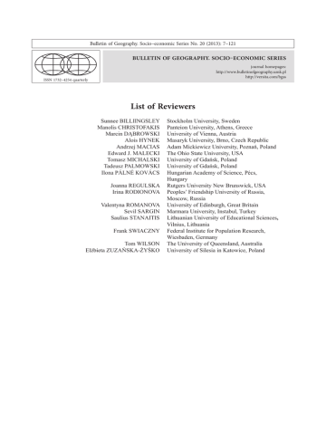 Bulletin of Geography. Socio–economic Series No. 20 (2013): 7–121 Bulletin of Geography. Socio–economic Series journal homepages: http://www.bulletinofgeography.umk.pl http://versita.com/bgss ISSN 1732–4254 quarterly List of Reviewers Sunnee BILLIINGSLEY Manolis CHRISTOFAKIS Marcin DĄBROWSKI Alois HYNEK Andrzej MACIAS Edward J. MALECKI Tomasz MICHALSKI Tadeusz PALMOWSKI Ilona PÁLNÉ KOVÁCS Joanna REGULSKA Irina RODIONOVA Valentyna ROMANOVA Sevil SARGIN Saulius STANAITIS Frank SWIACZNY Tom WILSON Elżbieta ZUZAŃSKA-ŻYŚKO Stockholm University, Sweden Panteion University, Athens, Greece University of Vienna, Austria Masaryk University, Brno, Czech Republic Adam Mickiewicz University, Poznań, Poland The Ohio State University, USA University of Gdańsk, Poland University of Gdańsk, Poland Hungarian Academy of Science, Pécs, Hungary Rutgers University New Brunswick, USA Peoples’ Friendship University of Russia, Moscow, Russia University of Edinburgh, Great Britain Marmara University, Instabul, Turkey Lithuanian University of Educational Sciences, Vilnius, Lithuania Federal Institute for Population Research, Wiesbaden, Germany The University of Queensland, Australia University of Silesia in Katowice, Poland