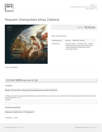 DUX S.J. Ul. Morskie Oko 2, 02-511 Warszawa +48 22 849 11 3 Requiem Staropolska Msza Żałobna Cena: 29,30 pln Opis słownikowy Kompozytorzy anonim, ∎, Siewiński, Andrzej ∎ Wykonawcy Myrczek, Adam ∎, Szostak, Anna ∎, Zespół Instrumentów Historycznych Parnassos ∎, Zespół Śpiewaków Miasta Katowice Camerata Silesia" ∎" Opis produktu CD DUX 0859Total time: [51:29] anonim Media Vita (anonim, kancjonał benedyktynek sandomierskich) 1. Media vita (anonim, kancjonał benedyktynek sandomierskich / anonymous, the cantionale of the psalm book of the Benedictine Nuns from Sandomierz, 1721) [03:03] Andrzej Siewiński Missa pro defunctis a 9 /Requiem/ 2. Requiem – Kyrie Plik wygenerowano: 08-03-2017 Oprogramowanie sklepu: AptusShop DUX S.J. Ul. Morskie Oko 2, 02-511 Warszawa +48 22 849 11 3 [05:14] 3. Graduale Requiem (chorał gregoriański / gregorian chant) [04:08] 4. Tractus Absolve (chorał gregoriański / gregorian chant) [03:08] 5. Dies irae [11:44] 6. Kazanie pogrzebne / Funeral sermon (ks. Baltazar Łabęcki, Wilno 1626, fragment) [08:44] 7. Domine Jesu [04:28] 8. Sanctus [05:56] 9. Agnus Dei [01:38] anonim Communio Lux aeterna (chorał gregoriański) 10. Communio Lux aeterna (chorał gregoriański / gregorian chant) [01:18] anonim Salve Regina (anonim, Sandomierz 1750) 11. Salve Regina (anonim / anonymous, Sandomierz 1750) [02:06] Wykonawcy: Zespół Instrumentów Historycznych Parnassos Zespół Śpiewaków Miasta Katowice Camerata Silesia Adam Myrczek /recytator/ Anna Szostak /dyrygent/ Plik wygenerowano: 08-03-2017 Oprogramowanie sklepu: AptusShop DUX S.J. Ul. Morskie Oko 2, 02-511 Warszawa +48 22 849 11 3 Plik wygenerowano: 08-03-2017 Powered by TCPDF (www.tcpdf.org) Oprogramowanie sklepu: AptusShop