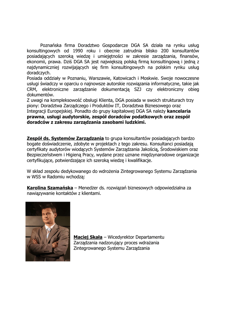 Poznańska firma Doradztwo Gospodarcze DGA SA działa na rynku usług konsultingowych od 1990 roku i obecnie zatrudnia blisko 200 konsultantów posiadających szeroką wiedzę i umiejętności w zakresie zarządzania, finansów, ekonomii, prawa. Dziś DGA SA jest największą polską firmą konsultingową i jedną z najdynamiczniej rozwijających się firm konsultingowych na polskim rynku usług doradczych. Posiada oddziały w Poznaniu, Warszawie, Katowicach i Moskwie. Swoje nowoczesne usługi świadczy w oparciu o najnowsze autorskie rozwiązania informatyczne, takie jak CRM, elektroniczne zarządzanie dokumentacją SZJ czy elektroniczny obieg dokumentów. Z uwagi na kompleksowość obsługi Klienta, DGA posiada w swoich strukturach trzy piony: Doradztwa Zarządczego i Produktów IT, Doradztwa Biznesowego oraz Integracji Europejskiej. Ponadto do grupy kapitałowej DGA SA należy kancelaria prawna, usługi audytorskie, zespół doradców podatkowych oraz zespół doradców z zakresu zarządzania zasobami ludzkimi. Zespół ds. Systemów Zarządzania to grupa konsultantów posiadających bardzo bogate doświadczenie, zdobyte w projektach z tego zakresu. Konsultanci posiadają certyfikaty audytorów wiodących Systemów Zarządzania Jakością, Środowiskiem oraz Bezpieczeństwem i Higieną Pracy, wydane przez uznane międzynarodowe organizacje certyfikujące, potwierdzające ich szeroką wiedzę i kwalifikacje. W skład zespołu dedykowanego do wdrożenia Zintegrowanego Systemu Zarządzania w WSS w Radomiu wchodzą: Karolina Szamańska – Menedżer ds. rozwiązań biznesowych odpowiedzialna za nawiązywanie kontaktów z klientami. Maciej Skała – Wicedyrektor Departamentu Zarządzania nadzorujący proces wdrażania Zintegrowanego Systemu Zarządzania Jakub Krysik – Starszy Konsultant Departamentu Zarządzania – Kierownik projektu wdrożenia, konsultant wdrażający Zintegrowany System Zarządzania w WSS w Radomiu. Katarzyna Galińska – Konsultant Departamentu Zarządzania – Odpowiedzialna za wdrożenie systemu HACCP w dziale żywienia oraz konsultant wdrażający Zintegrowany System Zarządzania w WSS Tomasz Mechelewski – Konsultant Departamentu Zarządzania – konsultant wdrażający Zintegrowany System Zarządzania w WSS W ramach realizowanego projektu DGA doradzało w zaprojektowaniu, opracowaniu, wdrożeniu i uruchomieniu Zintegrowanego Systemu Zarządzania, opartego na wymaganiach normy PN-EN ISO 9001:2001 oraz HACCP. Posiadając własne oprogramowanie, DGA zbudowało Systemu przy użyciu najlepszych technologii informatycznych dedykowanych do wspomagania zarządzania, zarówno w trakcie powstawania Systemu, jak również w trakcie jego doskonalenia. DGA Process - program do modelowania procesów, DGA Quality – oprogramowanie umożliwiające stworzenie przyjaznej dla użytkownika dokumentacji systemu zarządzania jakością Zastosowanie tych narzędzi pozwoliło na zachowanie spójności Systemu w każdym obszarze jego funkcjonowania, zoptymalizowanie czasu wdrożenia oraz możliwości integracji z innymi systemami informatycznymi.