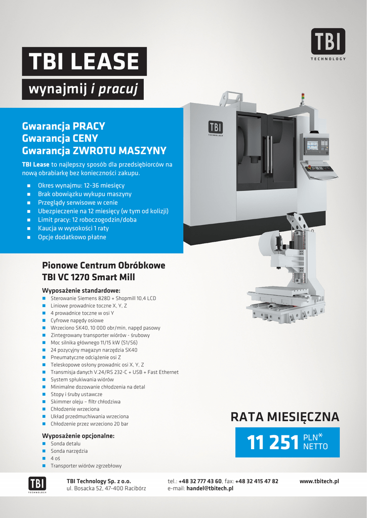 TBI LEASE wynajmij i pracuj Gwarancja PRACY Gwarancja CENY Gwarancja ZWROTU MASZYNY TBI Lease to najlepszy sposób dla przedsiębiorców na nową obrabiarkę bez konieczności zakupu. Okres wynajmu: 12-36 miesięcy Brak obowiązku wykupu maszyny Przeglądy serwisowe w cenie Ubezpieczenie na 12 miesięcy (w tym od kolizji) Limit pracy: 12 roboczogodzin/doba Kaucja w wysokości 1 raty Opcje dodatkowo płatne Pionowe Centrum Obróbkowe TBI VC 1270 Smart Mill Wyposażenie standardowe: Sterowanie Siemens 828D + Shopmill 10,4 LCD Liniowe prowadnice toczne X, Y, Z 4 prowadnice toczne w osi Y Cyfrowe napędy osiowe Wrzeciono SK40, 10 000 obr/min, napęd pasowy Zintegrowany transporter wiórów - śrubowy Moc silnika głównego 11/15 kW (S1/S6) 24 pozycyjny magazyn narzędzia SK40 Pneumatyczne odciążenie osi Z Teleskopowe osłony prowadnic osi X, Y, Z Transmisja danych V.24/RS 232-C + USB + Fast Ethernet System spłukiwania wiórów Minimalne dozowanie chłodzenia na detal Stopy i śruby ustawcze Skimmer oleju – filtr chłodziwa Chłodzenie wrzeciona Układ przedmuchiwania wrzeciona Chłodzenie przez wrzeciono 20 bar Wyposażenie opcjonalne: Sonda detalu Sonda narzędzia 4 oś Transporter wiórów zgrzebłowy TBI Technology Sp. z o.o. ul. Bosacka 52, 47-400 Racibórz RATA MIESIĘCZNA 11 251 tel.: +48 32 777 43 60, fax: +48 32 415 47 82 e-mail: [email protected] PLN* NETTO www.tbitech.pl Pionowe Centrum Obróbkowe TBI VC 1270 Smart Mill Specyfikacja techniczna: NAZWA Zakres pracy Przesuw wzdłużny stołu – oś X Przesuw poprzeczny stołu – oś Y Przesuw pionowy wrzeciennika – oś Z Powierzchnia stołu Rowki T-owe (ilość x szerokość x rozstaw) Obciążenie stołu Odległość czoła wrzeciona – pow. stołu Wrzeciono główne Napęd główny Moc napędu (S1 / S6) Obroty Stożek wrzeciona JEDNOSTKA TBI VC 1270 Smart Mill mm mm mm mm 1200 700 650 1350 x 600 5 x 18 x 100 1 000 153- 830 kg mm kW obr/min Magazyn narzędzi Wykonanie Ilość narzędzi Maks. średnica narzędzia Maks. średnica narzędzia (sąsiednie miejsce w zasobniku wolne) Maks. długość narzędzia Maks. ciężar narzędzia AC - n. pasowy 11/15 10 000 SK 40 szt. mm mm dwuramienny 24 80 150 mm kg 300 7 Napędy osi Osie X / Y / Z Ilość prowadnic rolkowych w osiach X / Y / Z szt. AC - n. cyfrowy 2/4/2 Prędkość posuwów Szybki posuw w osiach X / Y / Z m/min 36/36/24 Zbiornik chłodziwa Pojemność l 360 Pozostałe Całkowity pobór mocy Długość x szerokość x wysokość Ciężar kVA mm kg 41 3400 x 2800 x 2800 7000 RATA MIESIĘCZNA 11 251 PLN* PLN NETTO NETTO OFERTA OBOWIĄZUJE DO 31 MARCA 2016 R. KOSZTY TRANSPORTU, URUCHOMIENIA (2 DNI) I SZKOLENIA (1 DZIEŃ) DODATKOWO PŁATNE. TBI Technology Sp. z o.o. ul. Bosacka 52, 47-400 Racibórz tel.: +48 32 777 43 60, fax: +48 32 415 47 82 e-mail: [email protected] www.tbitech.pl Szczegóły oferty u przedstawicieli TBI Technology. Jest to oferta dla przedsiębiorców, przygotowana przez TBI Lease. Niniejsza informacja nie stanowi oferty w rozumieniu kodeksu cywilnego. Dostępność i warunki produktu mogą ulec zmianie. Warunki produktu określa umowa. Zasady świadczenia usług oraz wykaz materiałów eksploatacyjnych, części i elementów objętych pakietami przeglądów serwisowych określone są w umowie. *