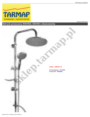 Informacje o produkcie Utworzono 08-03-2017 sk le p .t a rm ap .p l Natrysk przesuwny ROVIGO, SOCHO z deszczownią Wygenerowano w programie www.oscGold.com Cena : 169,41 zł Nr katalogowy : 371403 Producent : INVENA sk le p rm .t a Komplet natryskowy z deszczownicą INVENA SOCHO. Wyposażenie: - natrysk górny "deszczownica" - natrysk ręczny 5-funkcyjny "antykamień" - uchwyt suwakowy - mydelniczka - wąż natryskowy 150 cm o podwójnym splocie - wąż do montażu baterii 60 cm ap .p l Wymiary: Szeroki zasięg strumienia: natrysku górnego: 205 mm Wysokość 128 cm.