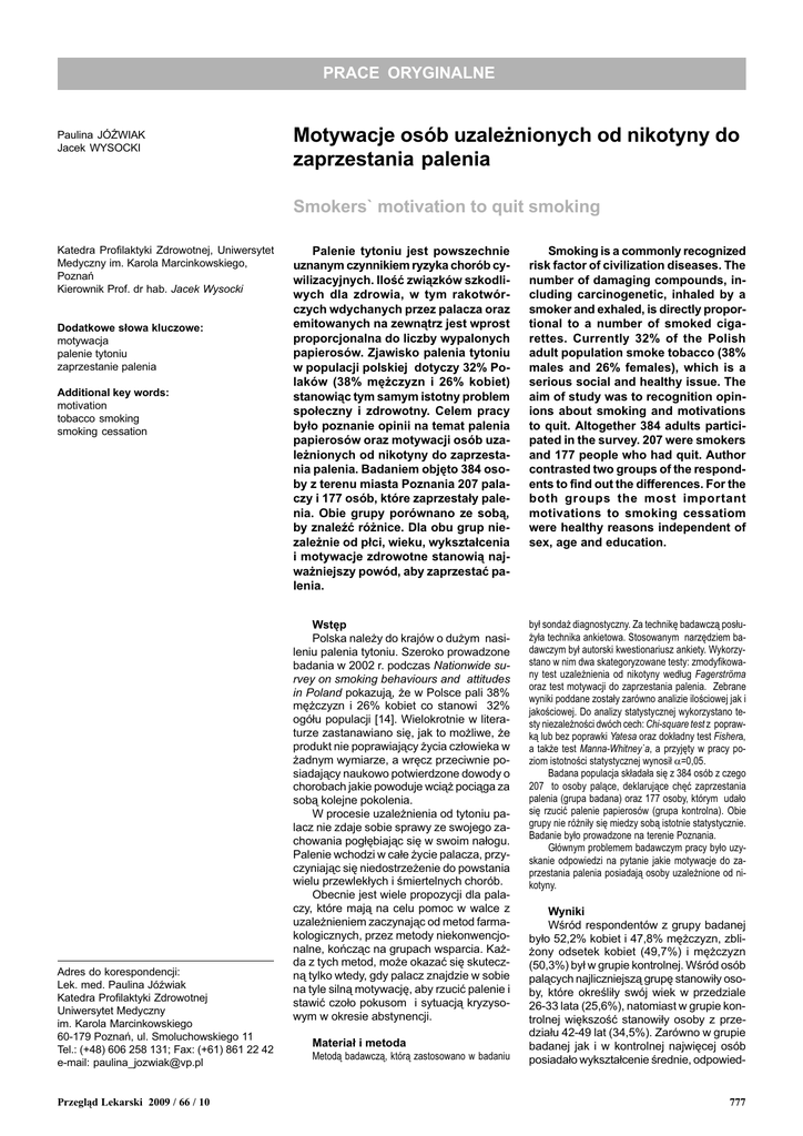 PRACE ORYGINALNE Paulina JÓWIAK Jacek WYSOCKI Motywacje osób uzale¿nionych od nikotyny do zaprzestania palenia Smokers` motivation to quit smoking Katedra Profilaktyki Zdrowotnej, Uniwersytet Medyczny im. Karola Marcinkowskiego, Poznañ Kierownik Prof. dr hab. Jacek Wysocki Dodatkowe s³owa kluczowe: motywacja palenie tytoniu zaprzestanie palenia Additional key words: motivation tobacco smoking smoking cessation Adres do korespondencji: Lek. med. Paulina Jówiak Katedra Profilaktyki Zdrowotnej Uniwersytet Medyczny im. Karola Marcinkowskiego 60-179 Poznañ, ul. Smoluchowskiego 11 Tel.: (+48) 606 258 131; Fax: (+61) 861 22 42 e-mail: [email protected] Przegl¹d Lekarski 2009 / 66 / 10 Palenie tytoniu jest powszechnie uznanym czynnikiem ryzyka chorób cywilizacyjnych. Iloæ zwi¹zków szkodliwych dla zdrowia, w tym rakotwórczych wdychanych przez palacza oraz emitowanych na zewn¹trz jest wprost proporcjonalna do liczby wypalonych papierosów. Zjawisko palenia tytoniu w populacji polskiej dotyczy 32% Polaków (38% mê¿czyzn i 26% kobiet) stanowi¹c tym samym istotny problem spo³eczny i zdrowotny. Celem pracy by³o poznanie opinii na temat palenia papierosów oraz motywacji osób uzale¿nionych od nikotyny do zaprzestania palenia. Badaniem objêto 384 osoby z terenu miasta Poznania 207 palaczy i 177 osób, które zaprzesta³y palenia. Obie grupy porównano ze sob¹, by znaleæ ró¿nice. Dla obu grup niezale¿nie od p³ci, wieku, wykszta³cenia i motywacje zdrowotne stanowi¹ najwa¿niejszy powód, aby zaprzestaæ palenia. Smoking is a commonly recognized risk factor of civilization diseases. The number of damaging compounds, including carcinogenetic, inhaled by a smoker and exhaled, is directly proportional to a number of smoked cigarettes. Currently 32% of the Polish adult population smoke tobacco (38% males and 26% females), which is a serious social and healthy issue. The aim of study was to recognition opinions about smoking and motivations to quit. Altogether 384 adults participated in the survey. 207 were smokers and 177 people who had quit. Author contrasted two groups of the respondents to find out the differences. For the both groups the most important motivations to smoking cessatiom were healthy reasons independent of sex, age and education. Wstêp Polska nale¿y do krajów o du¿ym nasileniu palenia tytoniu. Szeroko prowadzone badania w 2002 r. podczas Nationwide survey on smoking behaviours and attitudes in Poland pokazuj¹, ¿e w Polsce pali 38% mê¿czyzn i 26% kobiet co stanowi 32% ogó³u populacji [14]. Wielokrotnie w literaturze zastanawiano siê, jak to mo¿liwe, ¿e produkt nie poprawiaj¹cy ¿ycia cz³owieka w ¿adnym wymiarze, a wrêcz przeciwnie posiadaj¹cy naukowo potwierdzone dowody o chorobach jakie powoduje wci¹¿ poci¹ga za sob¹ kolejne pokolenia. W procesie uzale¿nienia od tytoniu palacz nie zdaje sobie sprawy ze swojego zachowania pog³êbiaj¹c siê w swoim na³ogu. Palenie wchodzi w ca³e ¿ycie palacza, przyczyniaj¹c siê niedostrze¿enie do powstania wielu przewlek³ych i miertelnych chorób. Obecnie jest wiele propozycji dla palaczy, które maj¹ na celu pomoc w walce z uzale¿nieniem zaczynaj¹c od metod farmakologicznych, przez metody niekonwencjonalne, koñcz¹c na grupach wsparcia. Ka¿da z tych metod, mo¿e okazaæ siê skuteczn¹ tylko wtedy, gdy palacz znajdzie w sobie na tyle siln¹ motywacjê, aby rzuciæ palenie i stawiæ czo³o pokusom i sytuacj¹ kryzysowym w okresie abstynencji. by³ sonda¿ diagnostyczny. Za technikê badawcz¹ pos³u¿y³a technika ankietowa. Stosowanym narzêdziem badawczym by³ autorski kwestionariusz ankiety. Wykorzystano w nim dwa skategoryzowane testy: zmodyfikowany test uzale¿nienia od nikotyny wed³ug Fagerströma oraz test motywacji do zaprzestania palenia. Zebrane wyniki poddane zosta³y zarówno analizie ilociowej jak i jakociowej. Do analizy statystycznej wykorzystano testy niezale¿noci dwóch cech: Chi-square test z poprawk¹ lub bez poprawki Yatesa oraz dok³adny test Fishera, a tak¿e test Manna-Whitney`a, a przyjêty w pracy poziom istotnoci statystycznej wynosi³ a=0,05. Badana populacja sk³ada³a siê z 384 osób z czego 207 to osoby pal¹ce, deklaruj¹ce chêæ zaprzestania palenia (grupa badana) oraz 177 osoby, którym uda³o siê rzuciæ palenie papierosów (grupa kontrolna). Obie grupy nie ró¿ni³y siê miedzy sob¹ istotnie statystycznie. Badanie by³o prowadzone na terenie Poznania. G³ównym problemem badawczym pracy by³o uzyskanie odpowiedzi na pytanie jakie motywacje do zaprzestania palenia posiadaj¹ osoby uzale¿nione od nikotyny. Materia³ i metoda Metod¹ badawcz¹, któr¹ zastosowano w badaniu Wyniki Wród respondentów z grupy badanej by³o 52,2% kobiet i 47,8% mê¿czyzn, zbli¿ony odsetek kobiet (49,7%) i mê¿czyzn (50,3%) by³ w grupie kontrolnej. Wród osób pal¹cych najliczniejsz¹ grupê stanowi³y osoby, które okreli³y swój wiek w przedziale 26-33 lata (25,6%), natomiast w grupie kontrolnej wiêkszoæ stanowi³y osoby z przedzia³u 42-49 lat (34,5%). Zarówno w grupie badanej jak i w kontrolnej najwiêcej osób posiada³o wykszta³cenie rednie, odpowied777 nio 44,5% i 49,1%. W obu grupach ponad 50% osób uwa¿a³o, ¿e palenie papierosów to choroba. 80,2% respondentów z grupy badanej deklarowa³o, ¿e zna konsekwencje palenia papierosów jednak¿e potrafi³o je wymieniæ tylko 106 osób, co daje 63,8% . Do najczêciej wskazywanych konsekwencji palenia nale¿a³y: rak, choroby p³uc oraz choroby uk³adu kr¹¿enia. Respondentom zadano pytanie czy wiedz¹ dlaczego pal¹ /palili papierosy. Miêdzy grupami istnieje ró¿nica istotna statystycznie (pv=0,0271). 76,8% osób z grupy badanej wie dlaczego pali papierosy i jako korzyci wynikaj¹ce z palenia najczêciej wskazywa³y: relaks, uspokojenie, przyjemnoæ, odstresowanie siê oraz przerwê w pracy, wród osób z grupy kontrolnej odpowied twierdz¹c¹ da³o 66,7% osób wymieniaj¹c przy tym takie korzyci jak relaks