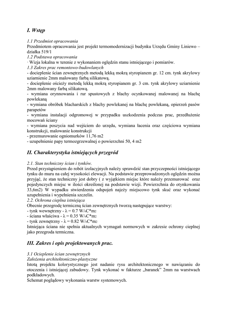 I. Wstęp 1.1 Przedmiot opracowania Przedmiotem opracowania jest projekt termomodernizacji budynku Urzędu Gminy Liniewo – działka 519/1 1.2 Podstawa opracowania · Wizja lokalna w terenie z wykonaniem oględzin stanu istniejącego i pomiarów. 1.3 Zakres prac remontowo-budowlanych - docieplenie ścian zewnętrznych metodą lekką mokrą styropianem gr. 12 cm. tynk akrylowy uziarnienie 2mm malowany farbą silikatową. - docieplenie ościeży metodą lekką mokrą styropianem gr. 3 cm. tynk akrylowy uziarnienie 2mm malowany farbą silikatową. - wymiana orynnowania i rur spustowych z blachy ocynkowanej malowanej na blachę powlekaną - wymiana obróbek blacharskich z blachy powlekanej na blachę powlekaną, opierzeń pasów parapetów - wymiana instalacji odgromowej w przypadku uszkodzenia podczas prac, przedłużenie mocowań ściany - wymiana poszycia nad wejściem do urzędu, wymiana łacenia oraz częściowa wymiana konstrukcji, malowanie konstrukcji - przemurowanie ogniomurków 11,76 m2 - uzupełnienie papy termozgrzewalnej o powierzchni 50, 4 m2 II. Charakterystyka istniejących przegród 2.1. Stan techniczny ścian i tynków. Przed przystąpieniem do robót izolacyjnych należy sprawdzić stan przyczepności istniejącego tynku do muru na całej wysokości elewacji. Na podstawie przeprowadzonych oględzin można przyjąć, że stan techniczny jest dobry ( z wyjątkiem miejsc które należy przemurować oraz pojedynczych miejsc w ilości określonej na podstawie wizji. Powierzchnia do otynkowania 33,6m2) W wypadku stwierdzenia odspojeń najeży miejscowo tynk skuć oraz wykonać uzupełnienia i wypełnienia szczelin. 2.2. Ochrona cieplna istniejąca Obecnie przegrodę termiczną ścian zewnętrznych tworzą następujące warstwy: - tynk wewnętrzny - λ = 0.7 W/0C*m2 - ściana właściwa - λ = 0.35 W/0C*m2 - tynk zewnętrzny - λ = 0.82 W/0C*m2 Istniejąca ściana nie spełnia aktualnych wymagań normowych w zakresie ochrony cieplnej jako przegroda termiczna. III. Zakres i opis projektowanych prac. 3.1 Ocieplenie ścian zewnętrznych Założenia architektoniczno-plastyczne Istotą projektu kolorystycznego jest nadanie rysu architektonicznego w nawiązaniu do otoczenia i istniejącej zabudowy. Tynk wykonać w fakturze „baranek” 2mm na warstwach podkładowych. Schemat poglądowy wykonania warstw systemowych. Do ocieplenia elewacji zastosować warstwę styropianu 12 cm. Na styropian wyłożyć powtórnie masę klejowo-szpachlową do przymocowania siatki z włókna szklanego. Po wyschnięciu podłoża narzucić np. tynk akrylowy wg załączonych rysunków. Narożniki budynku, okien, drzwi wyposażyć w systemowe wzmocnienia kątowe z profili aluminiowych i wzmocnić dwiema warstwami siatki. Szczegół wykonania narożników. -ściana -styropian -narożnik -klej -siatka -klej -grunt -tynk -profil Tynki zewnętrzne Zastosować tynk akrylowy (szlachetny specjalny) w technologii na podkładach zgodnie z kartami przyjętą technologią. Uwagi dla wykonawcy Styropian. Styropianu powinien być odpowiednio wysezonowany (do 6 tygodni); skurcz jaki powstaje przy uwalnianiu się pentanu z pęcherzyków styropianu, może doprowadzić do powstania pęknięć na otynkowanej elewacji. Innym poważnym uchybieniem jest nieodpowiednie pokrycie arkusza zaprawą klejową np. tylko na kilka placków. Oddziaływanie wiatru powoduje zwiększone drgania takiej płyty, szczególnie przy braku obwodowego pasma kleju, co w konsekwencji grozi odklejeniem się styropianu od ściany. Dlatego wymagane jest pokrycie co najmniej w 40% powierzchni styropianu zaprawą klejową metodą pasmowo – punktową. Niewłaściwym jest szpachlowanie zaprawą szczelin w styropianie, gdyż tworzą się mostki cieplne – szczeliny wypełniać paskami styropianu lub pianką. Pamiętać trzeba też, że nie można pozostawiać styropianu narażonego na bezpośrednie działanie promieniowania słonecznego dłużej niż tydzień, ze względu na działanie utleniające. Po dłuższym naświetleniu, powierzchnię styropianu należy przetrzeć papierem ściernym i odpylić, przed nałożeniem warstwy zbrojonej. Styropian do zastosowań w budownictwie musi być odmiany FS samogasnący. Przygotowanie podłoża. Zapewnienie prawidłowej przyczepności styropianu do części ściany w założeniach pracy systemu dociepleniowego nie jest realizowane przez okołkowanie płyt styropianowych. Właściwe powiązanie styropianu realizowane jest przez klej, kołki pełnią funkcję uzupełniającą. Naklejanie docieplenia na brudne, stare powłoki malarskie, zakurzone powierzchnię nie zapewnia przyczepności warstwy klejowej.. Dlatego też niezbędną rzeczą jest oczyszczenie powierzchni elewacji z brudu, luźnych powłok malarskich, zwietrzałego tynku, itp. przy pomocy agregatu myjącego wodą pod ciśnieniem lub skucie luźnych fragmentów tynku. Należy pamiętać że zmniejszenie ilości wody w zaprawie powoduje przerwanie wiązania i obniżenie przyczepności do podłoża i wytrzymałości. Dlatego podłoża o zwiększonej nasiąkliwości, w każdym przypadku trzeba pokryć preparatem gruntującym np. unigruntem, dla ograniczenia wsiąkania wody z zaprawy w podłoże. Pamiętać również należy o usunięciu z powierzchni ściany pozostałości preparatów zawierających rozpuszczalniki organiczne jak np. olkit w złączach prefabrykatów, gdyż działają one rozpuszczająco na styropian. Bardzo częstym błędem jest wyrównywanie niedokładności podłoża poprzez nakładanie grubszej warstwy kleju mocującego. Skutkiem jest wydłużenie czasu wiązania warstwy mocującej, co w przypadku przystąpienia do dalszych czynności technologicznych może prowadzić do wzruszenia płyt i zmniejszenia lub utraty przyczepności kleju. Kolejną konsekwencją jest możliwość spękań masy mocującej, jak również spowodowane skurczem wiązania przemieszczanie się płyt. Nie można także zapominać o niepotrzebnie nadmiernym zużyciu kle