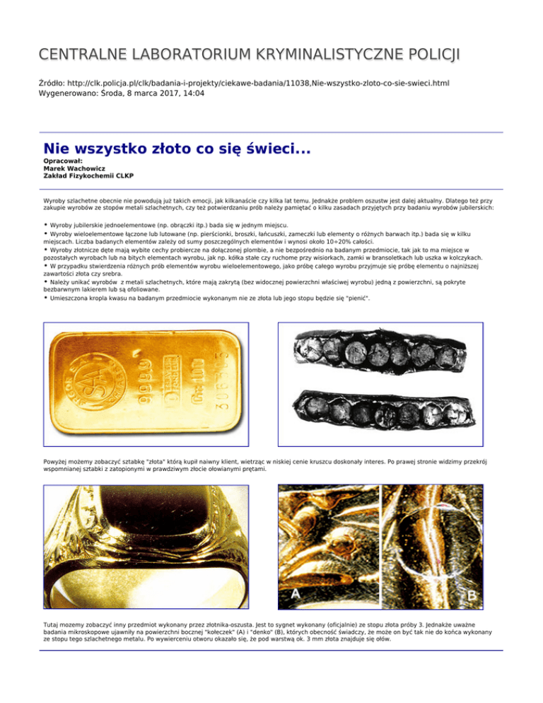 CENTRALNE LABORATORIUM KRYMINALISTYCZNE POLICJI Źródło: http://clk.policja.pl/clk/badania-i-projekty/ciekawe-badania/11038,Nie-wszystko-zloto-co-sie-swieci.html Wygenerowano: Środa, 8 marca 2017, 14:04 Nie wszystko złoto co się świeci... Opracował: Marek Wachowicz Zakład Fizykochemii CLKP Wyroby szlachetne obecnie nie powodują już takich emocji, jak kilkanaście czy kilka lat temu. Jednakże problem oszustw jest dalej aktualny. Dlatego też przy zakupie wyrobów ze stopów metali szlachetnych, czy też potwierdzaniu prób należy pamiętać o kilku zasadach przyjętych przy badaniu wyrobów jubilerskich: • Wyroby jubilerskie jednoelementowe (np. obrączki itp.) bada się w jednym miejscu. • Wyroby wieloelementowe łączone lub lutowane (np. pierścionki, broszki, łańcuszki, zameczki lub elementy o różnych barwach itp.) bada się w kilku miejscach. Liczba badanych elementów zależy od sumy poszczególnych elementów i wynosi około 10÷20% całości. • Wyroby złotnicze dęte mają wybite cechy probiercze na dołączonej plombie, a nie bezpośrednio na badanym przedmiocie, tak jak to ma miejsce w pozostałych wyrobach lub na bitych elementach wyrobu, jak np. kółka stałe czy ruchome przy wisiorkach, zamki w bransoletkach lub uszka w kolczykach. • W przypadku stwierdzenia różnych prób elementów wyrobu wieloelementowego, jako próbę całego wyrobu przyjmuje się próbę elementu o najniższej zawartości złota czy srebra. • Należy unikać wyrobów z metali szlachetnych, które mają zakrytą (bez widocznej powierzchni właściwej wyrobu) jedną z powierzchni, są pokryte bezbarwnym lakierem lub są ofoliowane. • Umieszczona kropla kwasu na badanym przedmiocie wykonanym nie ze złota lub jego stopu będzie się "pienić". Powyżej możemy zobaczyć sztabkę "złota" którą kupił naiwny klient, wietrząc w niskiej cenie kruszcu doskonały interes. Po prawej stronie widzimy przekrój wspomnianej sztabki z zatopionymi w prawdziwym złocie ołowianymi prętami. Tutaj mozemy zobaczyć inny przedmiot wykonany przez złotnika-oszusta. Jest to sygnet wykonany (oficjalnie) ze stopu złota próby 3. Jednakże uważne badania mikroskopowe ujawniły na powierzchni bocznej "kołeczek" (A) i "denko" (B), których obecność świadczy, że może on być tak nie do końca wykonany ze stopu tego szlachetnego metalu. Po wywierceniu otworu okazało się, że pod warstwą ok. 3 mm złota znajduje się ołów. Ocena: 0/5 (0) Tweetnij