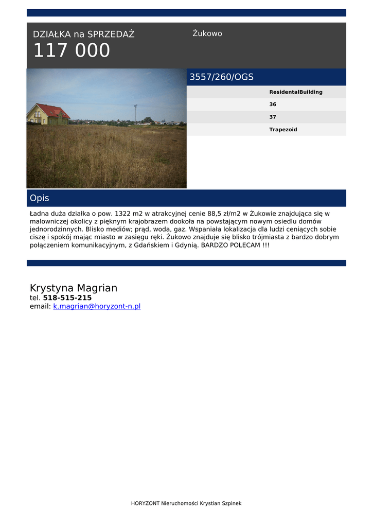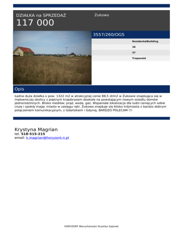 DZIAŁKA na SPRZEDAŻ Żukowo 117 000 3557/260/OGS ResidentalBuilding 36 37 Trapezoid Opis Ładna duża działka o pow. 1322 m2 w atrakcyjnej cenie 88,5 zł/m2 w Żukowie znajdująca się w malowniczej okolicy z pięknym krajobrazem dookoła na powstającym nowym osiedlu domów jednorodzinnych. Blisko mediów; prąd, woda, gaz. Wspaniała lokalizacja dla ludzi ceniących sobie ciszę i spokój mając miasto w zasięgu ręki. Żukowo znajduje się blisko trójmiasta z bardzo dobrym połączeniem komunikacyjnym, z Gdańskiem i Gdynią. BARDZO POLECAM !!! Krystyna Magrian tel. 518-515-215 email: [email protected] HORYZONT Nieruchomości Krystian Szpinek Powered by TCPDF (www.tcpdf.org)