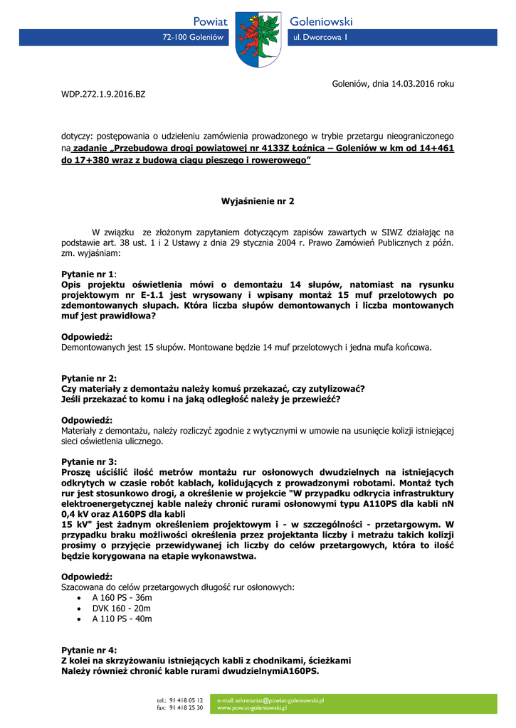 Goleniów, dnia 14.03.2016 roku WDP.272.1.9.2016.BZ dotyczy: postępowania o udzieleniu zamówienia prowadzonego w trybie przetargu nieograniczonego na zadanie „Przebudowa drogi powiatowej nr 4133Z Łoźnica – Goleniów w km od 14+461 do 17+380 wraz z budową ciągu pieszego i rowerowego” Wyjaśnienie nr 2 W związku ze złożonym zapytaniem dotyczącym zapisów zawartych w SIWZ działając na podstawie art. 38 ust. 1 i 2 Ustawy z dnia 29 stycznia 2004 r. Prawo Zamówień Publicznych z późn. zm. wyjaśniam: Pytanie nr 1: Opis projektu oświetlenia mówi o demontażu 14 słupów, natomiast na rysunku projektowym nr E-1.1 jest wrysowany i wpisany montaż 15 muf przelotowych po zdemontowanych słupach. Która liczba słupów demontowanych i liczba montowanych muf jest prawidłowa? Odpowiedź: Demontowanych jest 15 słupów. Montowane będzie 14 muf przelotowych i jedna mufa końcowa. Pytanie nr 2: Czy materiały z demontażu należy komuś przekazać, czy zutylizować? Jeśli przekazać to komu i na jaką odległość należy je przewieźć? Odpowiedź: Materiały z demontażu, należy rozliczyć zgodnie z wytycznymi w umowie na usunięcie kolizji istniejącej sieci oświetlenia ulicznego. Pytanie nr 3: Proszę uściślić ilość metrów montażu rur osłonowych dwudzielnych na istniejących odkrytych w czasie robót kablach, kolidujących z prowadzonymi robotami. Montaż tych rur jest stosunkowo drogi, a określenie w projekcie "W przypadku odkrycia infrastruktury elektroenergetycznej kable należy chronić rurami osłonowymi typu A110PS dla kabli nN 0,4 kV oraz A160PS dla kabli 15 kV" jest żadnym określeniem projektowym i - w szczególności - przetargowym. W przypadku braku możliwości określenia przez projektanta liczby i metrażu takich kolizji prosimy o przyjęcie przewidywanej ich liczby do celów przetargowych, która to ilość będzie korygowana na etapie wykonawstwa. Odpowiedź: Szacowana do celów przetargowych długość rur osłonowych: A 160 PS - 36m DVK 160 - 20m A 110 PS - 40m Pytanie nr 4: Z kolei na skrzyżowaniu istniejących kabli z chodnikami, ścieżkami Należy również chronić kable rurami dwudzielnymiA160PS. 4.1. czy wszystkie kable chronić rurami fi 160? 4.2. czy zgodnie z opisem i rysunkiem 1.2 występują tylko dwie kolizje? 4.3. jeden z tych kabli projektant chce chronić ze znacznym załamanie trasy; wskazane rury osłonowe nie dają możliwości ich dowolnego wyginania. Czy trasa kabla ma być na trasie rury osłonowej zmieniona (wyprostowana), czy mają może być zastosowane inne materiały ochronne? Odpowiedź: 1. Rurami ɸ 160, należy chronić kable SN. Rurami ɸ 110, należy chronić kable nn. 2. Projektant przewidział osłonę dwóch kabli SN zaznaczonych na mapie 1.2. W przypadku odkrycia innych kabli, należy je chronić rurami osłonowymi typu zgodnie z pkt. 1. Szacowana długość rur osłonowych do celów przetargowych zgodnie z odpowiedzią na zapytanie nr 3. 3. Trasa kabla ma być zmieniona (wyprostowana). Pytanie nr 5: Czy na trasie kabli musi być ułożona bednarka FeZn 30x4 mm? Czy nie może być zastosowana FeZn 25x4 mm lub pręt FeZn fi 8m? Szczególnie, że przy wszystkich słupach mają być wykonane uziomy szpilkowe (pionowe)? Odpowiedź: Na trasie kabli nn ma być ułożona bednarka 30x4. Pytanie nr 6: Czy rzeczywiście przy każdym słupie musi być wykonany uziom pionowy, skoro generalnie uziemia się dodatkowo słupy krańcowe i rozgałęźne? Odpowiedź: Przy każdym słupie należy wykonać uziemienie pionowe. Pozostała treść Specyfikacji Istotnych Warunków Zamówienia pozostaje bez zmian. Powyższe informacje należy traktować jako integralną część Specyfikacji Istotnych Warunków Zamówienia.