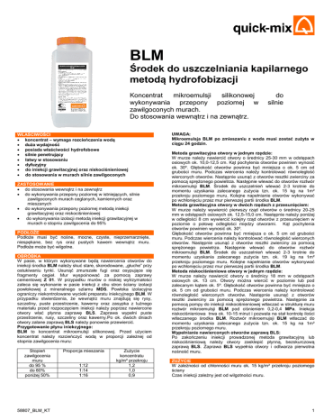 BLM Środek do uszczelniania kapilarnego metodą hydrofobizacji Koncentrat mikroemulsji silikonowej wykonywania przepony poziomej w zawilgoconych murach. Do stosowania wewnątrz i na zewnątrz. WŁAŚCIWOŚCI koncentrat – wymaga rozcieńczenia wodą duża wydajność posiada właściwości hydrofobowe silnie penetrujący łatwy w stosowaniu dyfuzyjny do iniekcji grawitacyjnej oraz niskociśnieniowej do stosowania w murach silnie zawilgoconych ZASTOSOWANIE do stosowania wewnątrz i na zewnątrz do wykonywania przepony poziomej w istniejących, silnie zawilgoconych murach ceglanych, kamiennych oraz mieszanych do wykonywania przepony poziomej metodą iniekcji grawitacyjnej oraz niskociśnieniowej do wykonywania izolacji metodą iniekcji grawitacyjnej w murach o stopniu zawilgocenia do 95% PODŁOŻE Podłoże musi być nośne, mocne, czyste, nieprzemarznięte, niespękane, bez rys oraz pustych kawern wewnątrz muru. Podłoże może być wilgotne. OBRÓBKA W pasie, w którym wykonywane będą nawiercenia otworów do iniekcji środka BLM należy skuć stare, skorodowane, „głuche” przy ostukiwaniu tynki. Usunąć zmurszałe fugi oraz osypujące się fragmenty cegieł. Mur wyspoinować za pomocą zaprawy cementowej Z 01. W przypadku murów o niskiej wytrzymałości zaleca się wykonanie w pasie iniekcji z obu stron ściany izolacji powłokowej z mineralnego szlamu MDS. Powłoka izolacyjna ograniczy niekontrolowane wycieki preparatu iniekcyjnego BLM. W przypadku stwierdzenia, że wewnątrz muru znajdują się rysy, szczeliny, puste przestrzenie, kawerny oraz zasypka z luźnego materiału przed rozpoczęciem iniekcji należy poprzez nawiercone otwory wlać płynna zaprawę BLS. Zaprawa wypełni puste przestrzenie, rusy, szczeliny oraz kawerny.Po ok. dwóch dniach otwory zalane zaprawą BLS należy ponownie przewiercić. Przygotowanie płynu iniekcyjnego: BLM to koncentrat mikroemulsji silikonowej. Przed użyciem koncentrat należy rozcieńczyć wodą w proporcji zależnej od stopnia zawilgocenia muru: Stopień zawilgocenia muru do 95 % do 60% poniżej 50% 58807_BLM_KT Proporcja mieszania 1:12 1:14 1:16 Zużycie koncentratu kg/m² przekroju 1,2 1,0 0,9 do silnie UWAGA: Mikroemulsja BLM po zmieszaniu z woda musi zostać zużyta w ciągu 24 godzin. Metoda grawitacyjna otwory w jednym rzędzie: W murze należy nawiercić otwory o średnicy 25-30 mm w odstępach osiowych ok. 10,0-12,5 cm. Kąt pochylenia otworów powinien wynosić ok. 30º. Głębokość otworów powinna być mniejsza o ok. 5 cm od grubości muru. Podczas wiercenia należy kontrolować równoległość wierconych otworów. Następnie usunąć z otworów resztki zwierciny za pomocą sprężonego powietrza. Następnie wlewać do otworów roztwór mikroemulsji BLM. Środek do uszczelnień wlewać 2-3 krotnie do momentu uzyskania zalecanego zużycia tzn. ok. 15 kg na 1m² przekroju poziomego muru. Kolejne napełnianie otworów wykonywać po wchłonięciu przez mur pierwszej partii środka BLM. Metoda grawitacyjna otwory w dwóch rzędach z przesunięciem: W murze należy wywiercić pierwszy rząd otworów o średnicy 20-25 mm w odstępach osiowych ok. 12,5-15,0 cm. Następnie należy poniżej w odległości 8 cm wywiercić kolejny rząd otworów z przesunięciem w poziomie o połowę odległości między otworami. Kąt pochylenia otworów powinien wynosić ok. 30º. Głębokość otworów powinna być mniejsza o ok. 5 cm od grubości muru. Podczas wiercenia należy kontrolować równoległość wierconych otworów. Następnie usunąć z otworów resztki zwierciny za pomocą sprężonego powietrza. Następnie wlewać do otworów roztwór mikroemulsji BLM. Środek do uszczelnień wlewać 2-3 krotnie do momentu uzyskania zalecanego zużycia tzn. ok. 19 kg na 1m² przekroju poziomego muru. Kolejne napełnianie otworów wykonywać po wchłonięciu przez mur pierwszej partii środka BLM. Metoda niskociśnieniowa otwory w jednym rzędzie: W murze należy nawiercić otwory o średnicy 18 mm w odstępach osiowych ok. 13 cm. Otwory można wiercić w poziomie lub pod zalecanym kątem ok. 5º. Głębokość otworów powinna być mniejsza o ok. 5 cm od grubości muru. Podczas wiercenia należy kontrolować równoległość wierconych otworów. Następnie usunąć z otworów resztki zwierciny za pomocą sprężonego powietrza. Następnie za pomocą pompy do iniekcji niskociśnieniowej wtłaczać w strukturę muru roztwór mikroemulsji BLM pod ciśnieniem 0,2-0,4 MPa. Iniekcja niskociśnieniowa trwa ok. 10-15 minut i pozwala na stał kontrolę ilości wtłaczanego środka BLM. Roztwór mikroemujsji BLM wtłaczać do momentu uzyskania zalecanego zużycia tzn. ok. 15 kg na 1m² przekroju poziomego muru. Wypełnianie nawierconych otworów zaprawą BLS: Po zakończeniu iniekcji prowadzonej metoda grawitacyjną lub niskociśnieniową należy otwory zasklepić płynną, bezskurczową zaprawą BLS. Zaprawa BLS wypełnia otwory i odtwarza pierwotna nośność muru. ZUŻYCIE W zależności od chłonności muru ok. 15 kg/m² przekroju poziomego ściany Czas iniekcji zależny jest od wilgotności muru. 1 PROFESJONALNY SYSTEM - BLV – Środek do wykonywania przepony poziomej metodą krzemianowania - BLM – Mikroemulsja silikonowa do wykonywania przepony poziomej metodą hydrofobizacji - BLS – zaprawa do wypełniania odwiertów - System tynków renowacyjnych Tubag FORMA DOSTAWY butelka 1l MAGAZYNOWANIE Przechowywać w suchym miejscu na paletach drewnianych. Chronić przed mrozem. Czas magazynowania: 24 miesiące; data przydatności podana na opakowaniu. Stan: 30 września 2011 Z chwilą wydania nowej karty technicznej niniejsza wersja traci swą ważność Szersze informacje można uzyskać: quick-mix sp. z o.o. ul. Brzegowa 73 57-100 Strzelin tel. 71/ 392 72 20, 15 fax. 71/ 392 72 23, 24 e-mail: [email protected] www.quick-mix.pl JAKOŚĆ I NIEZAWODNOŚĆ pod stałą kontrolą jakości zgodnie z ISO 9001 UWAGA Skład: emulsja silikonowa, nie zawierająca 