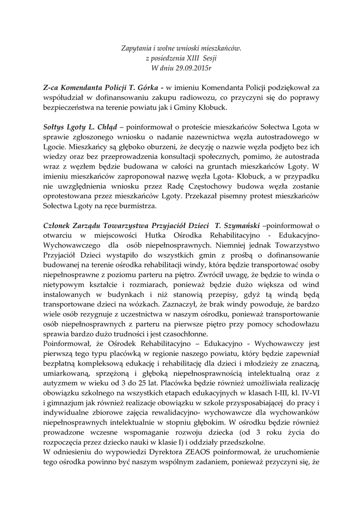 Zapytania i wolne wnioski mieszkańców. z posiedzenia XIII Sesji W dniu 29.09.2015r Z-ca Komendanta Policji T. Górka - w imieniu Komendanta Policji podziękował za współudział w dofinansowaniu zakupu radiowozu, co przyczyni się do poprawy bezpieczeństwa na terenie powiatu jak i Gminy Kłobuck. Sołtys Lgoty L. Chłąd – poinformował o proteście mieszkańców Sołectwa Lgota w sprawie zgłoszonego wniosku o nadanie nazewnictwa węzła autostradowego w Lgocie. Mieszkańcy są głęboko oburzeni, że decyzję o nazwie węzła podjęto bez ich wiedzy oraz bez przeprowadzenia konsultacji społecznych, pomimo, że autostrada wraz z węzłem będzie budowana w całości na gruntach mieszkańców Lgoty. W imieniu mieszkańców zaproponował nazwę węzła Lgota- Kłobuck, a w przypadku nie uwzględnienia wniosku przez Radę Częstochowy budowa węzła zostanie oprotestowana przez mieszkańców Lgoty. Przekazał pisemny protest mieszkańców Sołectwa Lgoty na ręce burmistrza. Członek Zarządu Towarzystwa Przyjaciół Dzieci T. Szymański –poinformował o otwarciu w miejscowości Hutka Ośrodka Rehabilitacyjno - EdukacyjnoWychowawczego dla osób niepełnosprawnych. Niemniej jednak Towarzystwo Przyjaciół Dzieci wystąpiło do wszystkich gmin z prośbą o dofinansowanie budowanej na terenie ośrodka rehabilitacji windy, która będzie transportować osoby niepełnosprawne z poziomu parteru na piętro. Zwrócił uwagę, że będzie to winda o nietypowym kształcie i rozmiarach, ponieważ będzie dużo większa od wind instalowanych w budynkach i niż stanowią przepisy, gdyż tą windą będą transportowane dzieci na wózkach. Zaznaczył, że brak windy powoduje, że bardzo wiele osób rezygnuje z uczestnictwa w naszym ośrodku, ponieważ transportowanie osób niepełnosprawnych z parteru na pierwsze piętro przy pomocy schodowłazu sprawia bardzo dużo trudności i jest czasochłonne. Poinformował, że Ośrodek Rehabilitacyjno – Edukacyjno - Wychowawczy jest pierwszą tego typu placówką w regionie naszego powiatu, który będzie zapewniał bezpłatną kompleksową edukację i rehabilitację dla dzieci i młodzieży ze znaczną, umiarkowaną, sprzężoną i głęboką niepełnosprawnością intelektualną oraz z autyzmem w wieku od 3 do 25 lat. Placówka będzie również umożliwiała realizację obowiązku szkolnego na wszystkich etapach edukacyjnych w klasach I-III, kl. IV-VI i gimnazjum jak również realizacje obowiązku w szkole przysposabiającej do pracy i indywidualne zbiorowe zajęcia rewalidacyjno- wychowawcze dla wychowanków niepełnosprawnych intelektualnie w stopniu głębokim. W ośrodku będzie również prowadzone wczesne wspomaganie rozwoju dziecka (od 3 roku życia do rozpoczęcia przez dziecko nauki w klasie I) i oddziały przedszkolne. W odniesieniu do wypowiedzi Dyrektora ZEAOS poinformował, że uruchomienie tego ośrodka powinno być naszym wspólnym zadaniem, ponieważ przyczyni się, że wszystkie gminy z naszego powiatu gminy będą miały możliwość obniżenia kosztów związanych z dowozem dzieci niepełnosprawnych do ośrodków. Uważa, że warto podjąć współpracę, aby jeszcze w tym miesiącu można było zorganizować spotkanie z rodzicami by móc przedstawić szczegółowy plan działania oraz jakie zajęcia będą prowadzone w ośrodku. Burmistrz J. Zakrzewski – poinformował, że na spotkaniu w starostwie, gdzie ten temat był poruszany zaproponowano, aby wszystkie gminy na terenie powiatu kłobuckiego w tym z Gminą Wręczyca dofinansowały budowę windy. Wniosek w sprawie wyrażenia zgody na dofinansowanie budowy windy w kwocie 4.000,00zł został pozytywnie zaopiniowany na posiedzeniu Komisji Budżetu i Finansów. Osobiście uważa, że zorganizowanie spotkania z rodzicami dzieci niepełnosprawnych powinno zostać zorganizowane jak najszybciej by rodzice zostali przekonani aby te dzieci korzystały z usług tego ośrodka. Przewodniczący Osiedla Nr 9 Z. Sukiennik – poinformował, że chcąc zakończyć polemikę wśród mieszkańców osiedla zapytał, w jakim czasie i kiedy zostanie ułożona w chodniku przy ul. Polnej w Kłobucku kostka brukowa, na której ułożenie osiedle przeznaczyło 15.370,00zł. Przypomniał o istniejącym od dawna problemie dotyczącym zanieczyszczania osiedla różnego rodzaju reklamami banków, którymi dawniej przed umieszczeniem napisu z zakazem wieszania były obklejane tablice informacyjne, a teraz są słupy oświetleniowe. Zapytał, czy istnieje skuteczny sposób zakazu obklejania słupów. Burmistrz J. Zakrzewski – poinformował, że zostały już zmontowane wszystkie tablice w osiedlach i sołectwach, do których została zamówiona wklejka z zakazem wieszania informacji nie związanych ze sprawami osiedla. W odniesieniu do ul. Polnej odpowiedział, że inwestycja została wprowadzona do budżetu i jeśli zostanie zaakceptowana przez radę to jeszcze w tym roku zostanie zrealizowana. Przewodniczący Osiedla Nr 7 Z. Baran – poruszył następujące sprawy: - poinformował o własnej interwencji dotyczącej usunięcia z tablicy osiedlowej reklamy bankowej, - poinformował o negatywnej opinii mieszkańców w sprawie placu zabaw. Poprosił o wskazanie na terenie osiedla terenów na których mógłby powstać taki plac zabaw, - zapytał, kiedy zostaną zamontowane znaki dotyczące ograniczenia prędkości w ul. Zakrzewska i ul. Korczaka w Kłobucku, - zapytał, kiedy zostanie naprawiona kładka stanowiąca skrót przejścia z ul. Zakrzewskiej na ul. Hallera w Kłobucku, a dokładnie na boisko, na które będą przychodzić mieszkańcy osiedla, gdy na terenie Osiedla Nr 7 nie powstanie plac zabaw. Kierownik Wydziału GPN A. Jagielska – w odniesieniu do reklam wieszanych w różnych niechcianych miejscach odpowiedziała, że w dniu 10.09.2015r weszła w życie tzw. ustawa krajobrazowa, która koryguje szereg zapisów ustaw nie tylko ustawy o podatkach i opłatach lokalnych ale również prawo b
