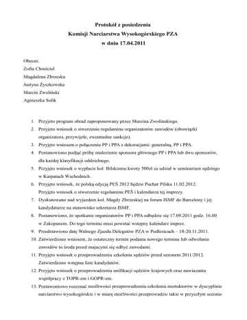 Protokół z posiedzenia Komisji Narciarstwa Wysokogórskiego PZA w dniu 17.04.2011 Obecni: Zofia Chruściel Magdalena Zbrzeska Justyna Żyszkowska Marcin Zwoliński Agnieszka Solik 1. Przyjeto program obrad zaproponowany przez Marcina Zwolinskiego. 2. Przyjeto wniosek o stworzenie regulaminu organizatorów zawodów (obowiązki organizatora, przywijele, ewentualne sankcje). 3. Przyjęto wniosem o połączeniu PP i PPA z dekoracjami: generalną, PP i PPA. 4. Postanowiono podjąć próbę znalezienie sponsora głównego PP i PPA lub dwu sponsorów, dla każdej klasyfikacji oddzielnego. 5. Przyjęto wniosek o wypłacie kol. Bilskiemu kwoty 500zł za udział w seminarium sędziego w Karpatach Wschodnich. 6. Przyjęto wniosek, że polską edycją PEŚ 2012 będzie Puchar Pilska 11.02.2012. Przyjęto wniosek o stworzenie regolaminu PEŚ i kalendarza tej imprezy. 7. Dyskutowano nad wyjazdem kol. Magdy Zbrzeskiej na forum ISMF do Barcelony i jej kandydaturze na stanowisko sekretarza ISMF. 8. Postanowiono, że spotkanie organizatorów PP i PPA odbędzie się 17.09.2011 godz. 16.00 w Zakopanem. Do tego terminu musi powstać wstepny kalendarz imprez. 9. Przedstawiono datę Walnego Zjazdu Delegatów PZA w Podlesicach – 18-20.11.2011. 10. Zatwierdzono wniosem, że ostateczny termin podania nowego terminu lub odwołania zawodów to środa przed majacymi się odbyć zawodami. 11. Przyjęto wniosek o przeprowadzeniu szkolenia sędziów przed sezonem 2011/2012. Zatwierdzono wstępna liste kandydatów. 12. Przyjęto wniosek o przeprowadzeniu unifikacji sędziów krajowych oraz nawiazaniu współpracy z TOPR-em i GOPR-em. 13. Postawoniowo rozeznać możliwości przeprowadzenia szkolenia insrtuktorów w dyscyplinie narciarstwo wysokogórskie i w miarę możliwości przeprowadzic takie w przyszłym sezonie zimowym. 14. Przyjęto wniosek o udziale w forum sędziów ISMF w Pelvoux tych sędziów, któzy zadeklarują dalszą współpracą z KNW w sezonie 2011/2012. 15. Przyjęto wniosek o wypłacie zaległej delegacji kol. Maciejowi Głogoczowskiemu. 16. Przyjęto, że koordynatorem współpracy KNW z Marką Odlo będzie kolega Marcin Zwoliński. 17. Postanowiono poszukać selekcjonera dla kadry narodowej. 18. Na tym obrady zakończono. Sporządziła: Agnieszka Solik