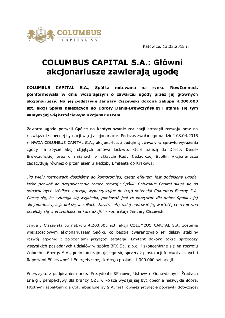 Katowice, 13.03.2015 r. COLUMBUS CAPITAL S.A.: Główni akcjonariusze zawierają ugodę COLUMBUS CAPITAL S.A., Spółka notowana na rynku NewConnect, poinformowała w dniu wczorajszym o zawarciu ugody przez jej głównych akcjonariuszy. Na jej podstawie January Ciszewski dokona zakupu 4.200.000 szt. akcji Spółki należących do Doroty Denis-Brewczyńskiej i stanie się tym samym jej większościowym akcjonariuszem. Zawarta ugoda pozwoli Spółce na kontynuowanie realizacji strategii rozwoju oraz na rozwiązanie obecnej sytuacji w jej akcjonariacie. Podczas zwołanego na dzień 08.04.2015 r. NWZA COLUMBUS CAPITAL S.A., akcjonariusze podejmą uchwały w sprawie wyrażenia zgody na zbycie akcji objętych umową lock-up, które należą do Doroty DenisBrewczyńskiej oraz o zmianach w składzie Rady Nadzorczej Spółki. Akcjonariusze zadecydują również o przeniesieniu siedziby Emitenta do Krakowa. „Po wielu rozmowach doszliśmy do kompromisu, czego efektem jest podpisana ugoda, która pozwoli na przyspieszenie tempa rozwoju Spółki. Columbus Capital skupi się na odnawialnych źródłach energii, wykorzystując do tego potencjał Columbus Energy S.A. Cieszę się, że sytuacja się wyjaśniła, ponieważ jest to korzystne dla dobra Spółki i jej akcjonariuszy, a ja dołożę wszelkich starań, żeby dalej budować jej wartość, co na pewno przełoży się w przyszłości na kurs akcji.” - komentuje January Ciszewski. January Ciszewski po nabyciu 4.200.000 szt. akcji COLUMBUS CAPITAL S.A. zostanie większościowym akcjonariuszem Spółki, co będzie gwarantowało jej dalszy stabilny rozwój zgodnie z założeniami przyjętej strategii. Emitent dokona także sprzedaży wszystkich posiadanych udziałów w spółce 3FX Sp. z o.o. i skoncentruje się na rozwoju Columbus Energy S.A., podmiotu zajmującego się sprzedażą instalacji fotowoltaicznych i Raportami Efektywności Energetycznej, którego posiada 1.000.000 szt. akcji. W związku z podpisaniem przez Prezydenta RP nowej Ustawy o Odnawialnych Źródłach Energii, perspektywy dla branży OZE w Polsce wydają się być obecnie niezwykle dobre. Istotnym aspektem dla Columbus Energy S.A. jest również przyjęcie poprawki dotyczącej prosumentów, która zakłada wprowadzenie taryf gwarantowanych za sprzedaż do sieci produkowanej przez nich energii. W najbliższym czasie rozpoczną się też nabory na dofinansowania w ramach Programu Prosument, finansowanego ze środków Narodowego Funduszu Ochrony Środowiska i Gospodarki Wodnej. Jego głównym celem jest promowanie nowych technologii OZE oraz postaw prosumenckich, a także rozwój rynku dostawców urządzeń i instalatorów. „Wejście w życie nowej Ustawy o Odnawialnych Źródłach Energii, a szczególnie zapisów dotyczących prosumentów, to dla nas bardzo dobra informacja. Mocno liczymy także na Program Prosument, który będzie finansowany ze środków NFOŚiGW, a już wkrótce ruszą nabory na dofinansowania projektów. Nadchodzące lata powinny być więc dla branży OZE bardzo udane i zamierzamy to wykorzystać.” - dodaje Dawid Zieliński, Prezes Zarządu Spółki COLUMBUS CAPITAL S.A. *** Kontakt: COLUMBUS CAPITAL S.A. - Relacje Inwestorskie Artur Górski [email protected] tel. +48 501-215-243 www.columbuscapital.pl