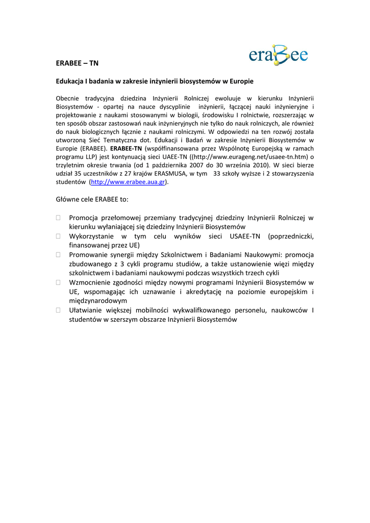 ERABEE – TN Edukacja I badania w zakresie inżynierii biosystemów w Europie Obecnie tradycyjna dziedzina Inżynierii Rolniczej ewoluuje w kierunku Inżynierii Biosystemów - opartej na nauce dyscyplinie inżynierii, łączącej nauki inżynieryjne i projektowanie z naukami stosowanymi w biologii, środowisku I rolnictwie, rozszerzając w ten sposób obszar zastosowao nauk inżynieryjnych nie tylko do nauk rolniczych, ale również do nauk biologicznych łącznie z naukami rolniczymi. W odpowiedzi na ten rozwój została utworzoną Sied Tematyczna dot. Edukacji i Badao w zakresie Inżynierii Biosystemów w Europie (ERABEE). ERABEE-TN (współfinansowana przez Wspólnotę Europejską w ramach programu LLP) jest kontynuacją sieci UAEE-TN ((http://www.eurageng.net/usaee-tn.htm) o trzyletnim okresie trwania (od 1 października 2007 do 30 września 2010). W sieci bierze udział 35 uczestników z 27 krajów ERASMUSA, w tym 33 szkoły wyższe i 2 stowarzyszenia studentów (http://www.erabee.aua.gr). Główne cele ERABEE to: Promocja przełomowej przemiany tradycyjnej dziedziny Inżynierii Rolniczej w kierunku wyłaniającej się dziedziny Inżynierii Biosystemów Wykorzystanie w tym celu wyników sieci USAEE-TN (poprzedniczki, finansowanej przez UE) Promowanie synergii między Szkolnictwem i Badaniami Naukowymi: promocja zbudowanego z 3 cykli programu studiów, a także ustanowienie więzi między szkolnictwem i badaniami naukowymi podczas wszystkich trzech cykli Wzmocnienie zgodności między nowymi programami Inżynierii Biosystemów w UE, wspomagając ich uznawanie i akredytację na poziomie europejskim i międzynarodowym Ułatwianie większej mobilności wykwalifkowanego personelu, naukowców I studentów w szerszym obszarze Inżynierii Biosystemów