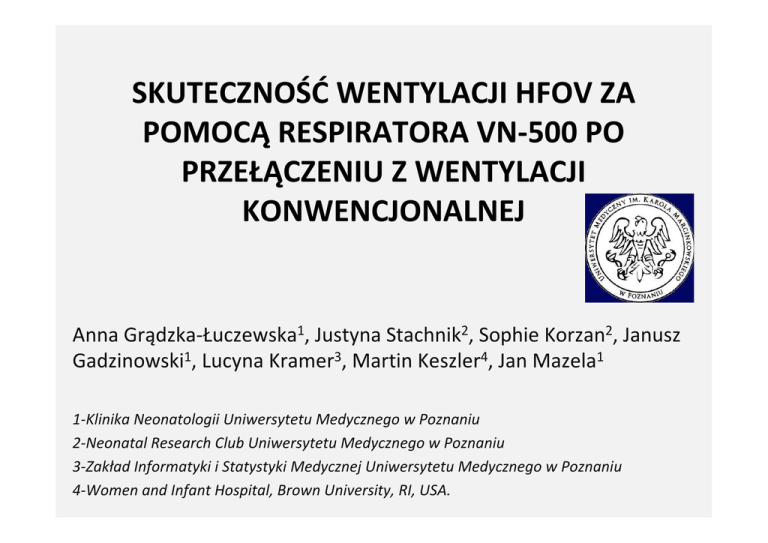 SKUTECZNOŚĆ WENTYLACJI HFOV ZA POMOCĄ RESPIRATORA VN-500 PO PRZEŁĄCZENIU Z WENTYLACJI KONWENCJONALNEJ Anna Grądzka-Łuczewska1, Justyna Stachnik2, Sophie Korzan2, Janusz Gadzinowski1, Lucyna Kramer3, Martin Keszler4, Jan Mazela1 1-Klinika Neonatologii Uniwersytetu Medycznego w Poznaniu 2-Neonatal Research Club Uniwersytetu Medycznego w Poznaniu 3-Zakład Informatyki i Statystyki Medycznej Uniwersytetu Medycznego w Poznaniu 4-Women and Infant Hospital, Brown University, RI, USA. Cochrane Summaries Independent high-quality evidence for health care decision making Rescue high frequency oscillatory ventilation versus conventional ventilation for pulmonary dysfunction in preterm infants Bhuta T, Henderson-Smart DJ Cochrane Database of Systematic Reviews 1998, Issue 2. Art. No.: CD000438. DOI: 10.1002/14651858.CD000438 • Insufficient evidence exists to support the use of high frequency oscillatory ventilation instead of conventional ventilation for preterm infants with severe lung disease who are given positive pressure ventilation. High frequency oscillatory ventilation (HFOV) is a newer way of providing artificial ventilation of the lungs. Theoretically, HFOV may produce less injury to the lungs, particularly when high pressures are used on conventional positive pressure ventilation. Wstęp • Ciężka niewydolność oddechowa noworodków Wentylacja wysokimi częstotliwościami (HFOV) • Wentylacja HFOV za pomocą respiratora VN500 (Draeger, Luebeck, Germany) Możliwość monitorowania i kontrolowania objętości oddechowej (VT). Cel • Ocena stosowania HFOV po zmianie z wentylacji konwencjonalnej przy zastosowaniu lokalnego protokołu stosowania HFOV. • W badaniu porównano pierwsze i następne, zoptymalizowane nastawy parametrów wentylacji HFOV w celu zweryfikowania skuteczności zastosowanego protokołu HFOV. Materiał i metoda Badanie retrospektywne Przeanalizowano : • gazometrię krwi tętniczej • rozpoznania kliniczne • przyrost masy ciała Analiza wariancji dla testu parametrycznego (test Sheffe) i nieparametrycznego (test Friedmana) do porównania pH, pCO2, MAP i PIP/dPhf Materiał i metoda Noworodki przyjęte na OIOM w okresie od 1.01.2012 do 30.09.2012 roku Leczone HFOV za pomocą VN500 wg protokołu, jeżeli poniższe kryteria zostały spełnione: • PCO2 > 65 w dwóch kolejnych gazometriach • Ilość oddechów > 60 • HFOV MAP równy MAP na wentylacji konwencjonalnej a dPhf ustawiano w oparciu o ruchy klatki piersiowej. Wyniki • Do badań włączono 26 pacjentów, leczonych HFOV za pomocą VN500 z masą ciała 830.6 g + 133.7 i w tygodniu ciąży 26.1 + 1.5 (mean + SD). • Zebrano 305 zestawów gazometrii i nastawów respiratora, 293 poddano analizie. • Nie było statystycznej różnicy pomiędzy pierwszymi i optymalnymi nastawami respiratora HFOV. • Zaobserwowano różnice pomiędzy wentylacją konwencjonalną a HFOV w zakresie pH, pCO2 i MAP (p<0.01). Wyniki CMV 1sze HFOV Zoptymaliz owane HFOV 1 2 3 4 1-2 1-3 1-4 2-3 2-4 3-4 pH 7.14±0.07 7.3±0.1 7.27±0.08 7.28±0.09 <0.001 <0.001 <0.001 ns ns Ns pCO2 66.26±14.2 40.5±14.1 46.33±12.7 45.22±12.1 <0.001 <0.001 <0.001 ns ns Ns MAP 9.9±2.22 9.3±1.68 8.6±1.68 7.96±0.99 ns ns <0.001 ns <0.01 Ns PIP/ dPhf 18.5±6.9 18.81±5.9 16.4±5.2 15.58±2.0 ns ns ns ns <0.05 Ns RR/ Freq 55.8±5.9 14.1±1.0 14.3±0.9 41.6±9.9 na na ns ns na Na VT/ kg 6.4±1.56 2.6±1.34 2.4±1.38 5.37±2.03 <0.001 <0.001 ns ns <0.001 <0.001 Po HFOV Porównanie Wnioski • Brak różnic pomiędzy pierwszymi nastawami na HFOV i zoptymalizowanymi sugeruje, że zastosowany w jednostce protokół spełnia określoną rolę. • Istotne różnice pomiędzy parametrami gazometrii krwi i nastawami respiratora podczas wentylacji konwencjonalnej i po zastosowaniu wentylacji HFOV świadczy o skuteczności leczenia.
