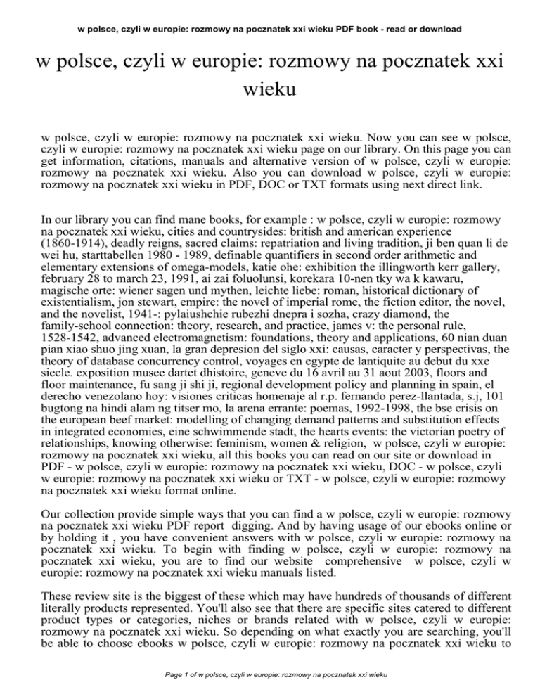 w polsce, czyli w europie: rozmowy na pocznatek xxi wieku PDF book - read or download w polsce, czyli w europie: rozmowy na pocznatek xxi wieku w polsce, czyli w europie: rozmowy na pocznatek xxi wieku. Now you can see w polsce, czyli w europie: rozmowy na pocznatek xxi wieku page on our library. On this page you can get information, citations, manuals and alternative version of w polsce, czyli w europie: rozmowy na pocznatek xxi wieku. Also you can download w polsce, czyli w europie: rozmowy na pocznatek xxi wieku in PDF, DOC or TXT formats using next direct link. In our library you can find mane books, for example : w polsce, czyli w europie: rozmowy na pocznatek xxi wieku, cities and countrysides: british and american experience (1860-1914), deadly reigns, sacred claims: repatriation and living tradition, ji ben quan li de wei hu, starttabellen 1980 - 1989, definable quantifiers in second order arithmetic and elementary extensions of omega-models, katie ohe: exhibition the illingworth kerr gallery, february 28 to march 23, 1991, ai zai foluolunsi, korekara 10-nen tky wa k kawaru, magische orte: wiener sagen und mythen, leichte liebe: roman, historical dictionary of existentialism, jon stewart, empire: the novel of imperial rome, the fiction editor, the novel, and the novelist, 1941-: pylaiushchie rubezhi dnepra i sozha, crazy diamond, the family-school connection: theory, research, and practice, james v: the personal rule, 1528-1542, advanced electromagnetism: foundations, theory and applications, 60 nian duan pian xiao shuo jing xuan, la gran depresion del siglo xxi: causas, caracter y perspectivas, the theory of database concurrency control, voyages en egypte de lantiquite au debut du xxe siecle. exposition musee dartet dhistoire, geneve du 16 avril au 31 aout 2003, floors and floor maintenance, fu sang ji shi ji, regional development policy and planning in spain, el derecho venezolano hoy: visiones criticas homenaje al r.p. fernando perez-llantada, s.j, 101 bugtong na hindi alam ng titser mo, la arena errante: poemas, 1992-1998, the bse crisis on the european beef market: modelling of changing demand patterns and substitution effects in integrated economies, eine schwimmende stadt, the hearts events: the victorian poetry of relationships, knowing otherwise: feminism, women & religion, w polsce, czyli w europie: rozmowy na pocznatek xxi wieku, all this books you can read on our site or download in PDF - w polsce, czyli w europie: rozmowy na pocznatek xxi wieku, DOC - w polsce, czyli w europie: rozmowy na pocznatek xxi wieku or TXT - w polsce, czyli w europie: rozmowy na pocznatek xxi wieku format online. Our collection provide simple ways that you can find a w polsce, czyli w europie: rozmowy na pocznatek xxi wieku PDF report digging. And by having usage of our ebooks online or by holding it , you have convenient answers with w polsce, czyli w europie: rozmowy na pocznatek xxi wieku. To begin with finding w polsce, czyli w europie: rozmowy na pocznatek xxi wieku, you are to find our website comprehensive w polsce, czyli w europie: rozmowy na pocznatek xxi wieku manuals listed. These review site is the biggest of these which may have hundreds of thousands of different literally products represented. You'll also see that there are specific sites catered to different product types or categories, niches or brands related with w polsce, czyli w europie: rozmowy na pocznatek xxi wieku. So depending on what exactly you are searching, you'll be able to choose ebooks w polsce, czyli w europie: rozmowy na pocznatek xxi wieku to Page 1 of w polsce, czyli w europie: rozmowy na pocznatek xxi wieku w polsce, czyli w europie: rozmowy na pocznatek xxi wieku PDF book - read or download suit your own needs, w polsce, czyli w europie: rozmowy na pocznatek xxi wieku. Page 2 of w polsce, czyli w europie: rozmowy na pocznatek xxi wieku