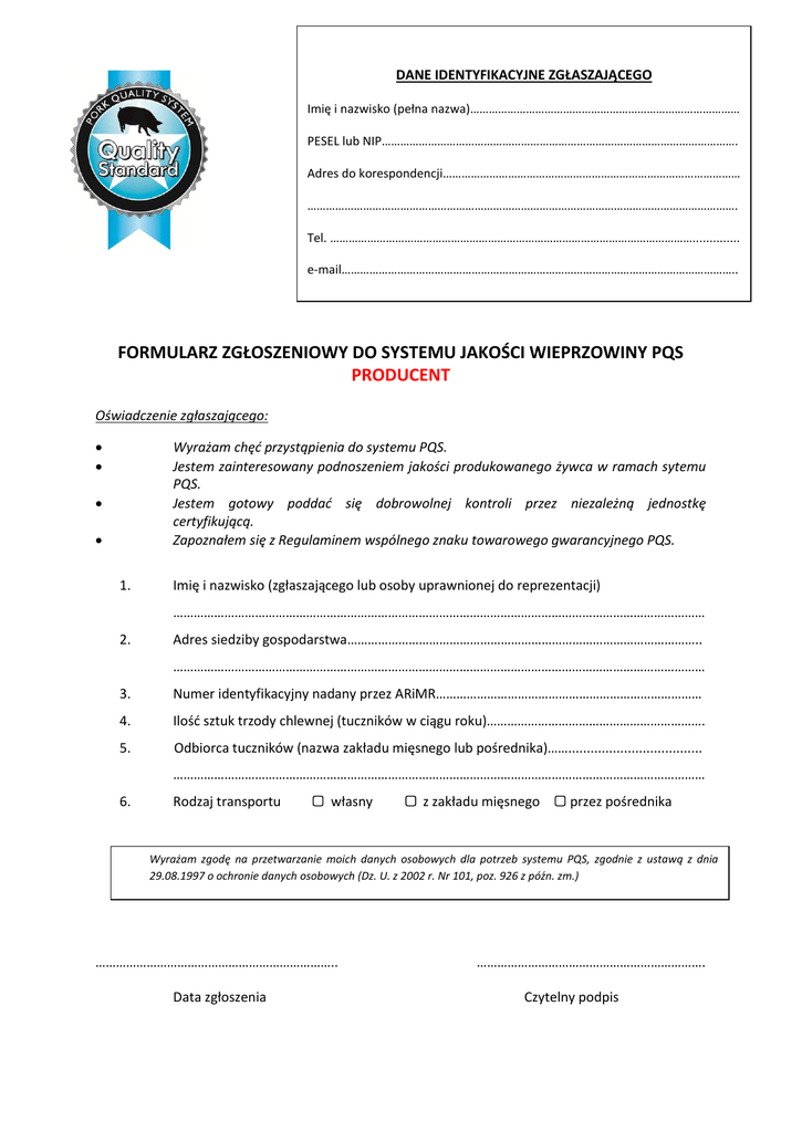 formularz zgłoszeniowy do systemu jakości wieprzowiny