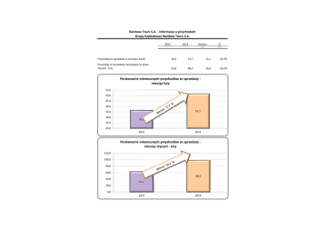 Rainbow Tours S.A. - Informacja o przychodach Grupy Kapitałowej Rainbow Tours S.A. 2013 2014 Zmiana % 1 2 3=2-1 4=3/1 Przychody ze sprzedaży w miesiącu lutym 36,6 51,7 15,1 41,3% Przychody ze sprzedaży narastająco za okres styczeń - luty 63,8 98,4 34,6 54,2% Porównanie miesiecznych przychodów ze sprzedaży miesiąc luty 55,0 50,0 45,0 40,0 51,7 35,0 30,0 36,6 25,0 20,0 2013 2014 Porównanie miesiecznych przychodów ze sprzedaży miesiąc styczeń - luty 120,0 100,0 80,0 60,0 98,4 40,0 63,8 20,0 0,0 2013 2014
